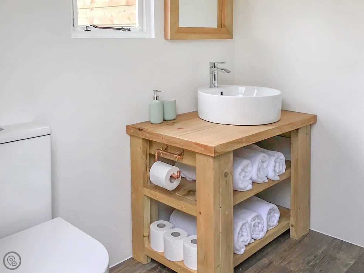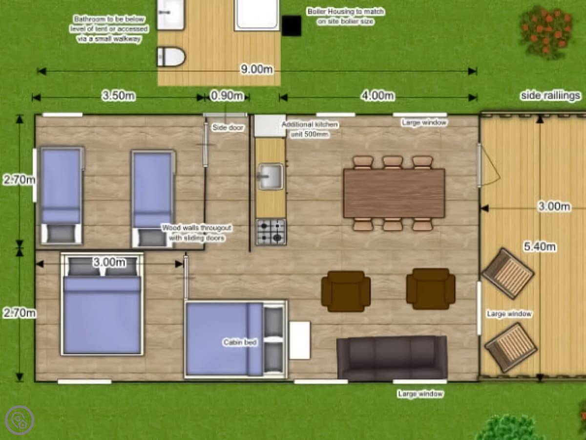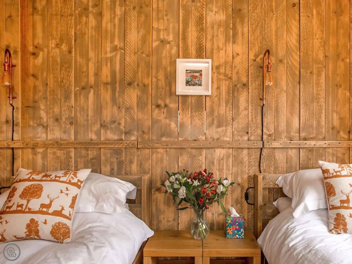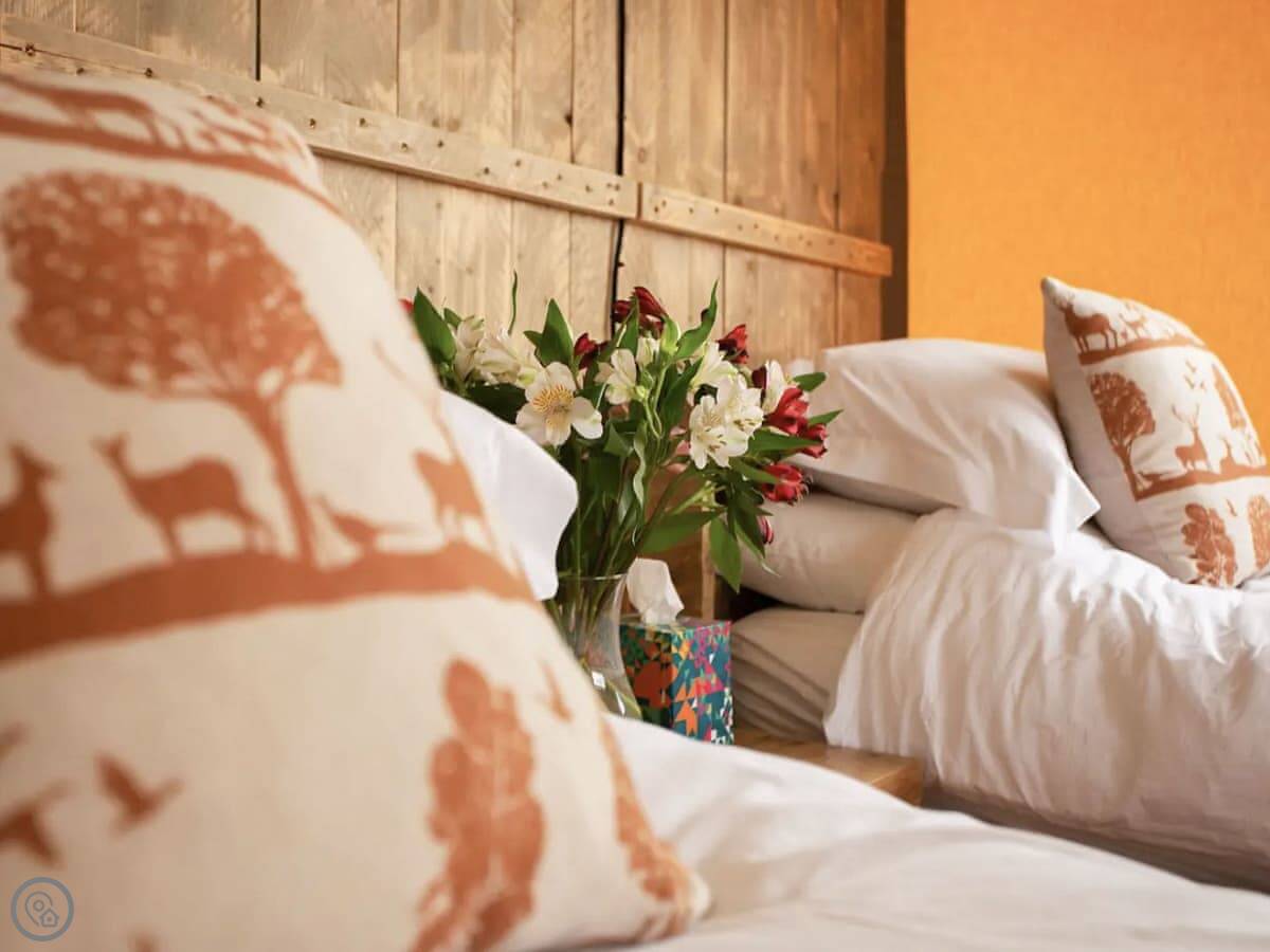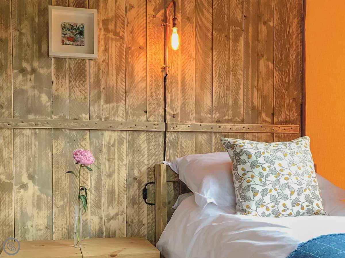 There are four of these lodges in a field. You get your own one. It sleeps six. Three bedrooms, one bathroom. It's got a 4 Star rating, which means it's well-equipped and comfortable. It's all open plan inside, with a wood burner. The main bed has a fancy headboard. There's a proper shower, not just a camping one.
