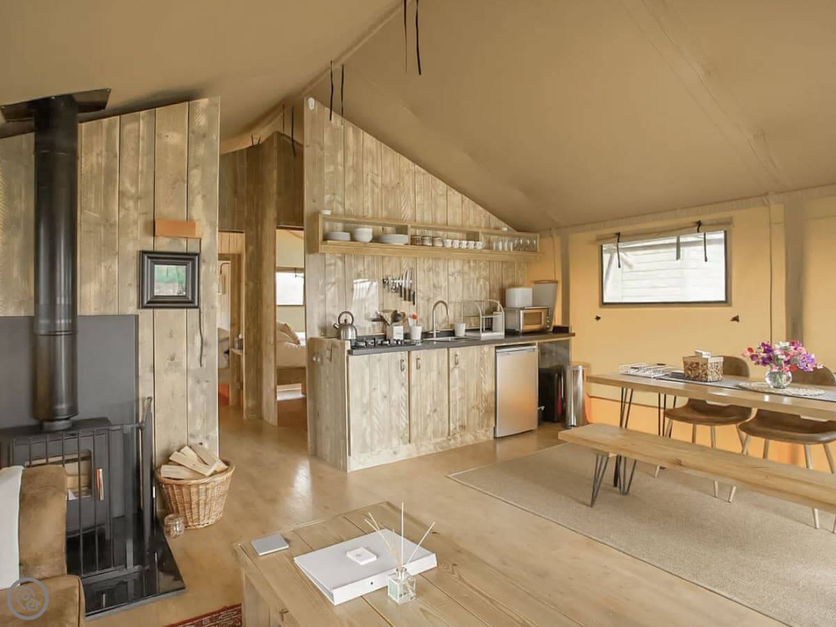 The lodge sleeps six. There are three bedrooms and one bathroom. It's got a 4 Star rating. It's a glamping setup, so it's a proper building but designed to feel like you're closer to being outside. The whole front is glass, with doors that open onto a private wooden veranda. There's a log burner inside and a cast iron BBQ outside.
