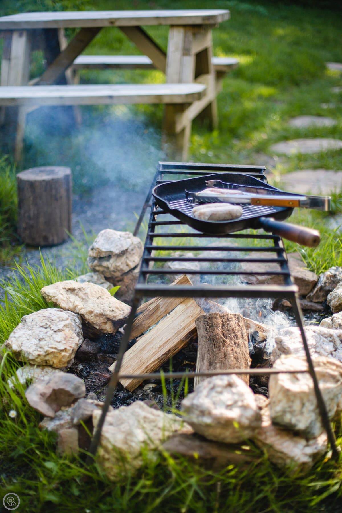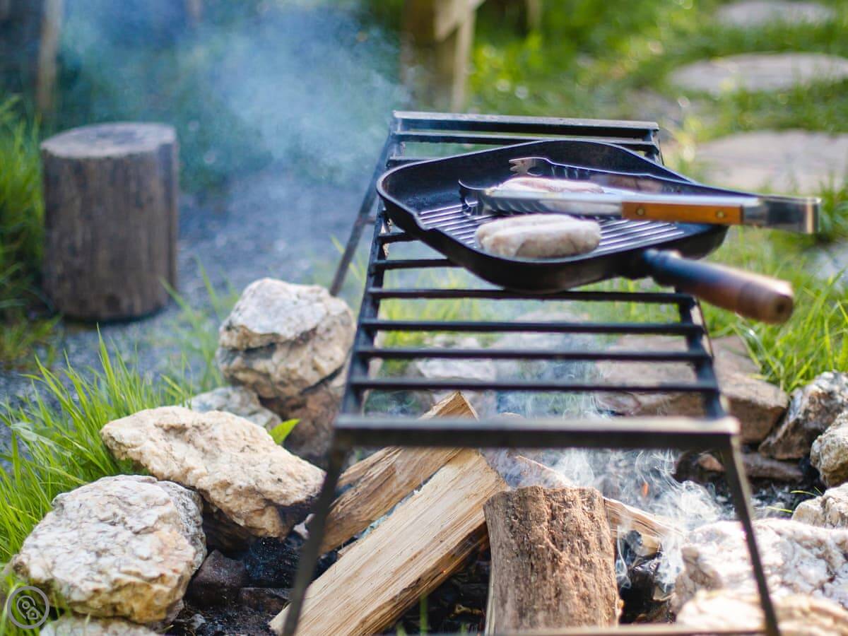 Inside, it's decorated with Native American patterns. There's a wood-burning stove in the middle and we give you logs for it. That keeps it warm. There's a little kitchen area outside the tipi with a gas stove for cooking.
