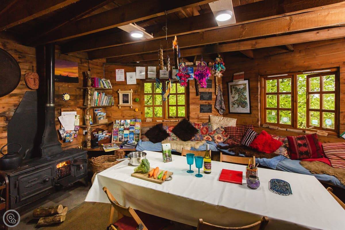 Outside, there's a fire pit for your use. The site has gardens and woodland to walk around. There's a play area for children and a big log cabin you can use if you want to eat with a bigger group.