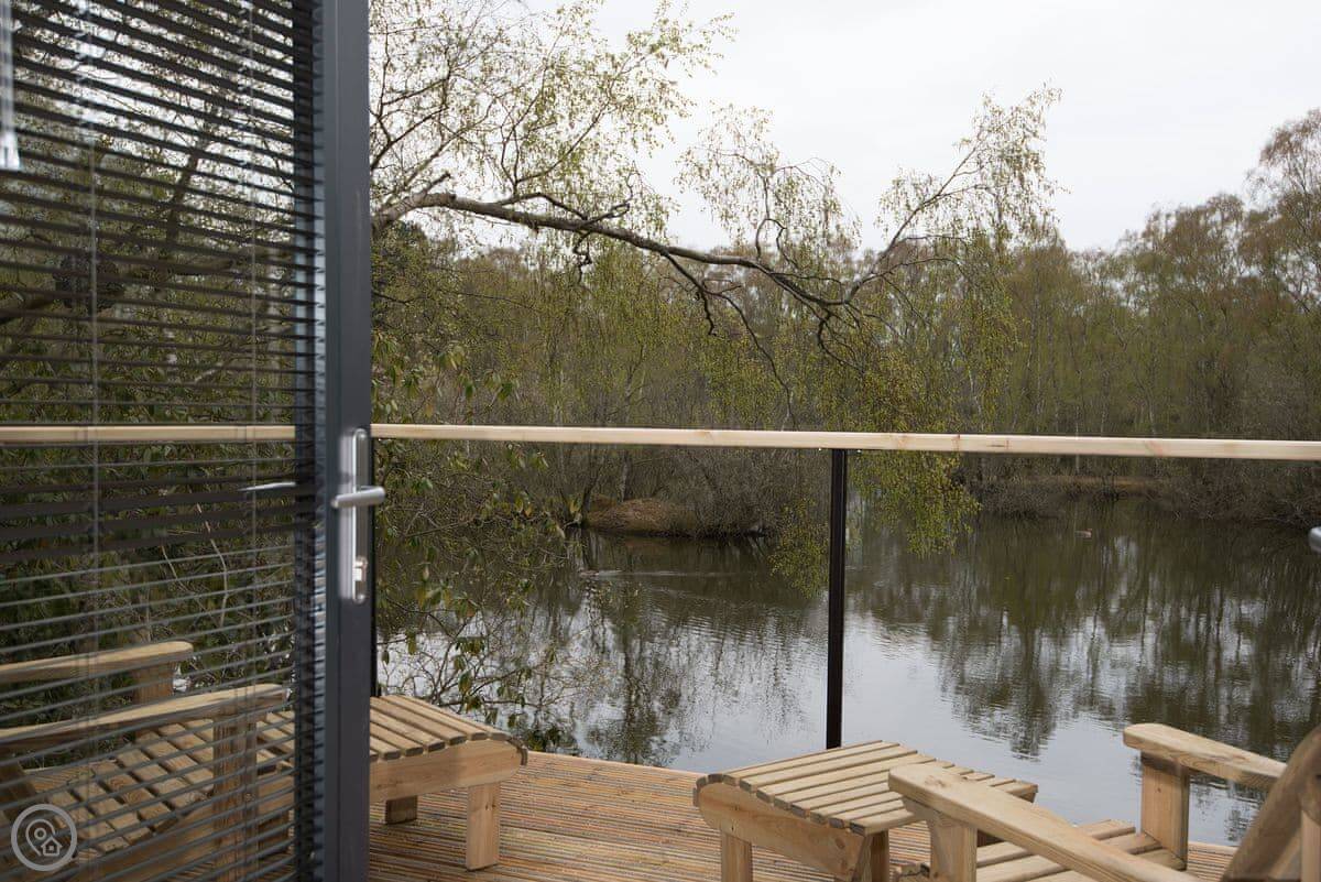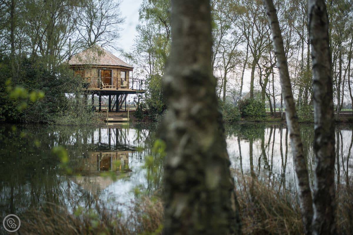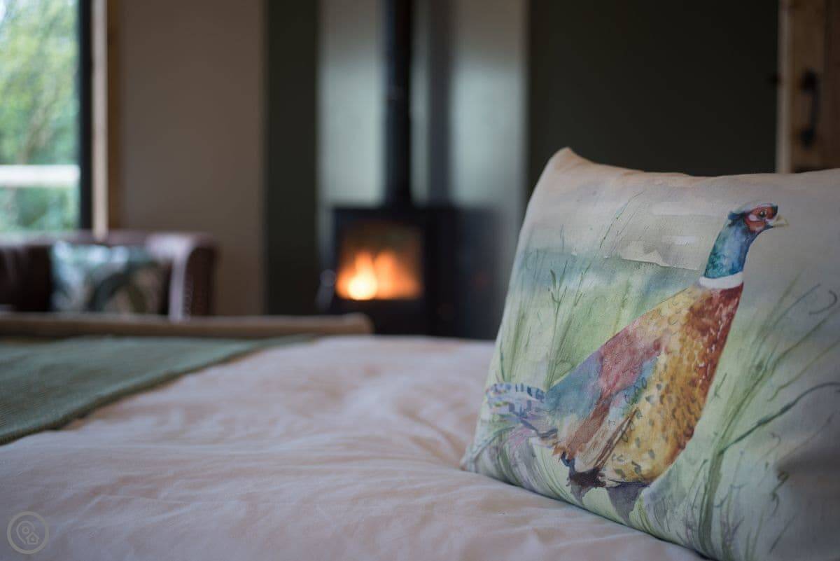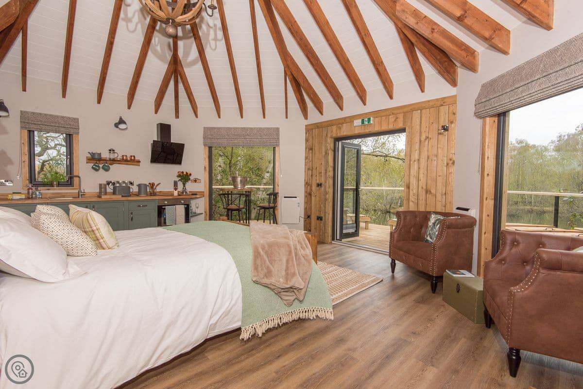 Whether you’re looking for an adventure, a relaxing break or simply to wind down in nature, Pheasant’s Roost invites you to experience it all here, on the edge of the Lincolnshire Wolds. No matter what season it is if you’re looking for tranquillity and a time for reflection, you’ll find just what you need at this unique bolthole for two. Your home in the trees offers the ultimate return to nature; one of five eco-chic structures built around private, secluded lakes on the edge of Lincolnshire’s attractive village, Woodhall Spa. The thoughtfully designed interiors combine rustic with contemporary offering a calm, comfortable self-catering experience. The colour schemes in Pheasant’s Roost vary from shades of blue, through to browns, greens and greys and flashes of purple and red, as in its names sakes plumes. Big picture windows in the lounge let the light flood in and the views over the lake are truly tranquil.