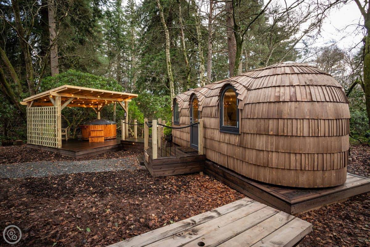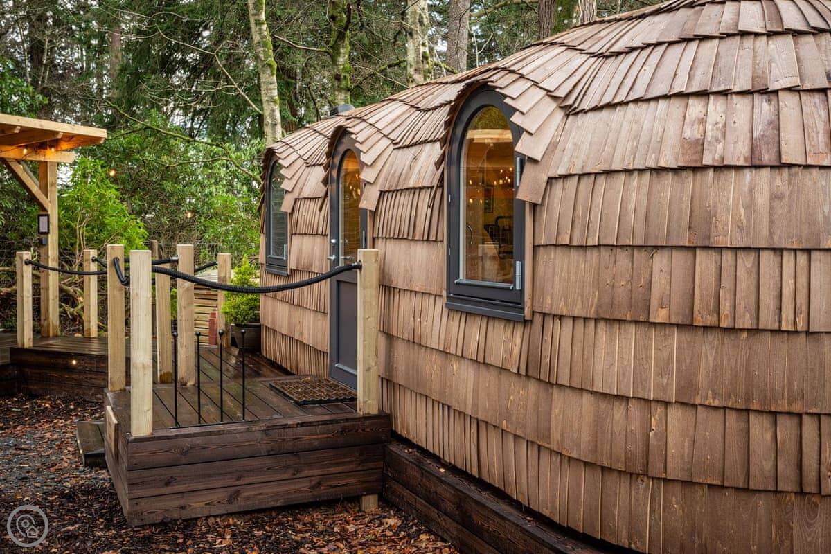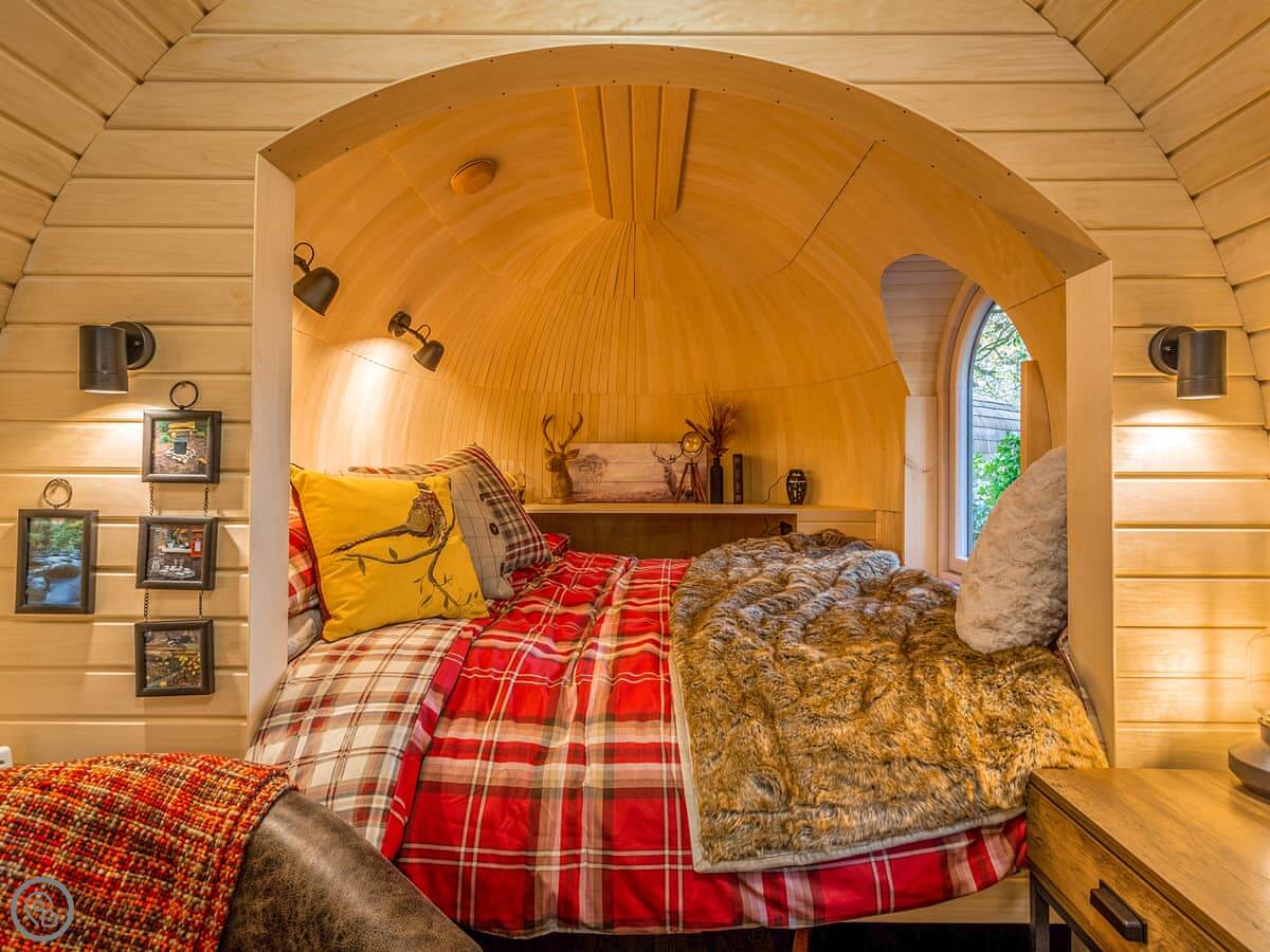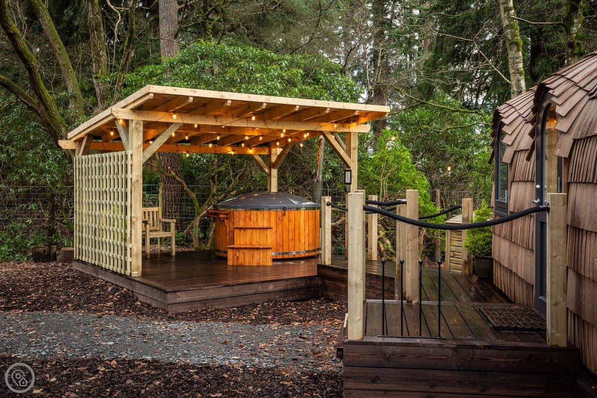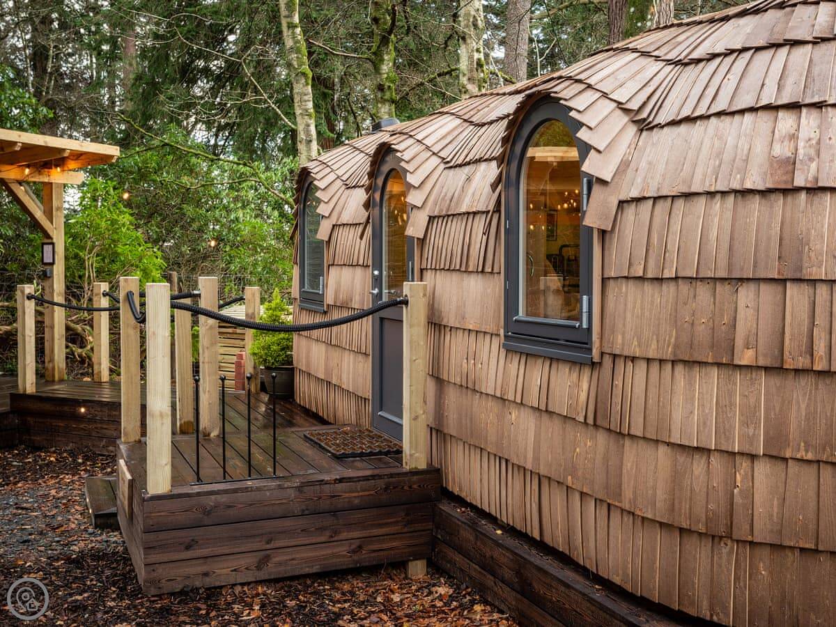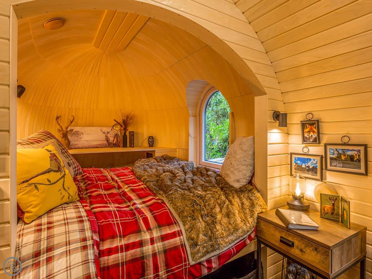 Romantic, adults-only glamping getaway where the fairy tale magic is all yours. The excitement starts as you arrive and make your way along the winding pathways, into the trees to your get to your lovely cabin. Designed to blend into its woodland surroundings, this little cocoon of insulated luxury is the epitome of effortless luxury glamping. The surrounding forest is a living and breathing environment teeming with wildlife and birdlife. If you sit quietly, you may be lucky enough to watch wild deer and pheasants roaming around the site, so keep your cameras at the ready, but this is their home, and any loud noises may startle them! The owners have designed and furnished the cabin to the highest standards as a tiny luxury home using local artists and craft suppliers. At night the castle is backlit, adding drama to the amazing views across the estate and into the Highlands beyond. This is an eco-friendly abode, and the wood-burning hot tub will be set up in advance for you, all the lighting is low energy, and the water is sourced from a local natural spring. You will find the cabin well equipped, however if you forget anything the small shop on-site will be available to purchase most items you may need. With its hot tub, incredible views, and wonderfully idyllic location, these cabins offer couples a perfect romantic retreat in Scotland.