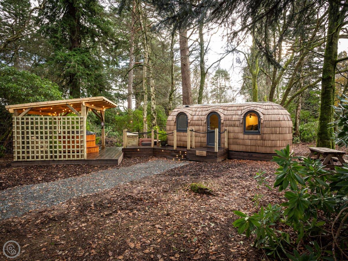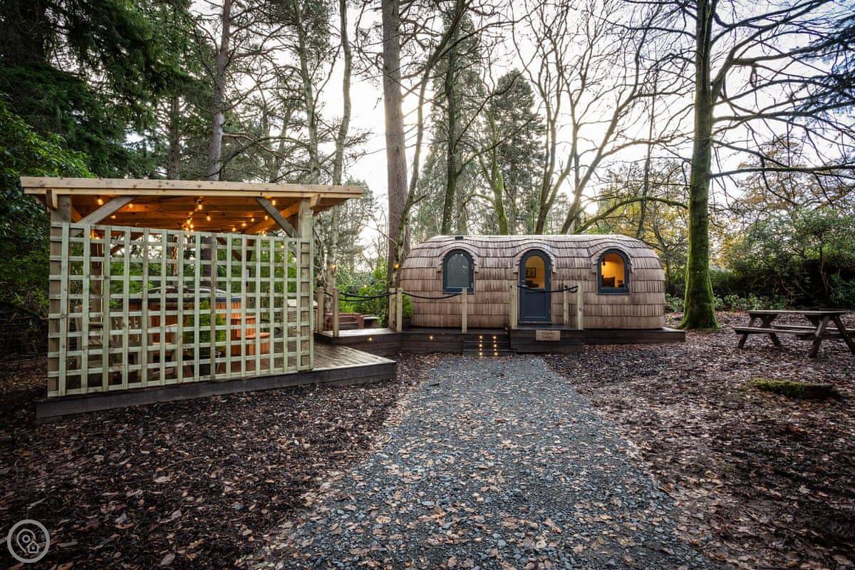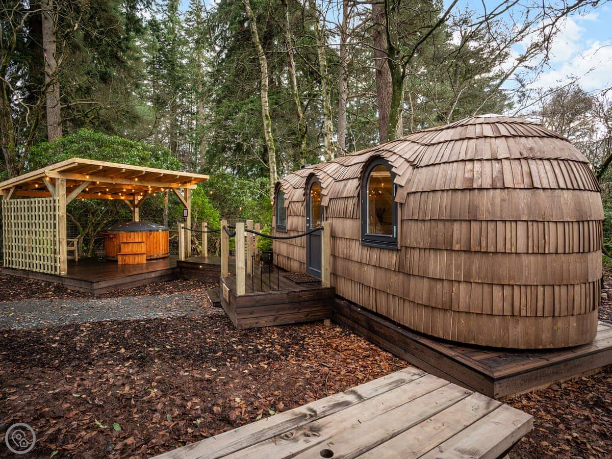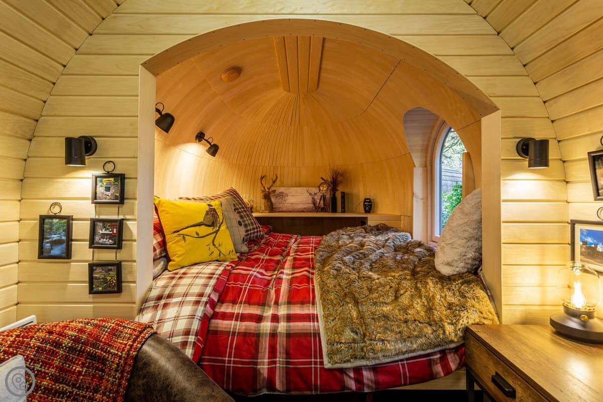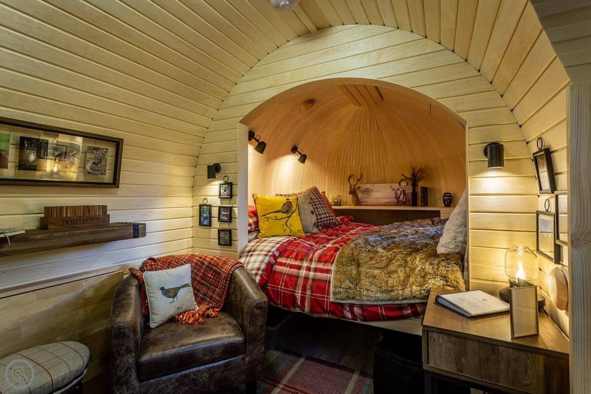 Romantic, adults-only glamping getaway where the fairy tale magic is all yours. The excitement starts as you arrive and make your way along the winding pathways, into the trees to your get to your lovely cabin. Designed to blend into its woodland surroundings, this little cocoon of insulated luxury is the epitome of effortless luxury glamping. The surrounding forest is a living and breathing environment teeming with wildlife and birdlife. If you sit quietly, you may be lucky enough to watch wild deer and pheasants roaming around the site, so keep your cameras at the ready, but this is their home, and any loud noises may startle them! The owners have designed and furnished the cabin to the highest standards as a tiny luxury home using local artists and craft suppliers. At night the castle is backlit, adding drama to the amazing views across the estate and into the Highlands beyond. This is an eco-friendly abode, and the wood-burning hot tub will be set up in advance for you, all the lighting is low energy, and the water is sourced from a local natural spring. You will find the cabin well equipped, however if you forget anything the small shop on-site will be available to purchase most items you may need. With its hot tub, incredible views, and wonderfully idyllic location, these cabins offer couples a perfect romantic retreat in Scotland.