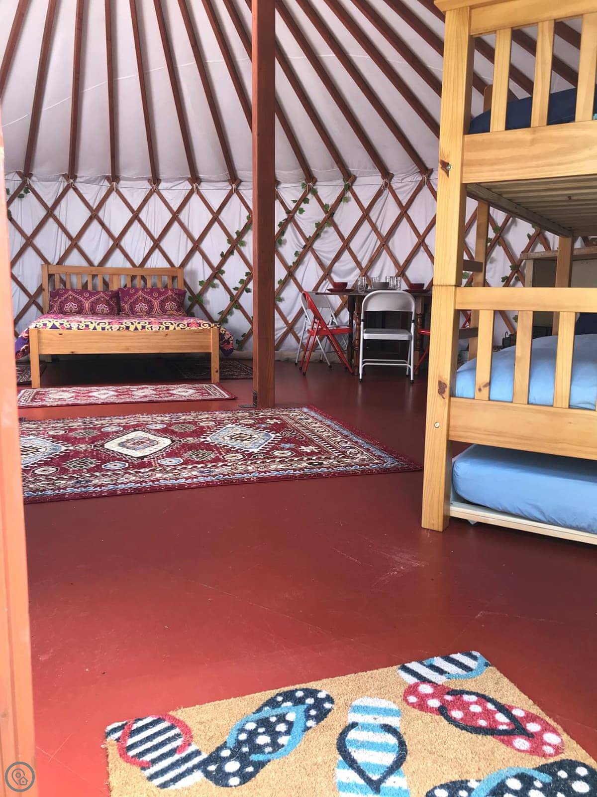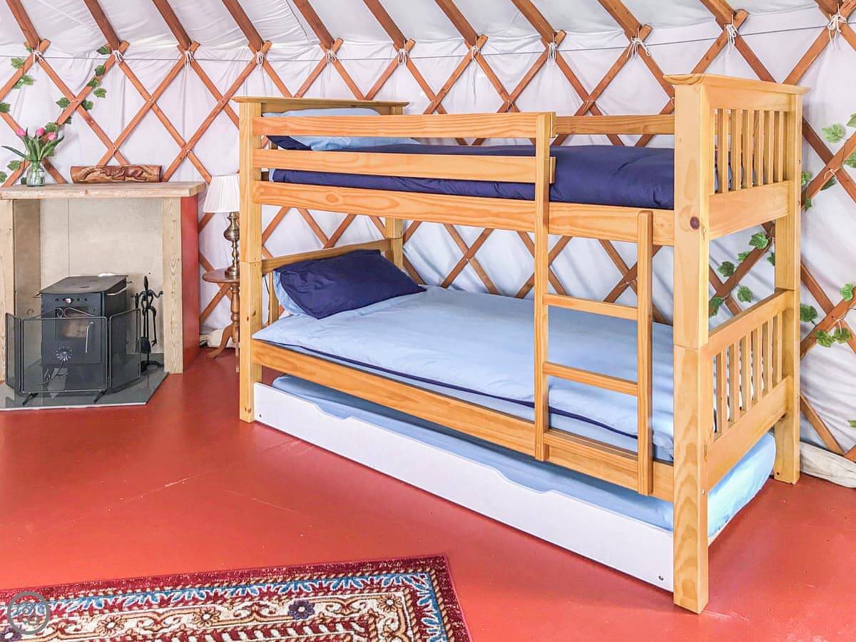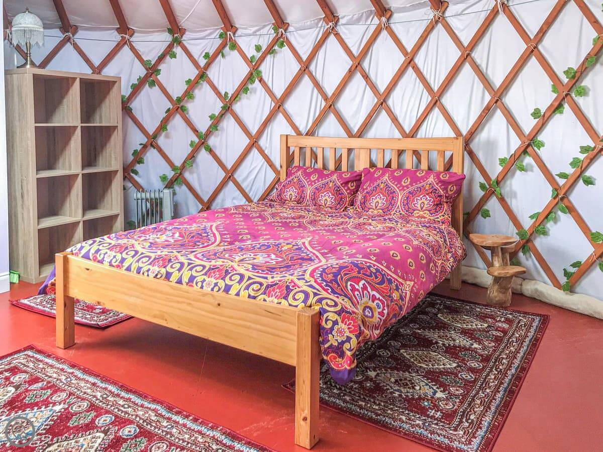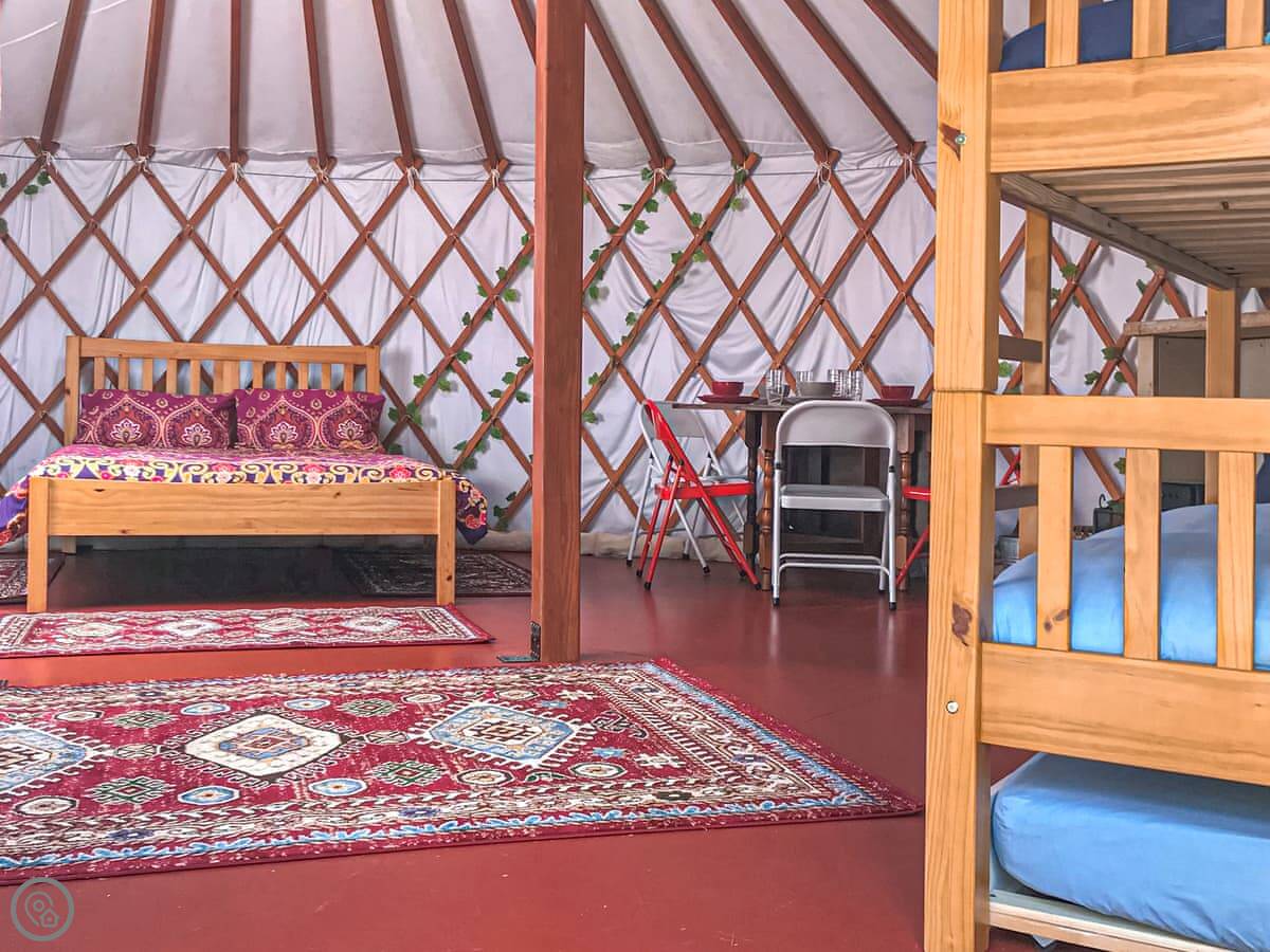 It sleeps five, but that's all in the one room. It's open plan. There's a proper double bed and then some singles. It's got its own little bathroom with a walk-in shower and a small kitchen area. There's a wood burner for heat. It's all newly done up and it's warm. The rating is 3 Star, which fits. It's clean and comfortable but it's still a yurt.