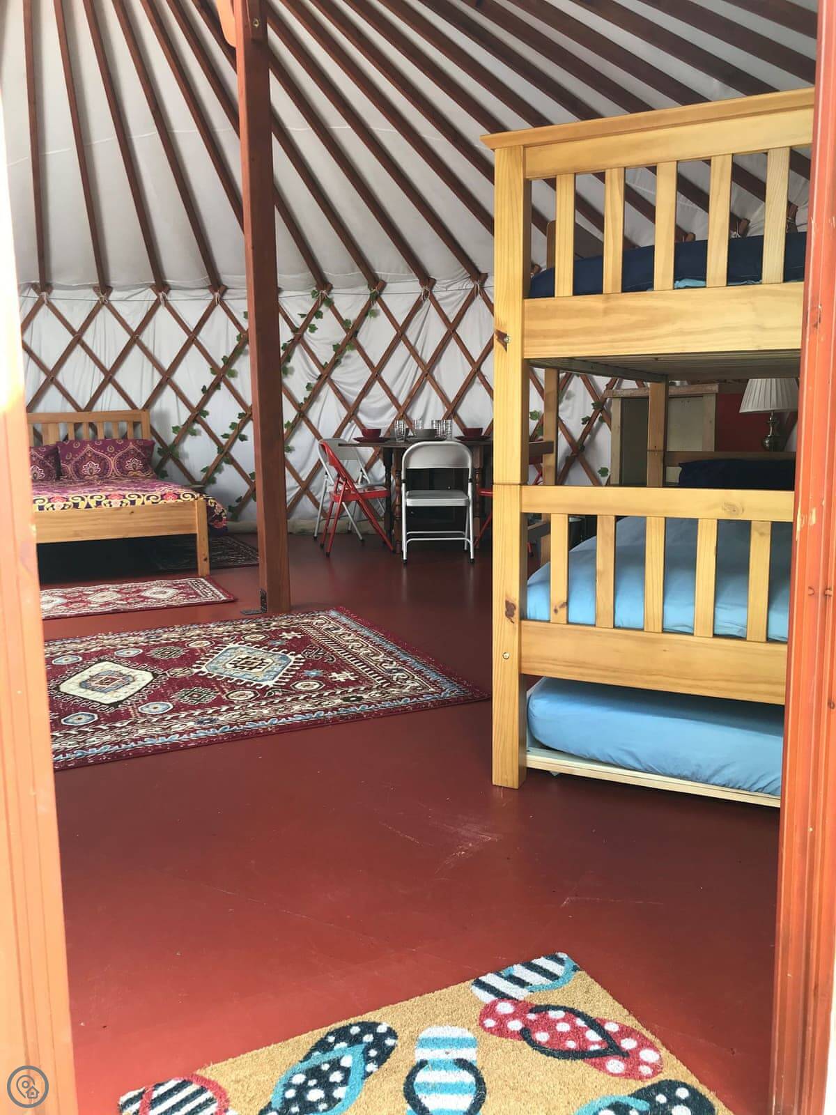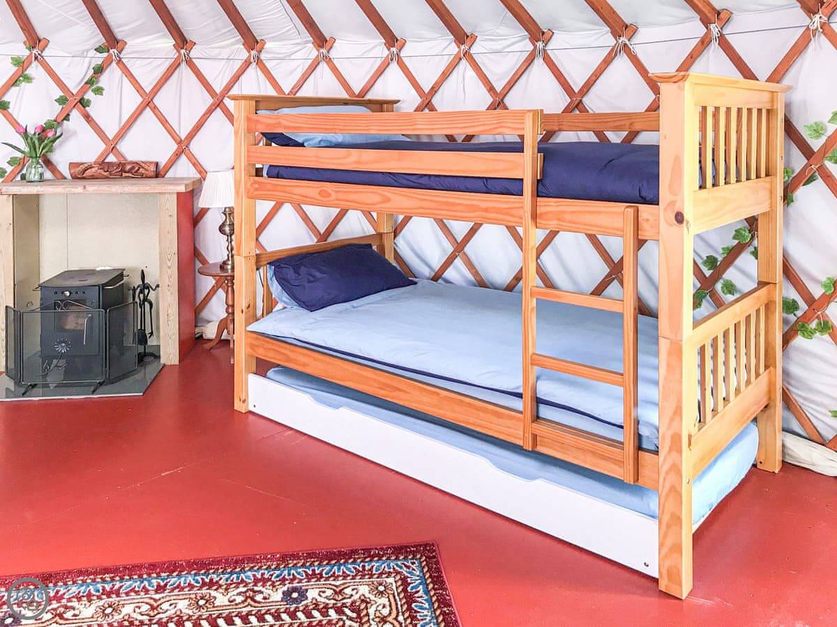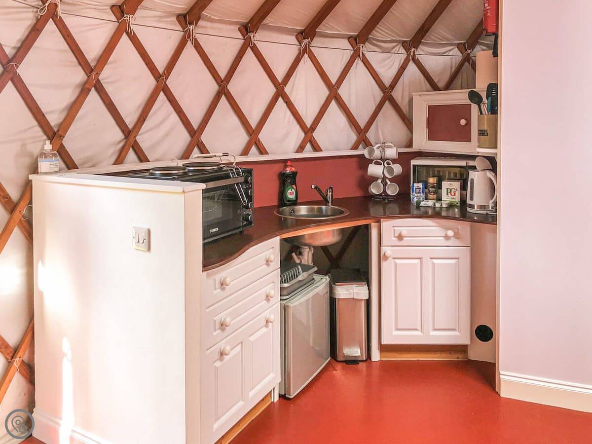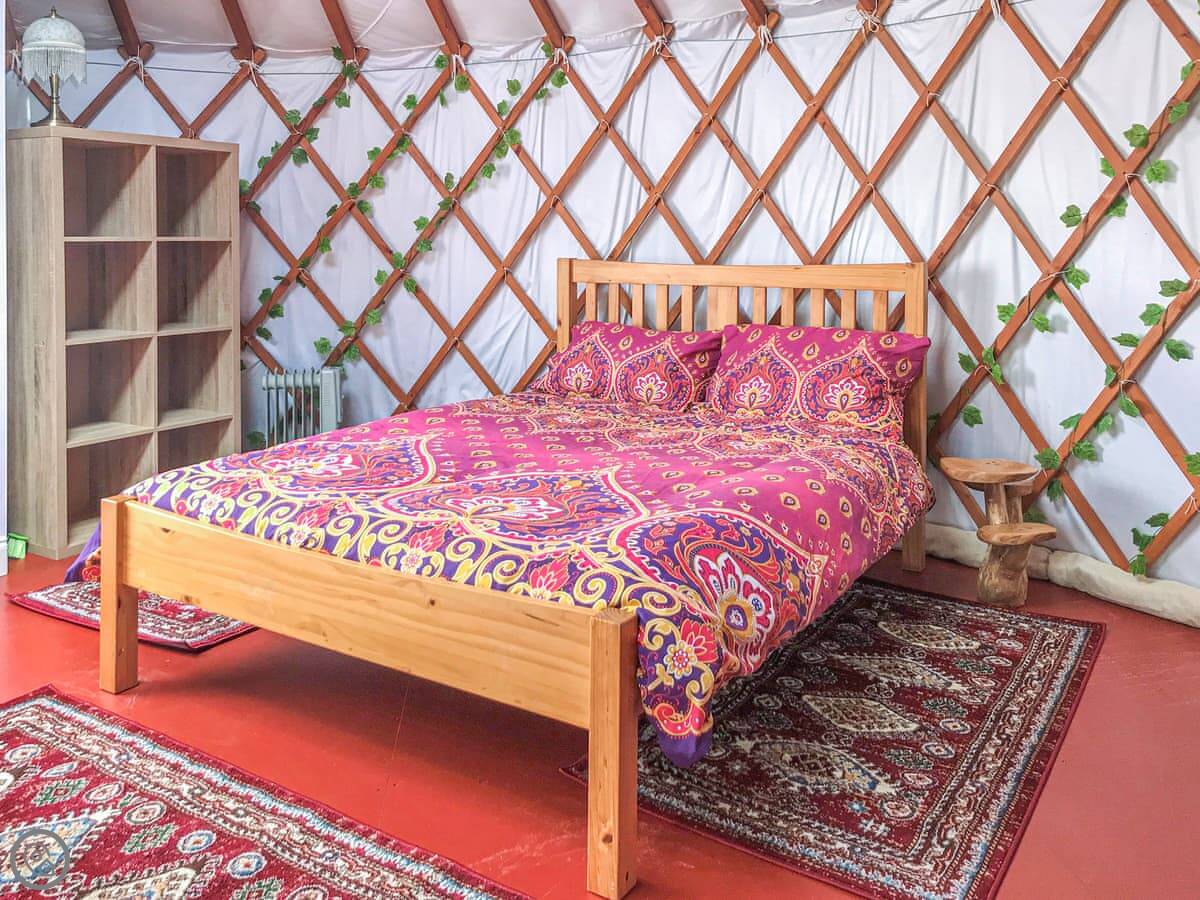 It sleeps five, but that's all in the one room. It's open plan. There's a proper double bed and then some singles. It's got its own little bathroom with a walk-in shower and a small kitchen area. There's a wood burner for heat. It's all newly done up and it's warm. The rating is 3 Star, which fits. It's clean and comfortable but it's still a yurt.