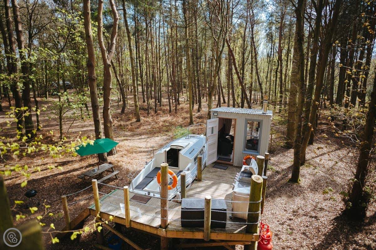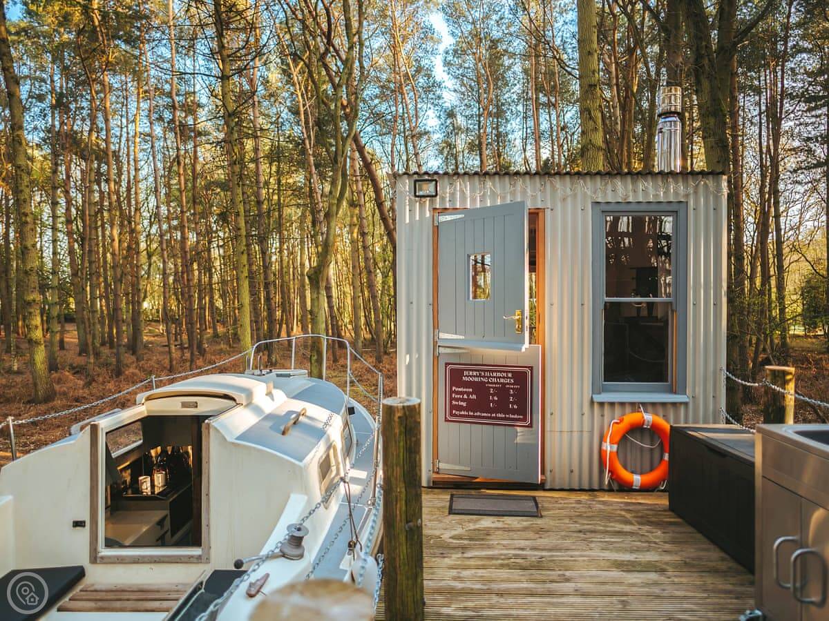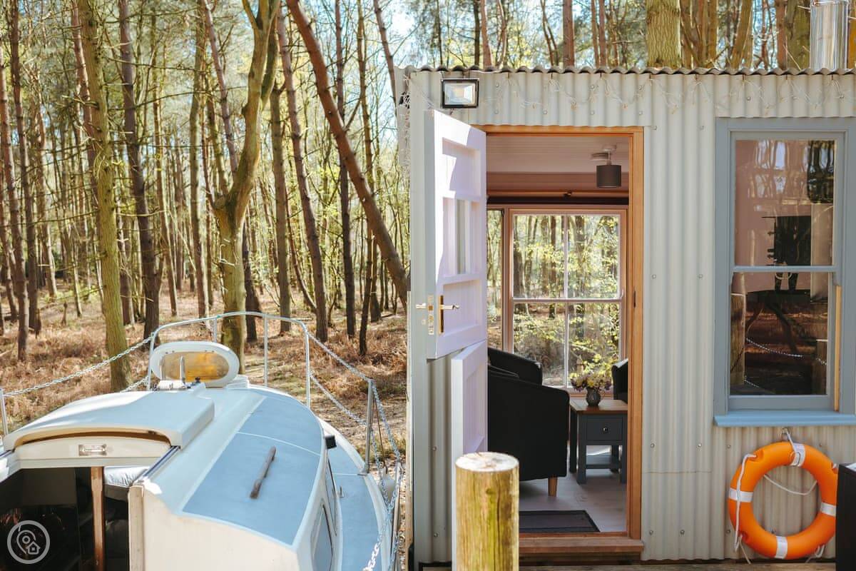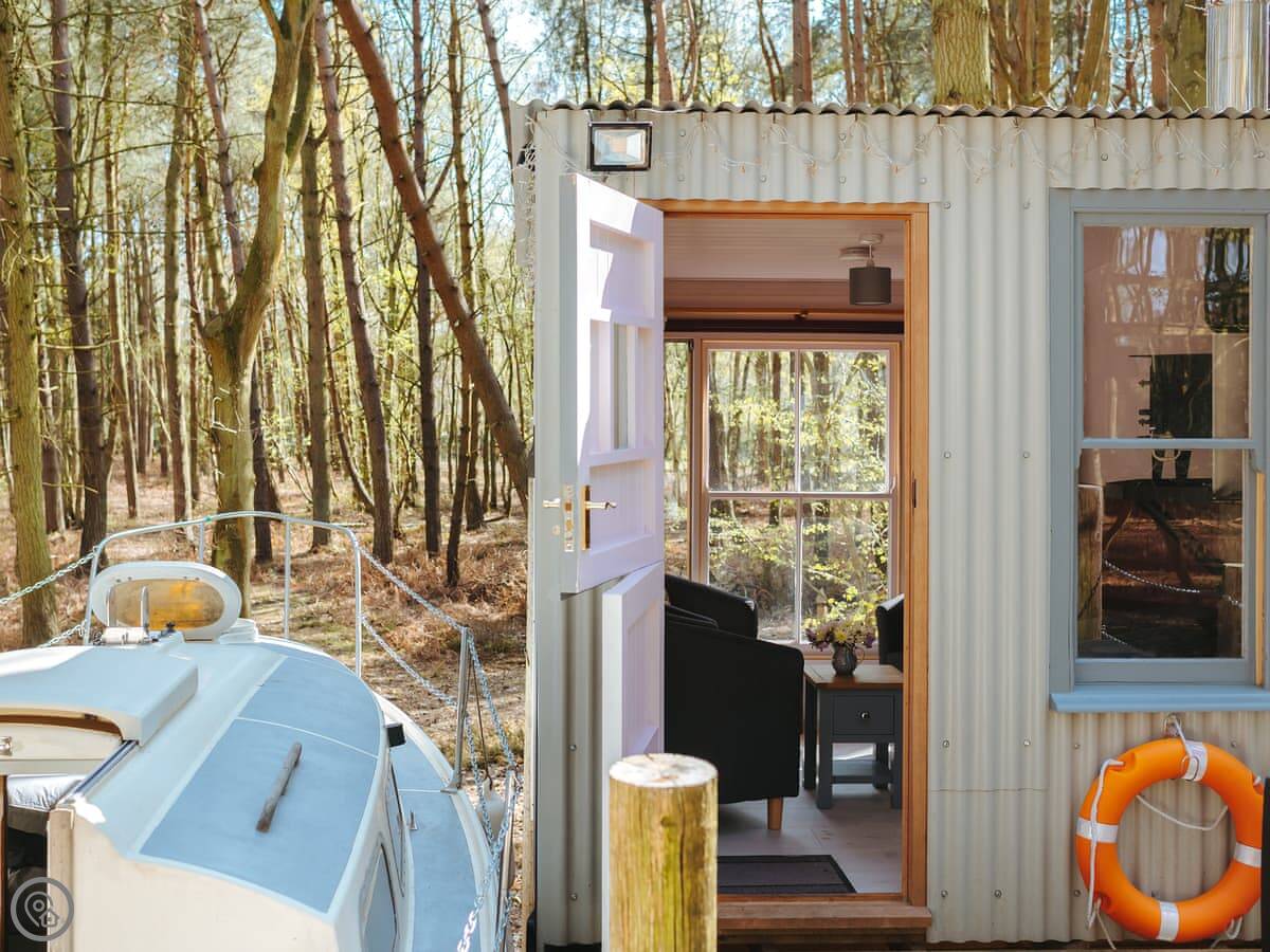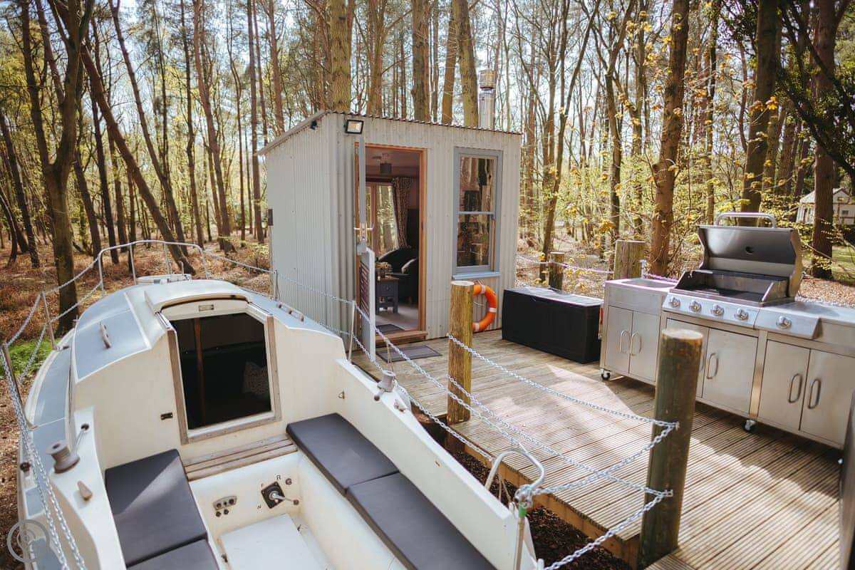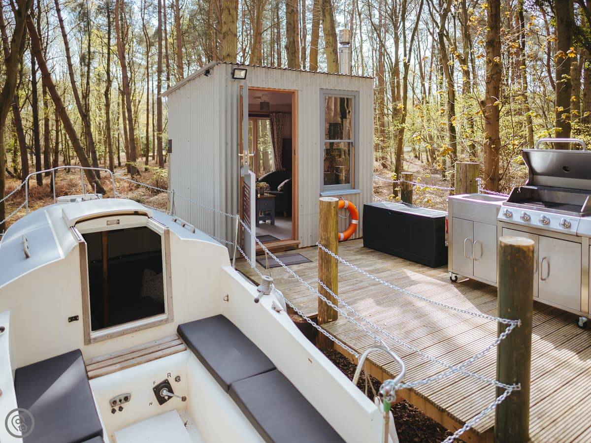 The dayroom has chairs, a table, and a wood burner. It looks out into the woods. The yacht itself is open plan, with a little cooking area and sleeping space for three. It's heated and cooled by a heat pump.