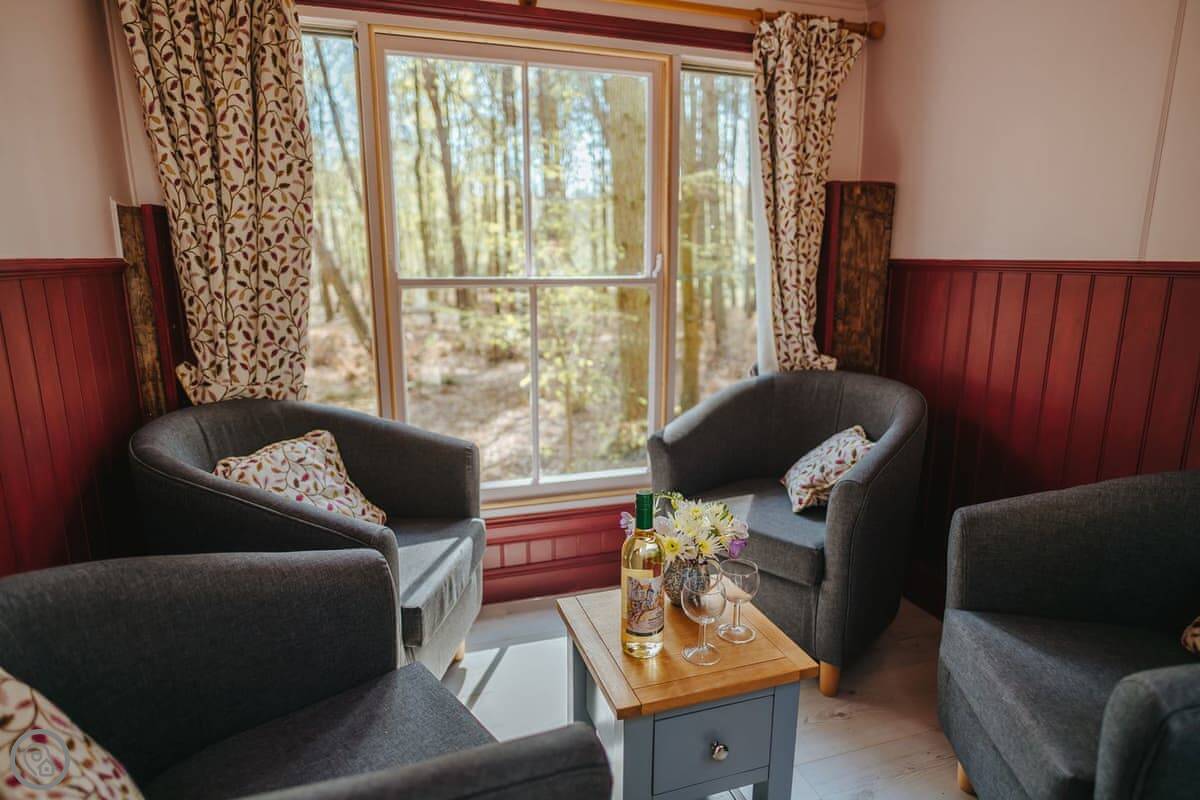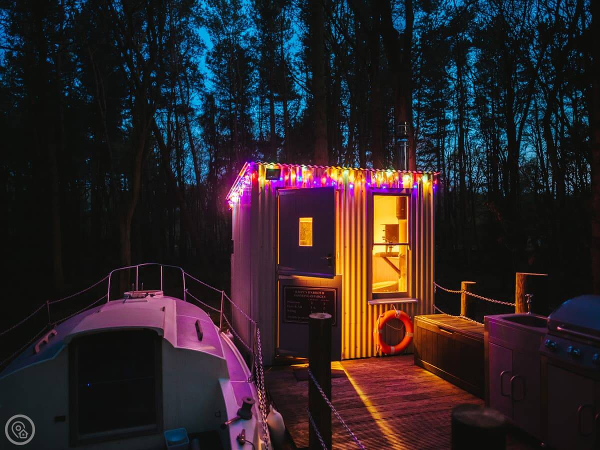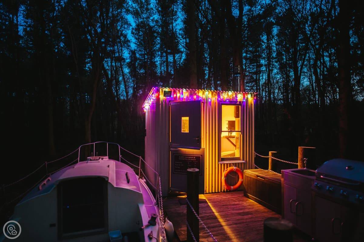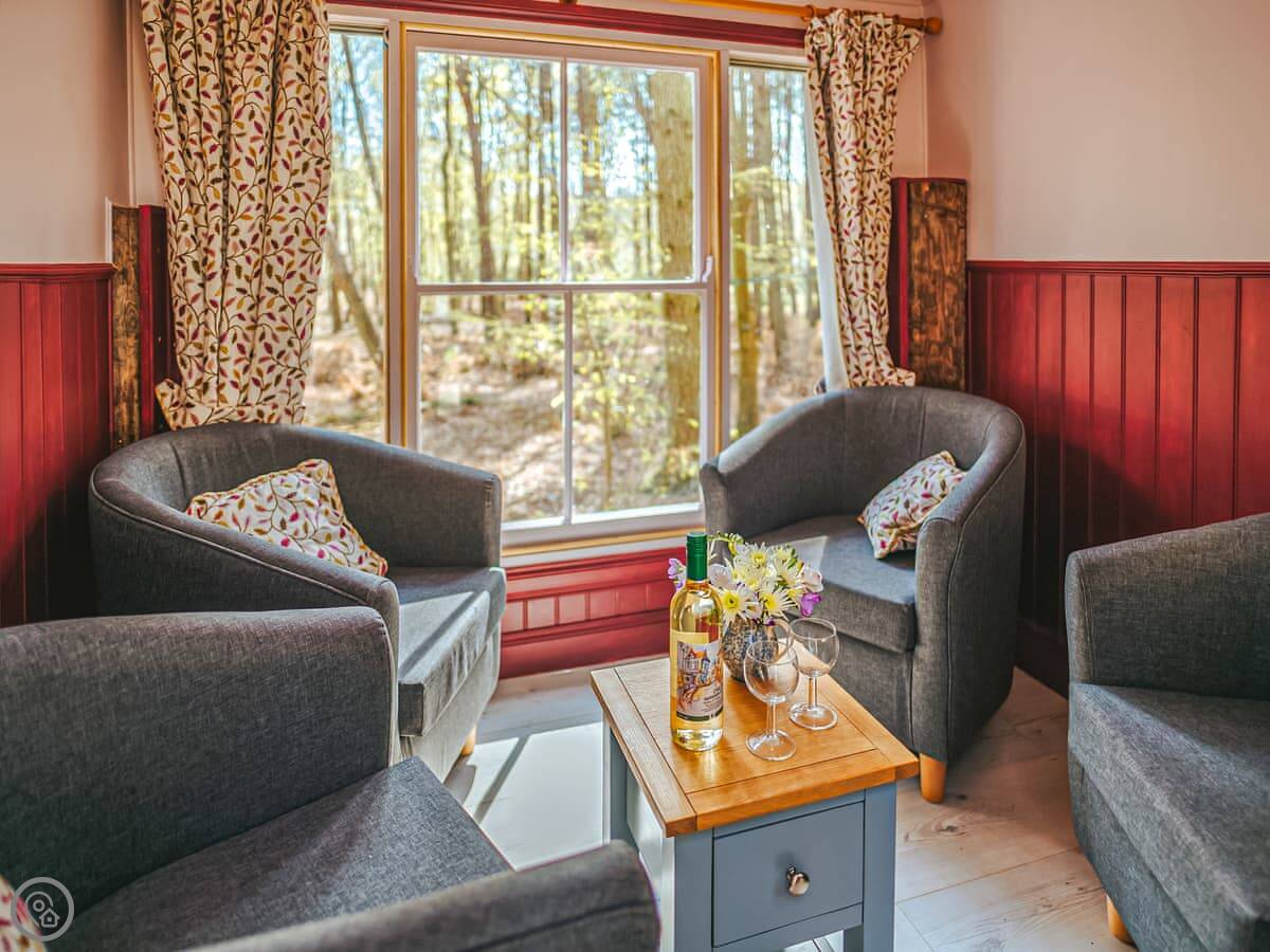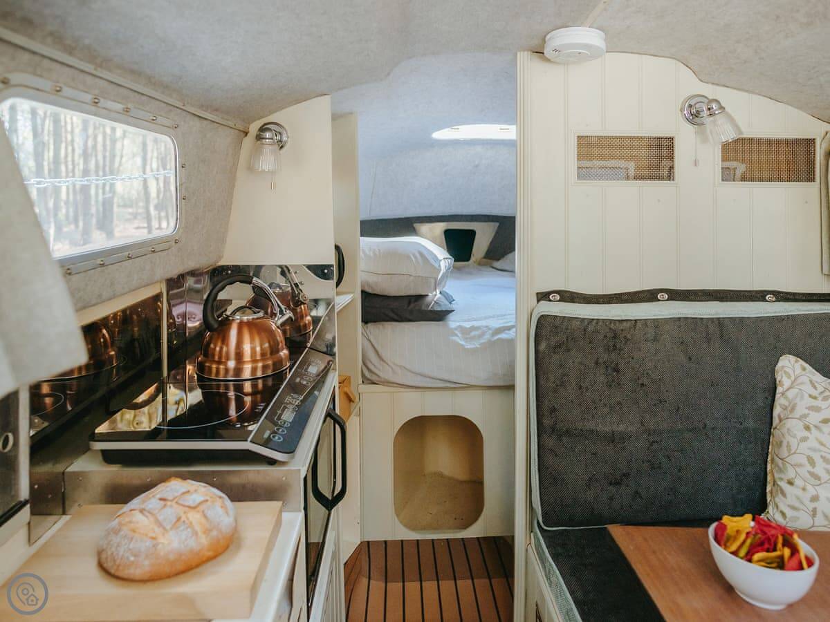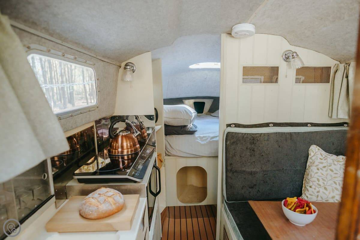 The dayroom has chairs, a table, and a wood burner. It looks out into the woods. The yacht itself is open plan, with a little cooking area and sleeping space for three. It's heated and cooled by a heat pump.