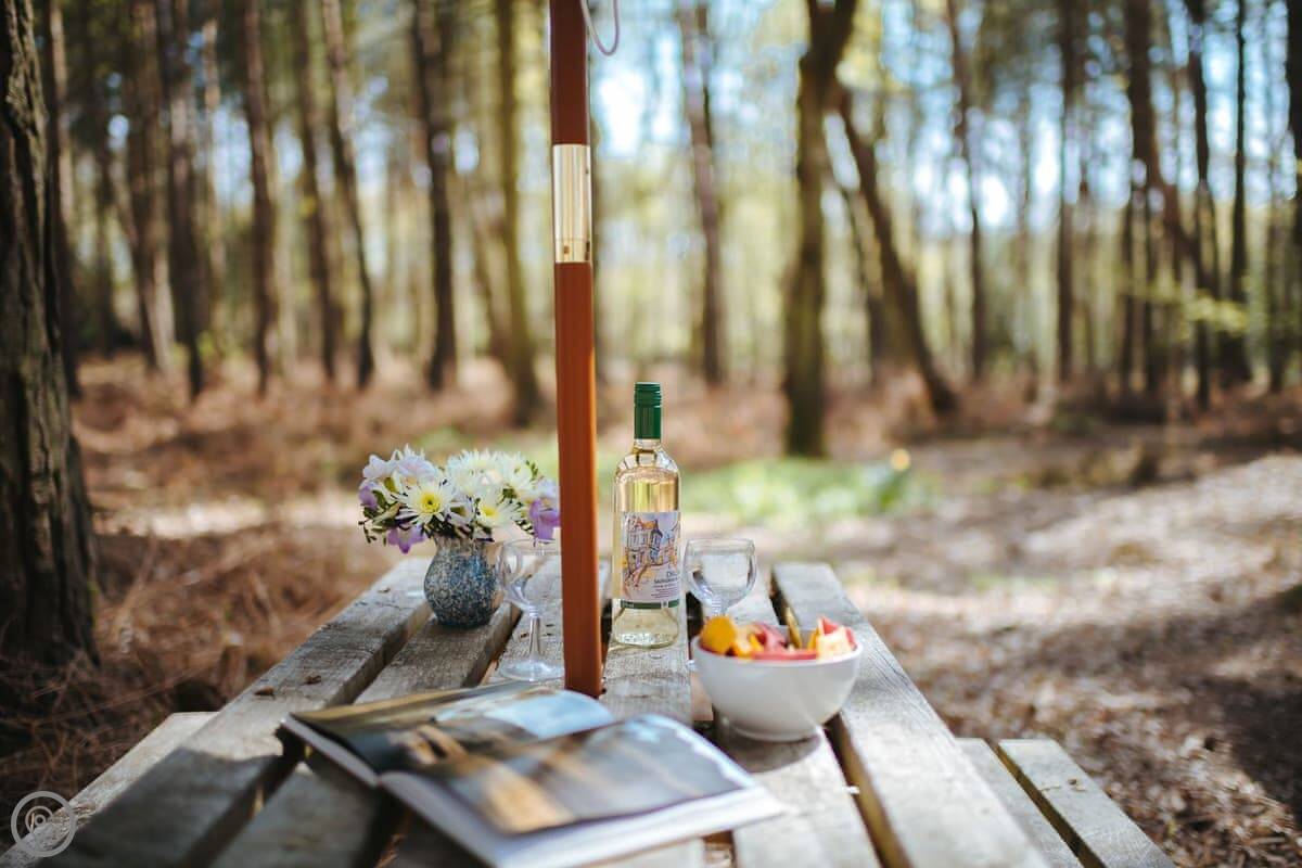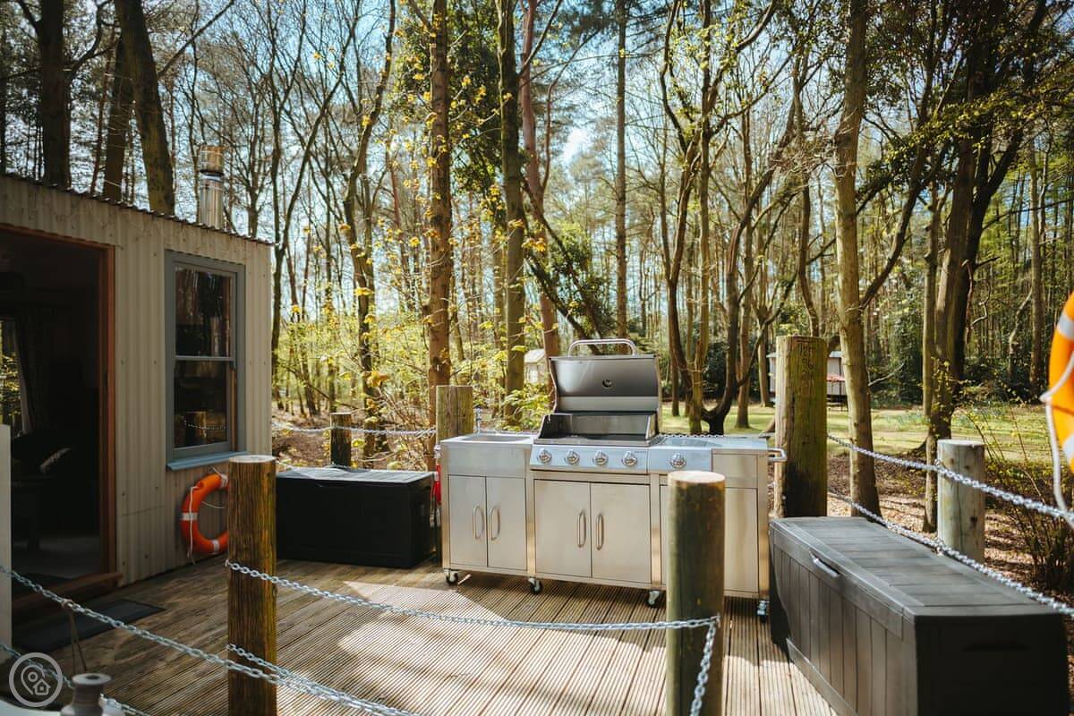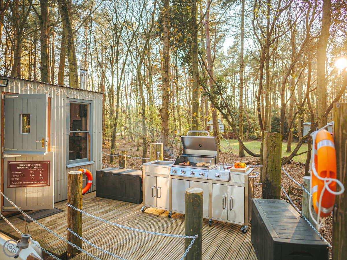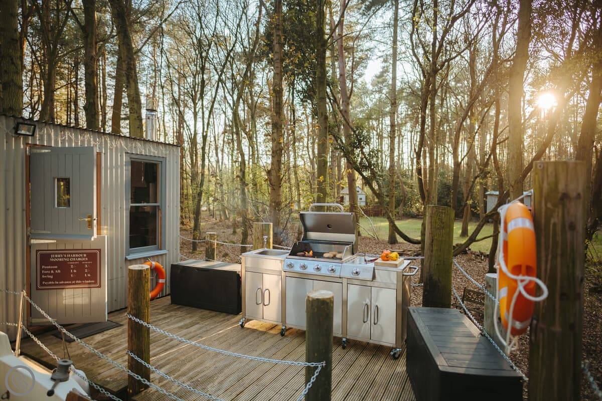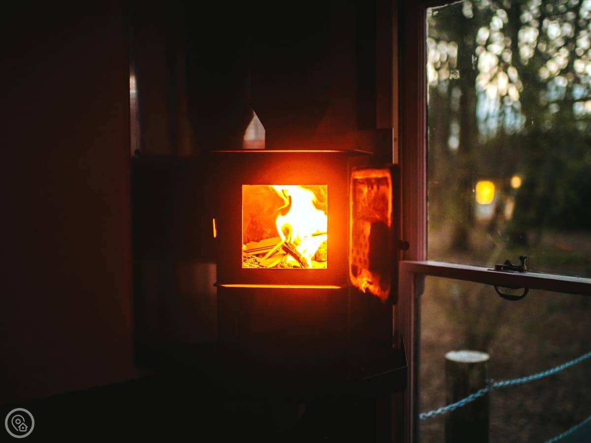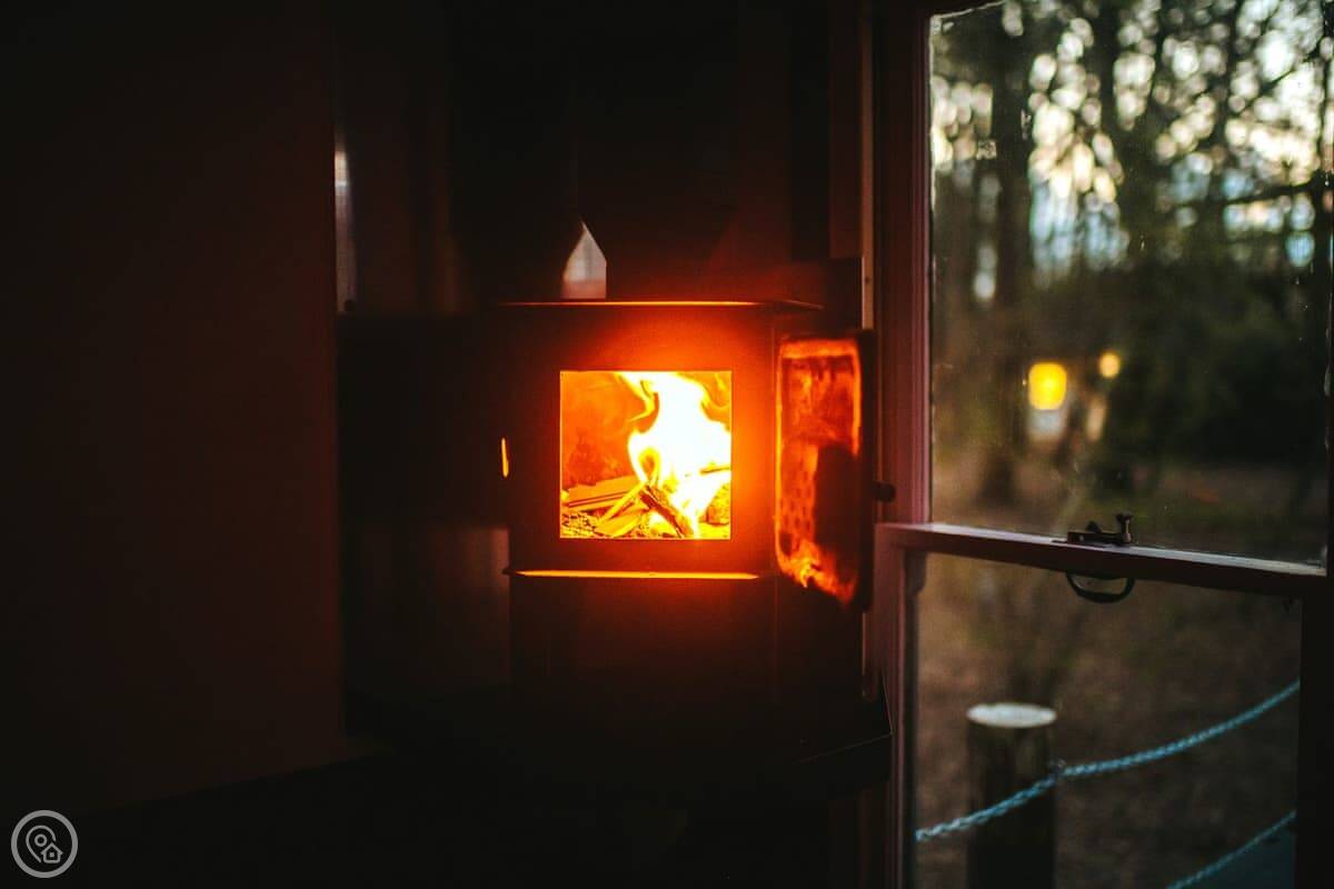 The dayroom has chairs, a table, and a wood burner. It looks out into the woods. The yacht itself is open plan, with a little cooking area and sleeping space for three. It's heated and cooled by a heat pump.