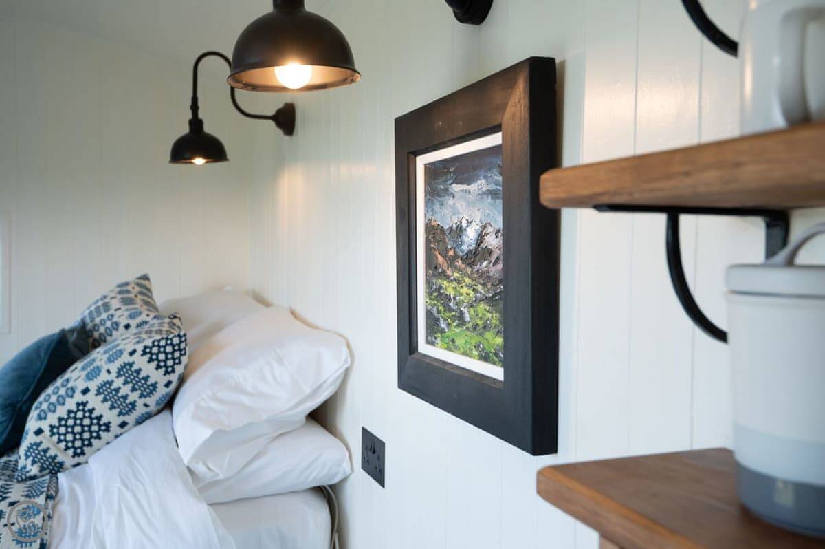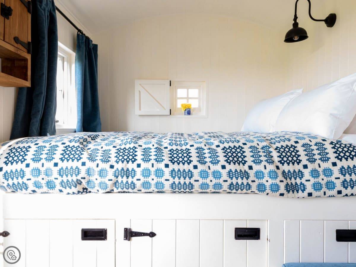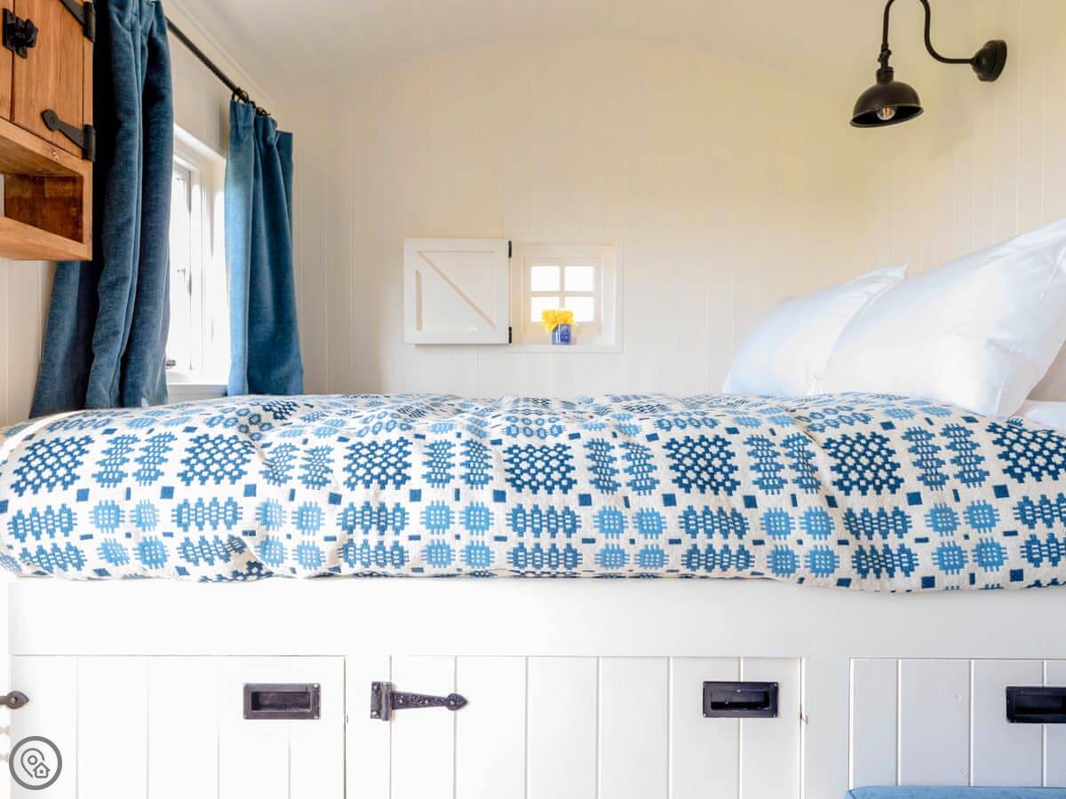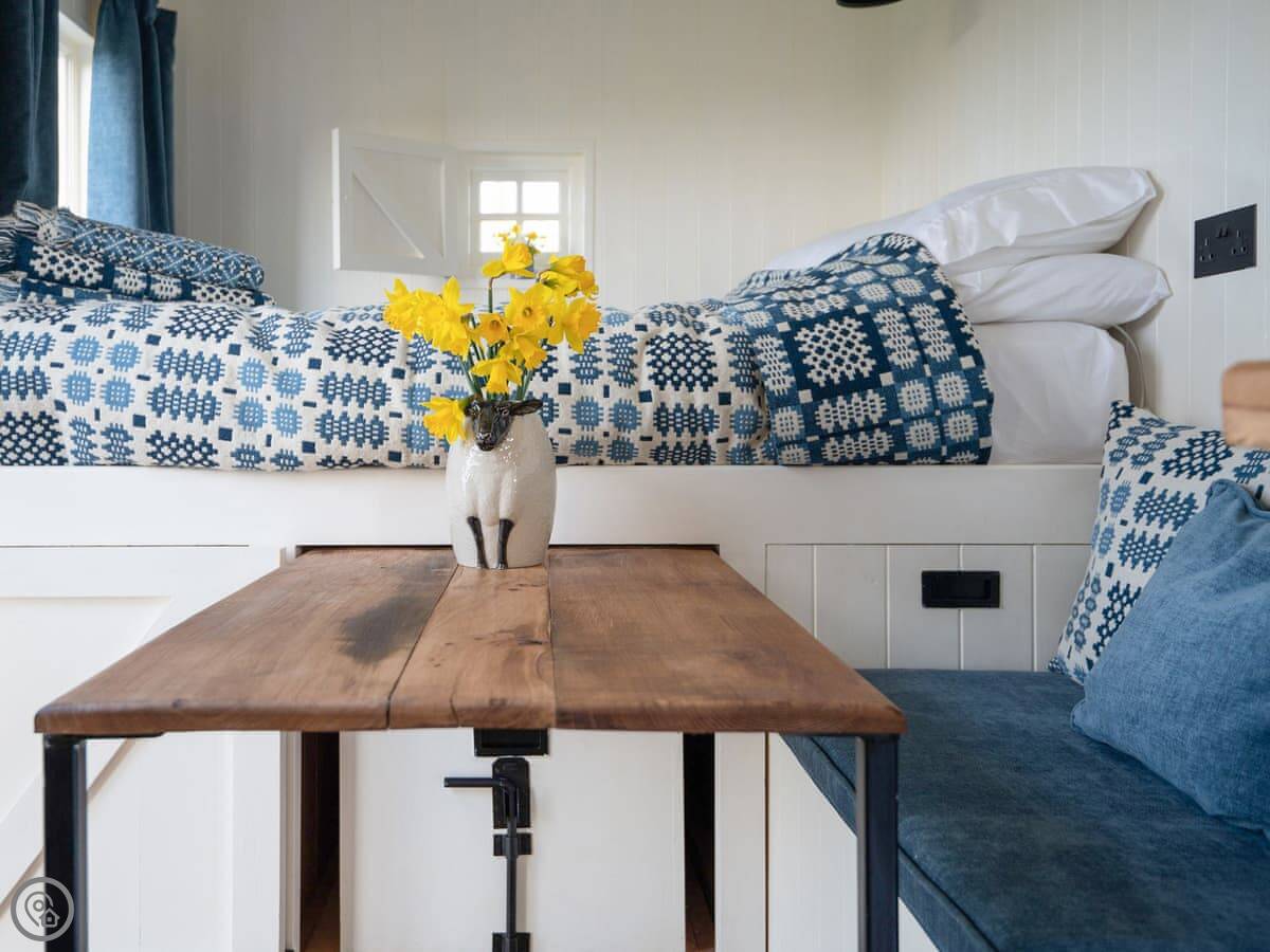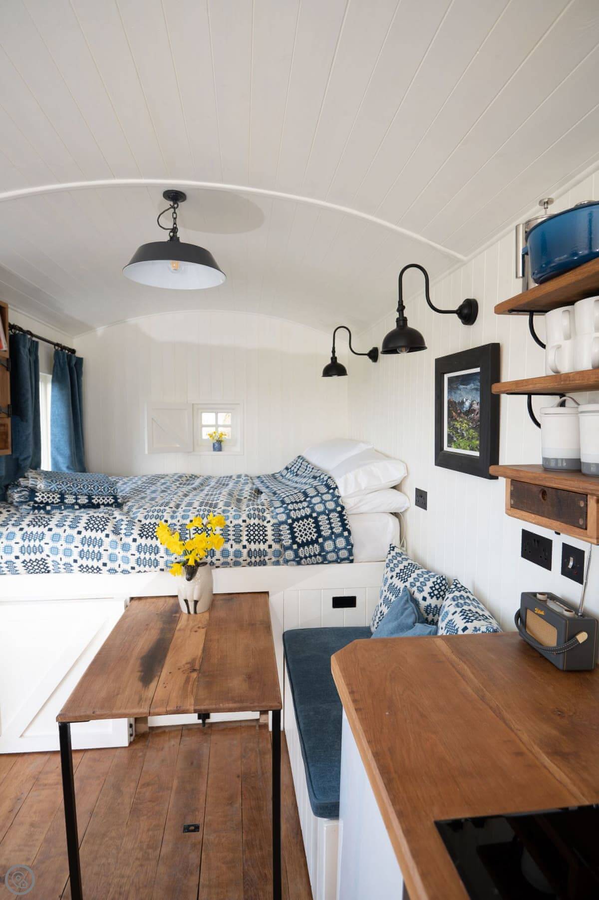 Mentioned in The Times, April 2022, Siôr’s is a bespoke shepherds hut with elegant design features that showcases traditional Welsh craftsmanship and heritage and has been carefully furnished with a variety of home comforts and little details to create an extra special retreat on the north Wales coast. The sumptuous handmade mattress, made from the finest sustainable materials, is dressed with soft linen and topped with wool Trefriw tapestry blankets. Look forward to a restful sleep in this glorious countryside setting and awaken to a chorus of singing birds and views of the sea. The kitchen is fitted with Smeg appliances and has all you need to make scrumptious meals if that what you decide to do. There is an extendable dining table and bench with tapestry blanket cushions, an ideal spot for eating indoors. A powerful wood burner stands on its own hearth with stunning fire surround created from original antique 18th century delft tiles, depicting shepherds, farms and flowers. After a busy day exploring the local area come home and relax in the new wood-fired hot tub. Sior is incredibly warm, with ambient designer lighting which creates a restful atmosphere. Take a book from the shelf and relax a while by as the world goes by.