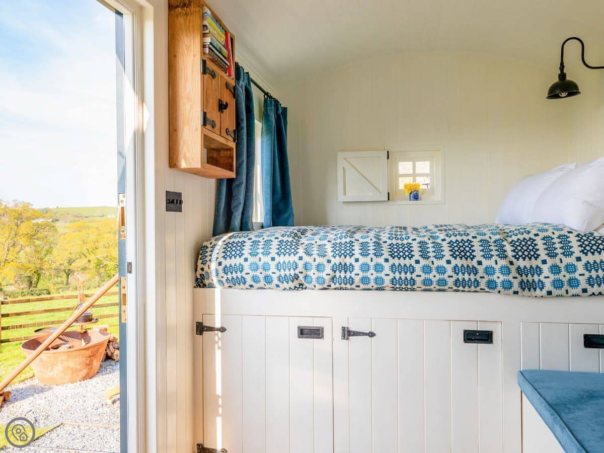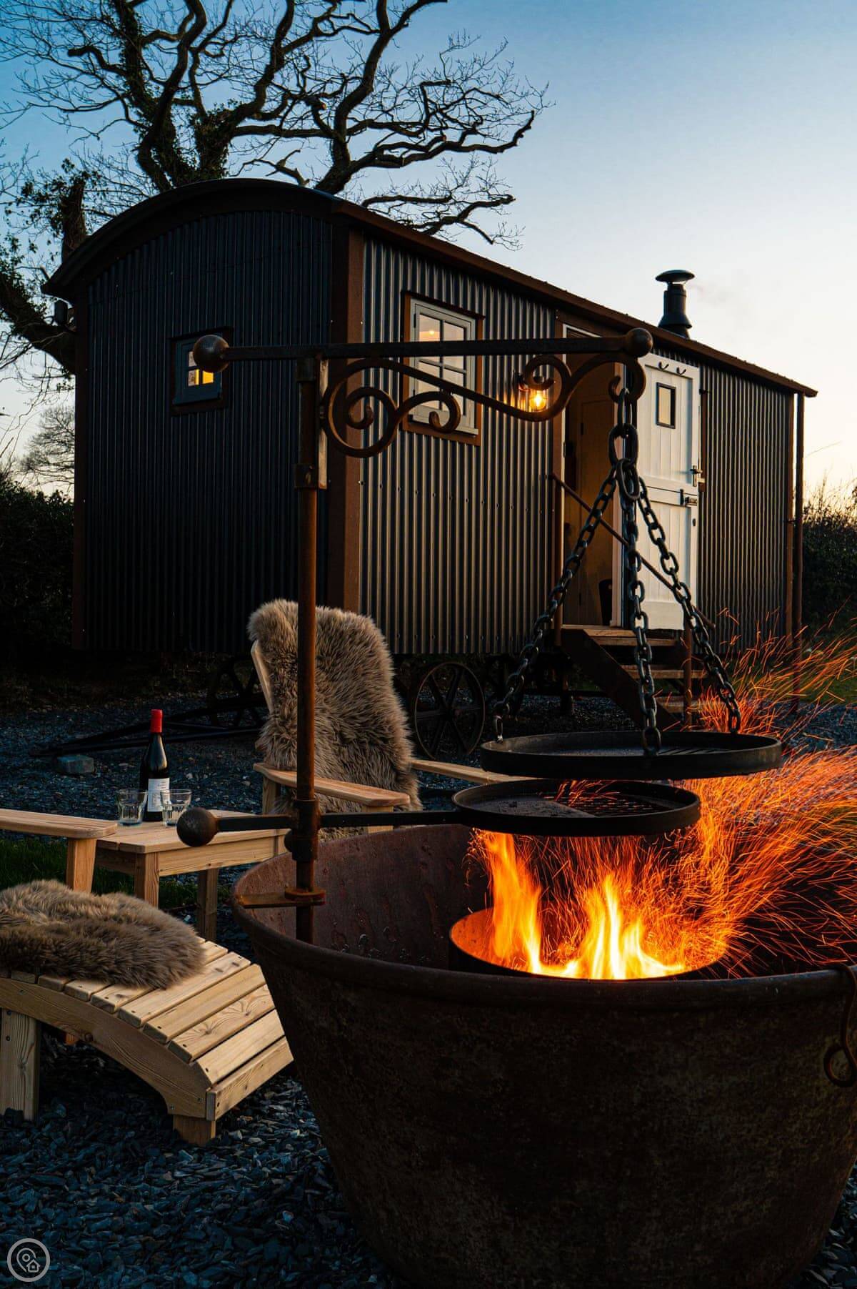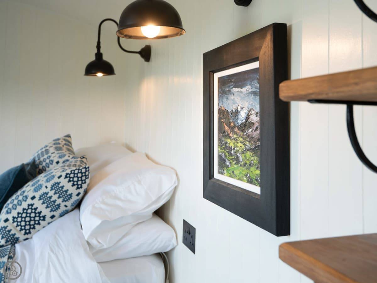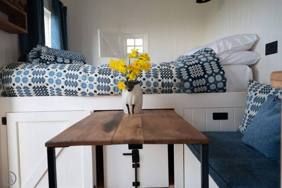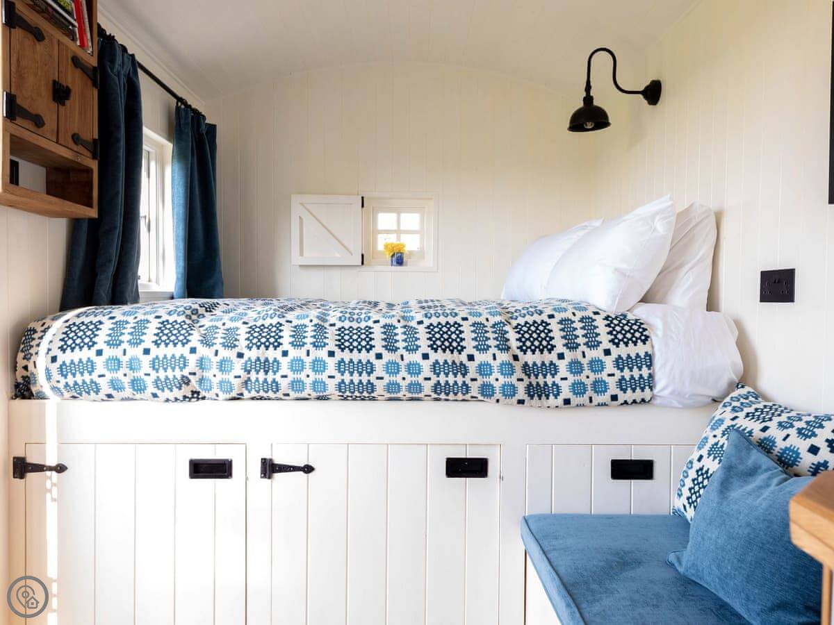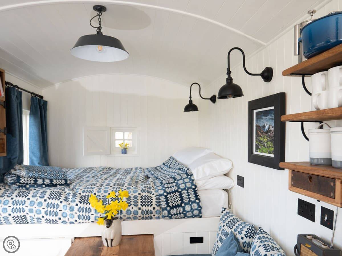 Mentioned in The Times, April 2022, Siôr’s is a bespoke shepherds hut with elegant design features that showcases traditional Welsh craftsmanship and heritage and has been carefully furnished with a variety of home comforts and little details to create an extra special retreat on the north Wales coast. The sumptuous handmade mattress, made from the finest sustainable materials, is dressed with soft linen and topped with wool Trefriw tapestry blankets. Look forward to a restful sleep in this glorious countryside setting and awaken to a chorus of singing birds and views of the sea. The kitchen is fitted with Smeg appliances and has all you need to make scrumptious meals if that what you decide to do. There is an extendable dining table and bench with tapestry blanket cushions, an ideal spot for eating indoors. A powerful wood burner stands on its own hearth with stunning fire surround created from original antique 18th century delft tiles, depicting shepherds, farms and flowers. After a busy day exploring the local area come home and relax in the new wood-fired hot tub. Sior is incredibly warm, with ambient designer lighting which creates a restful atmosphere. Take a book from the shelf and relax a while by as the world goes by.