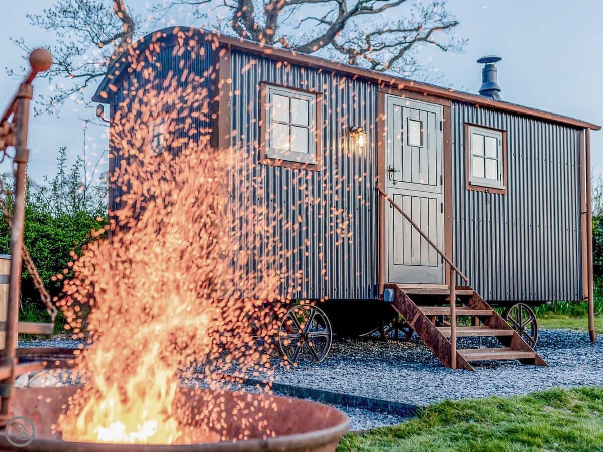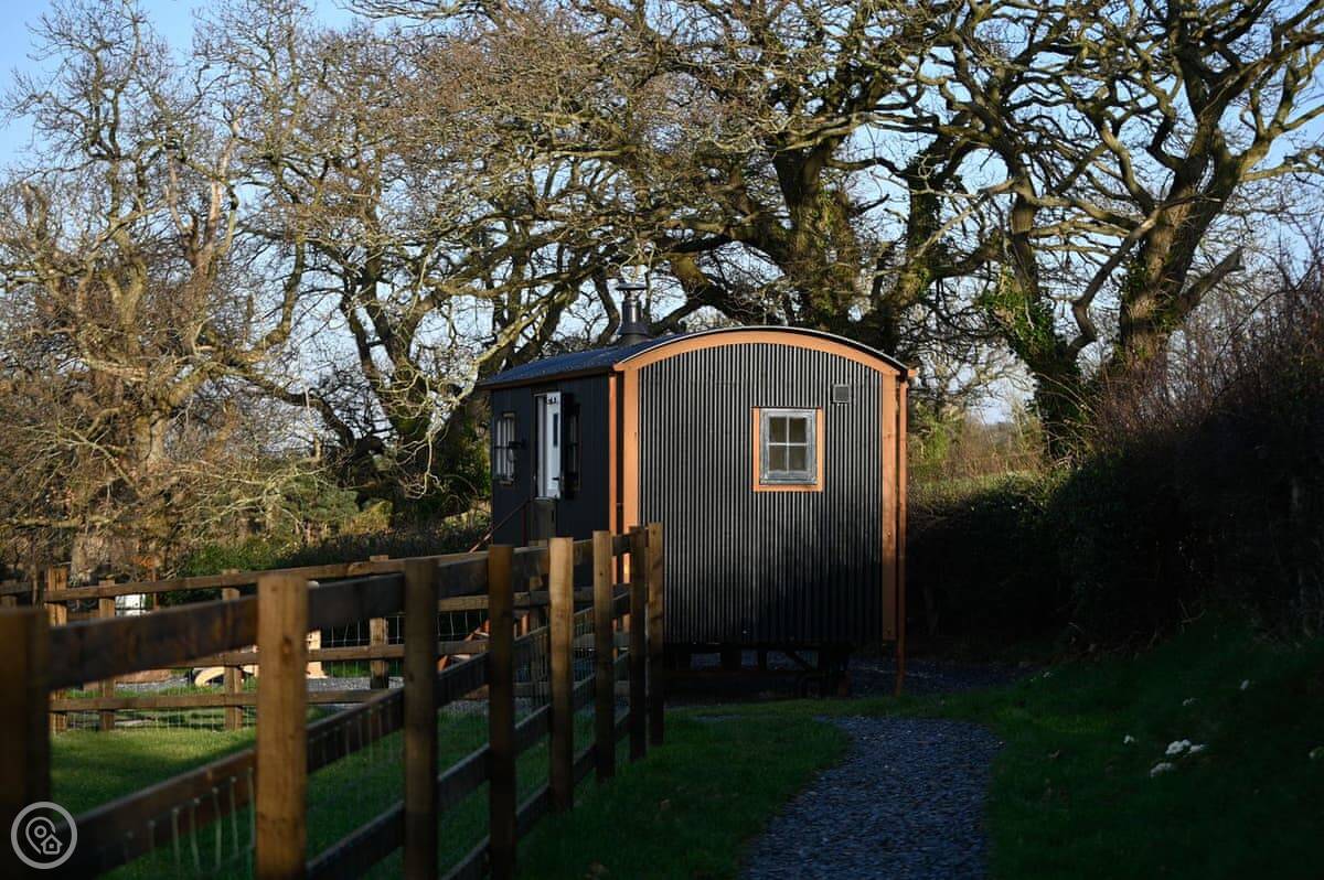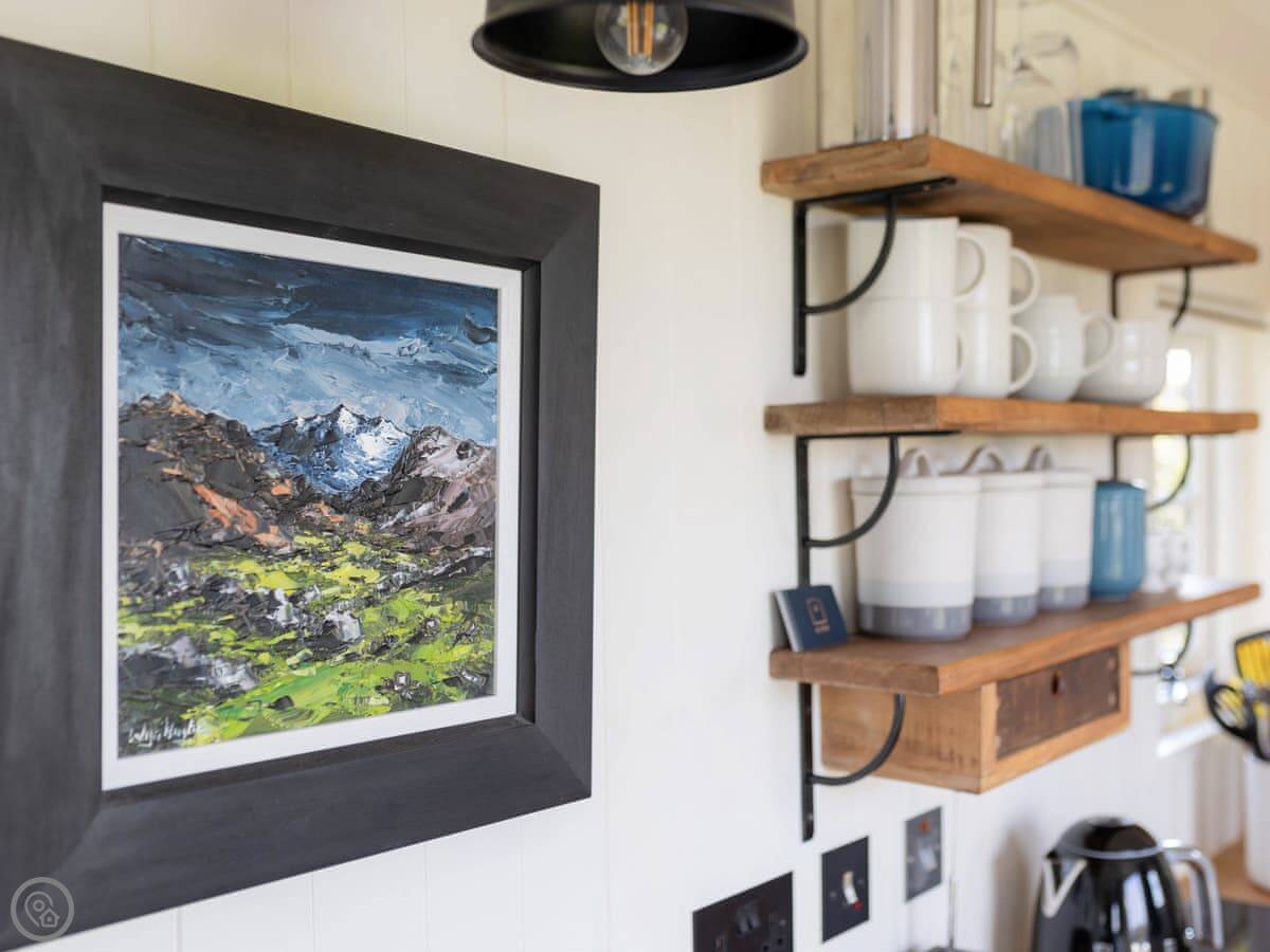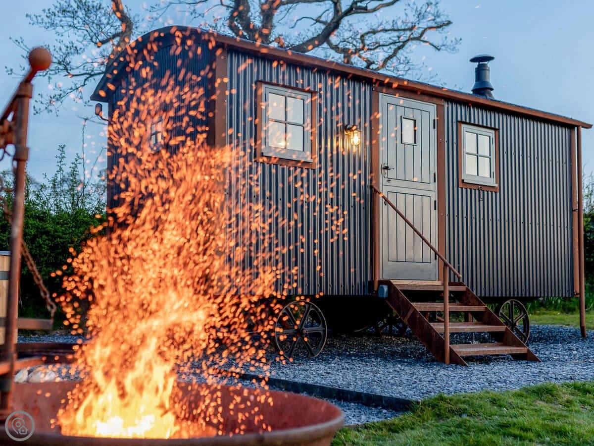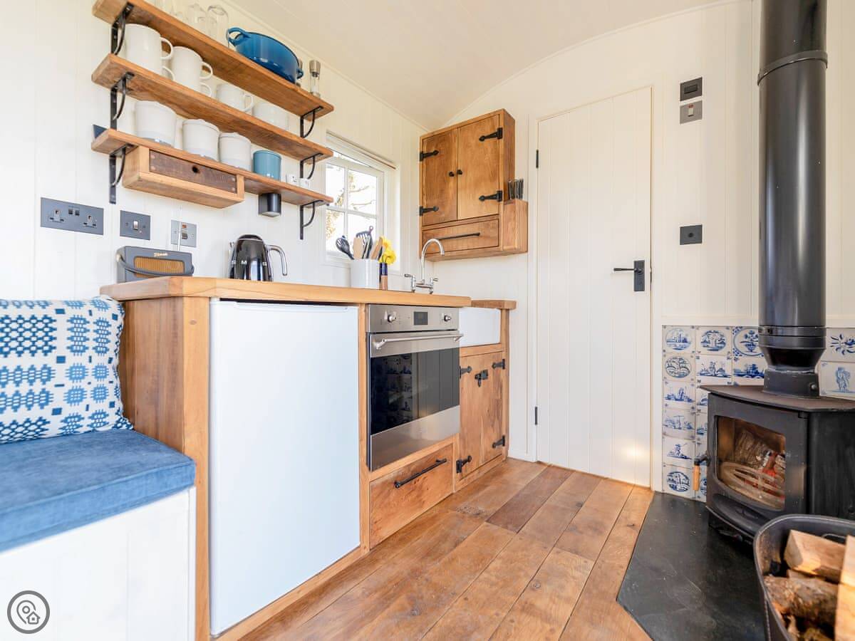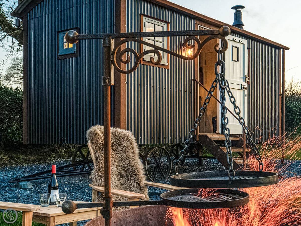 Mentioned in The Times, April 2022, Siôr’s is a bespoke shepherds hut with elegant design features that showcases traditional Welsh craftsmanship and heritage and has been carefully furnished with a variety of home comforts and little details to create an extra special retreat on the north Wales coast. The sumptuous handmade mattress, made from the finest sustainable materials, is dressed with soft linen and topped with wool Trefriw tapestry blankets. Look forward to a restful sleep in this glorious countryside setting and awaken to a chorus of singing birds and views of the sea. The kitchen is fitted with Smeg appliances and has all you need to make scrumptious meals if that what you decide to do. There is an extendable dining table and bench with tapestry blanket cushions, an ideal spot for eating indoors. A powerful wood burner stands on its own hearth with stunning fire surround created from original antique 18th century delft tiles, depicting shepherds, farms and flowers. After a busy day exploring the local area come home and relax in the new wood-fired hot tub. Sior is incredibly warm, with ambient designer lighting which creates a restful atmosphere. Take a book from the shelf and relax a while by as the world goes by.