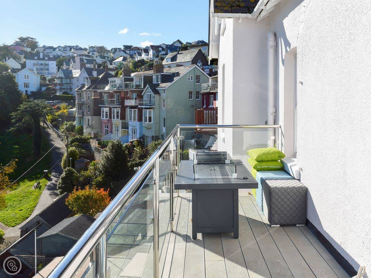 The main thing about it is the view. You can see from the front windows, and especially from the balcony, right down over the town roofs to Snapes Point and the estuary. The balcony's got a sofa and a table out there.