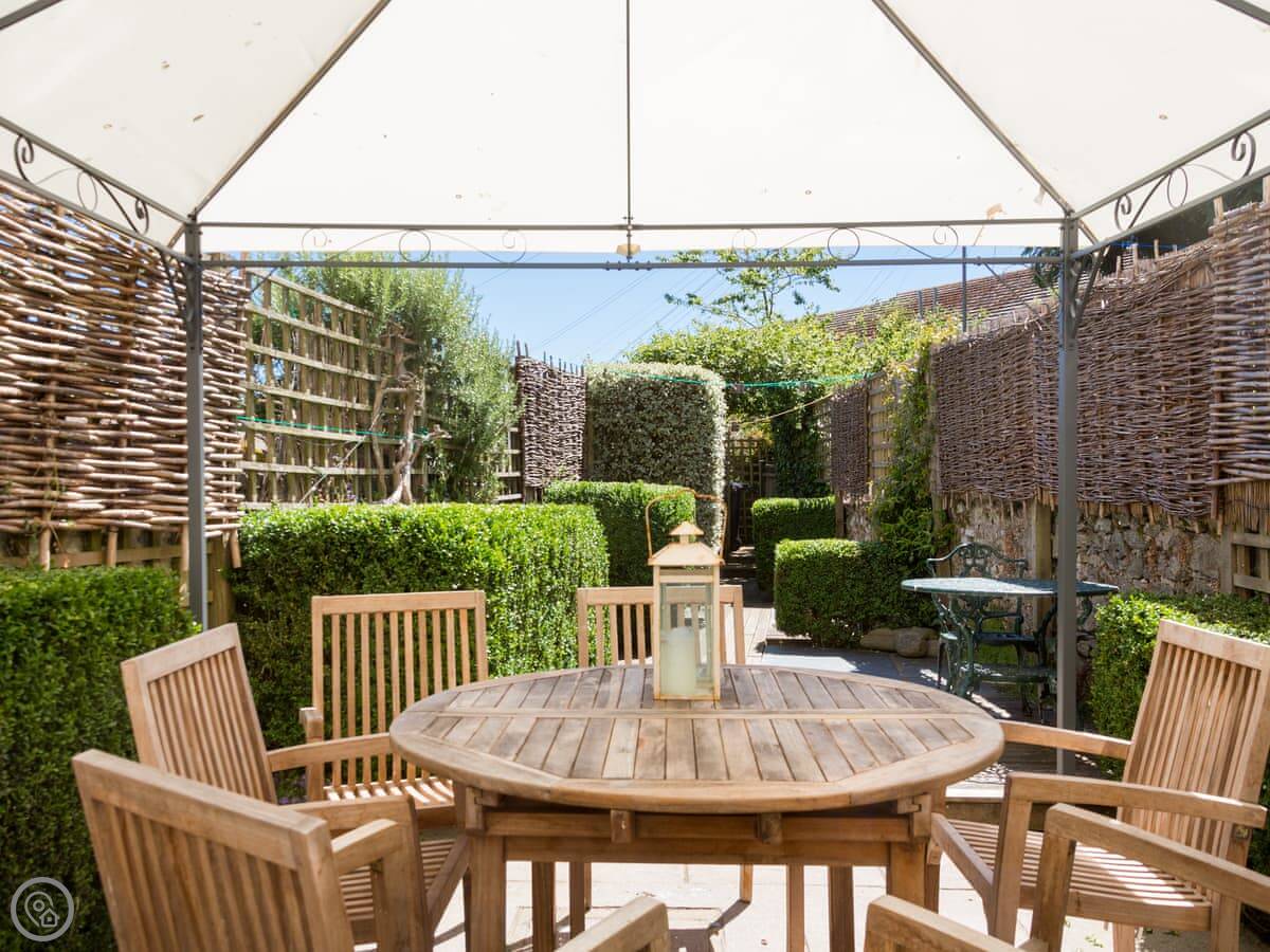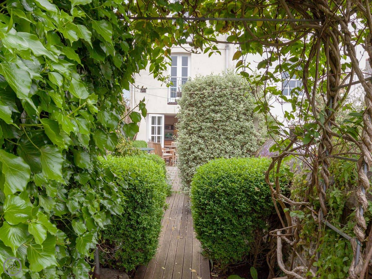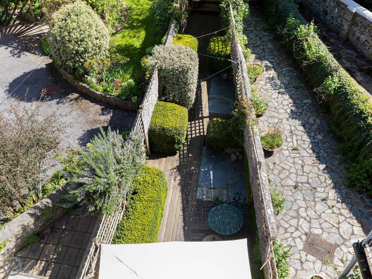 Out the back there's a patio and a garden with some decking. It's got mature shrubs so it feels a bit private. You can sit out there.