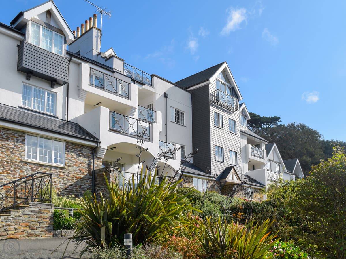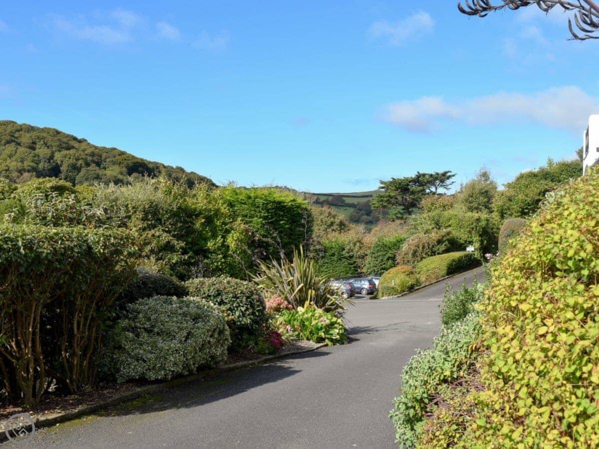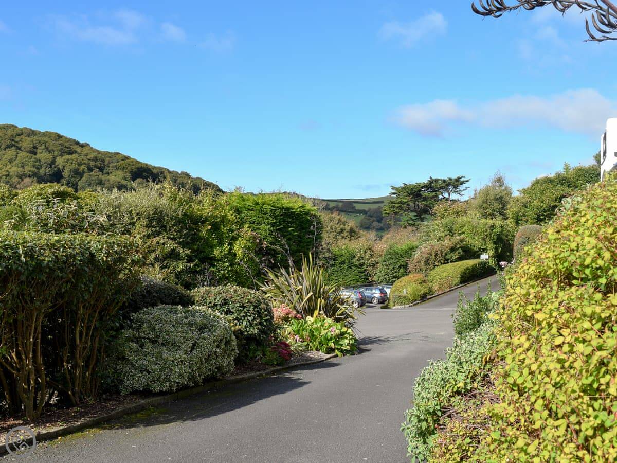 This is St Elmo Court 7. It's in Salcombe, up near North Sands beach. The walk into town from here is nice, about a mile along the road.
