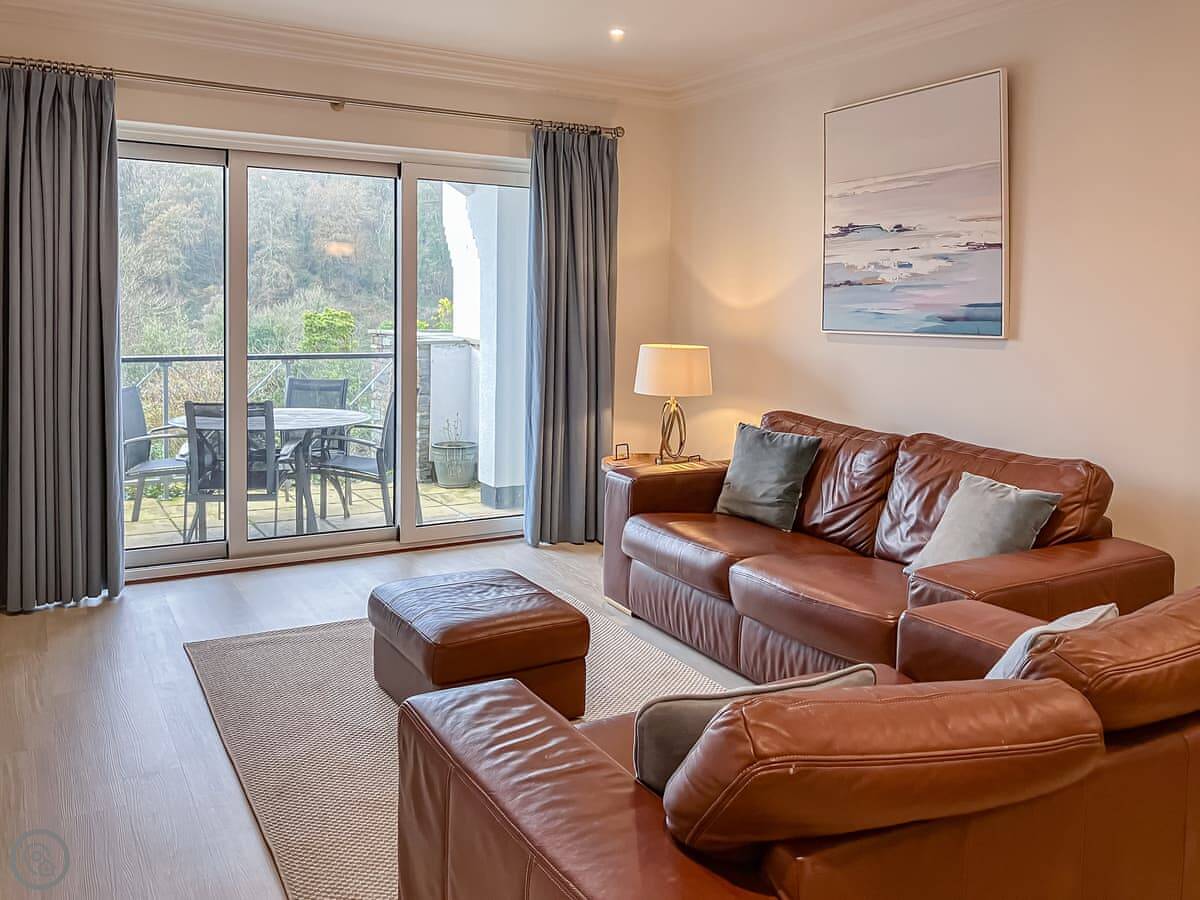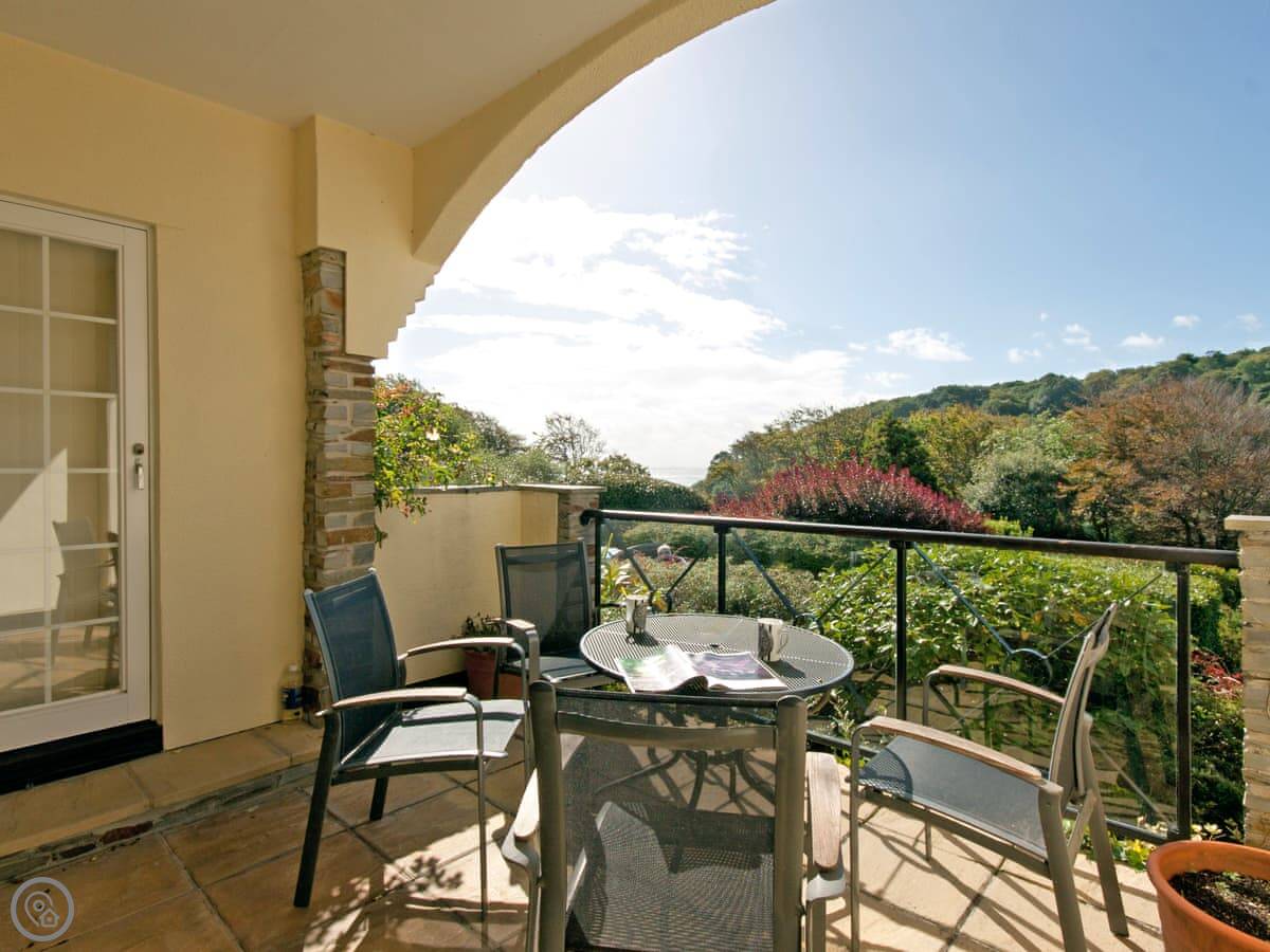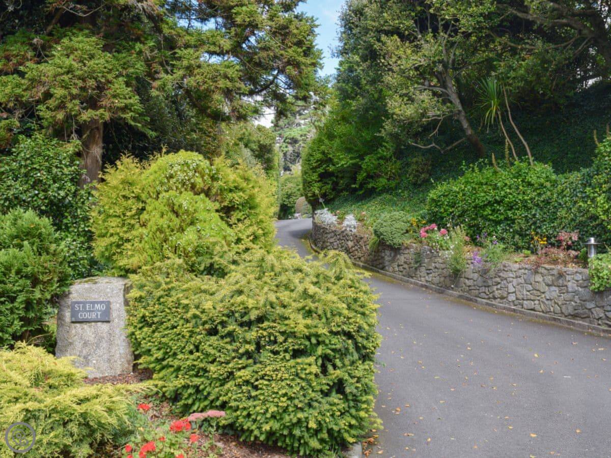This is St Elmo Court 7. It's in Salcombe, up near North Sands beach. The walk into town from here is nice, about a mile along the road.