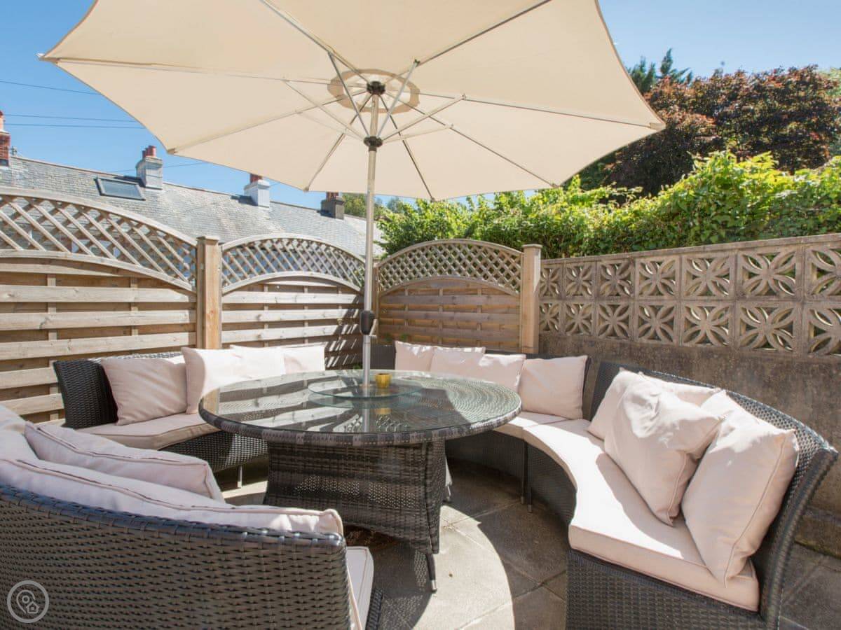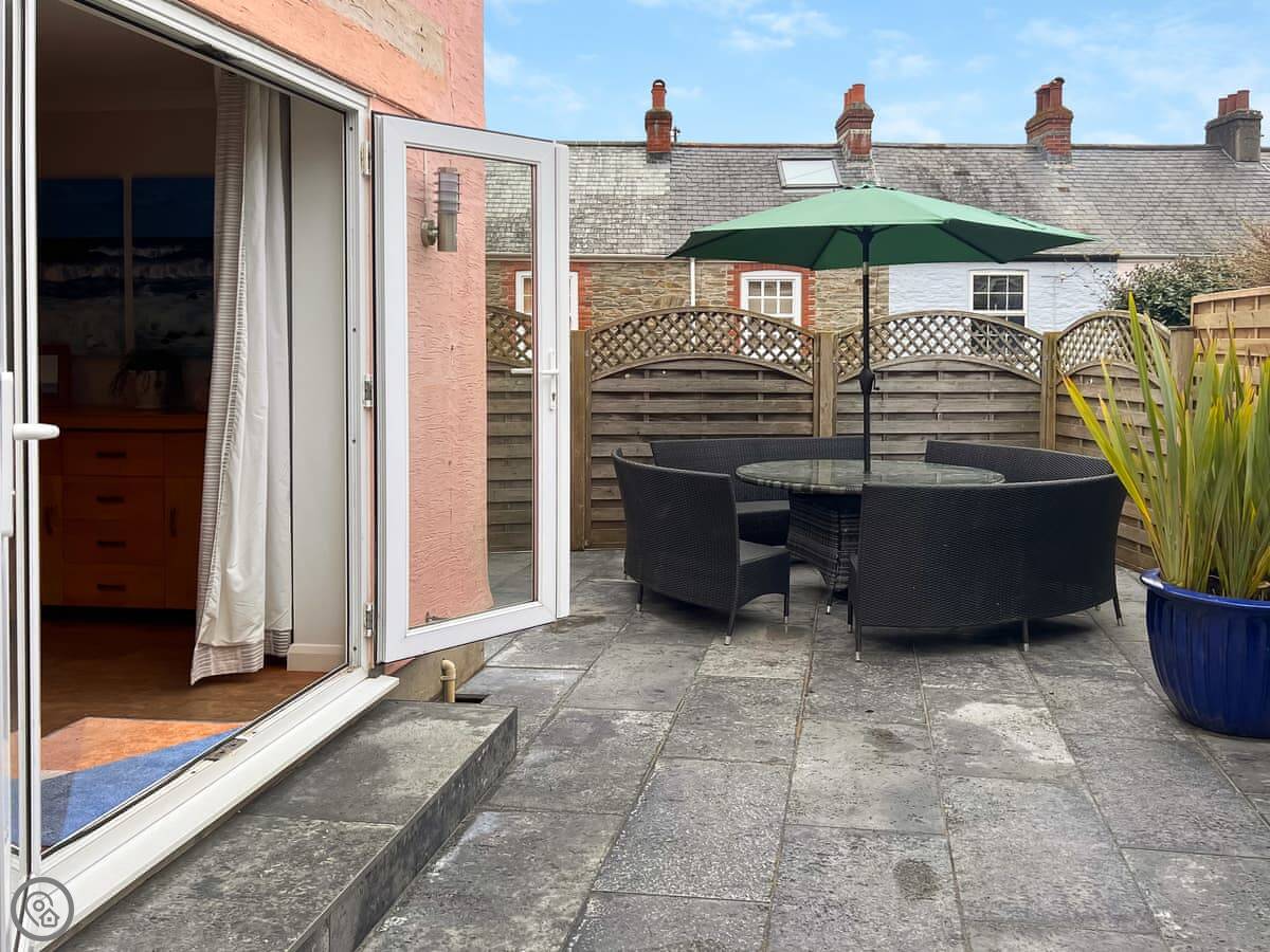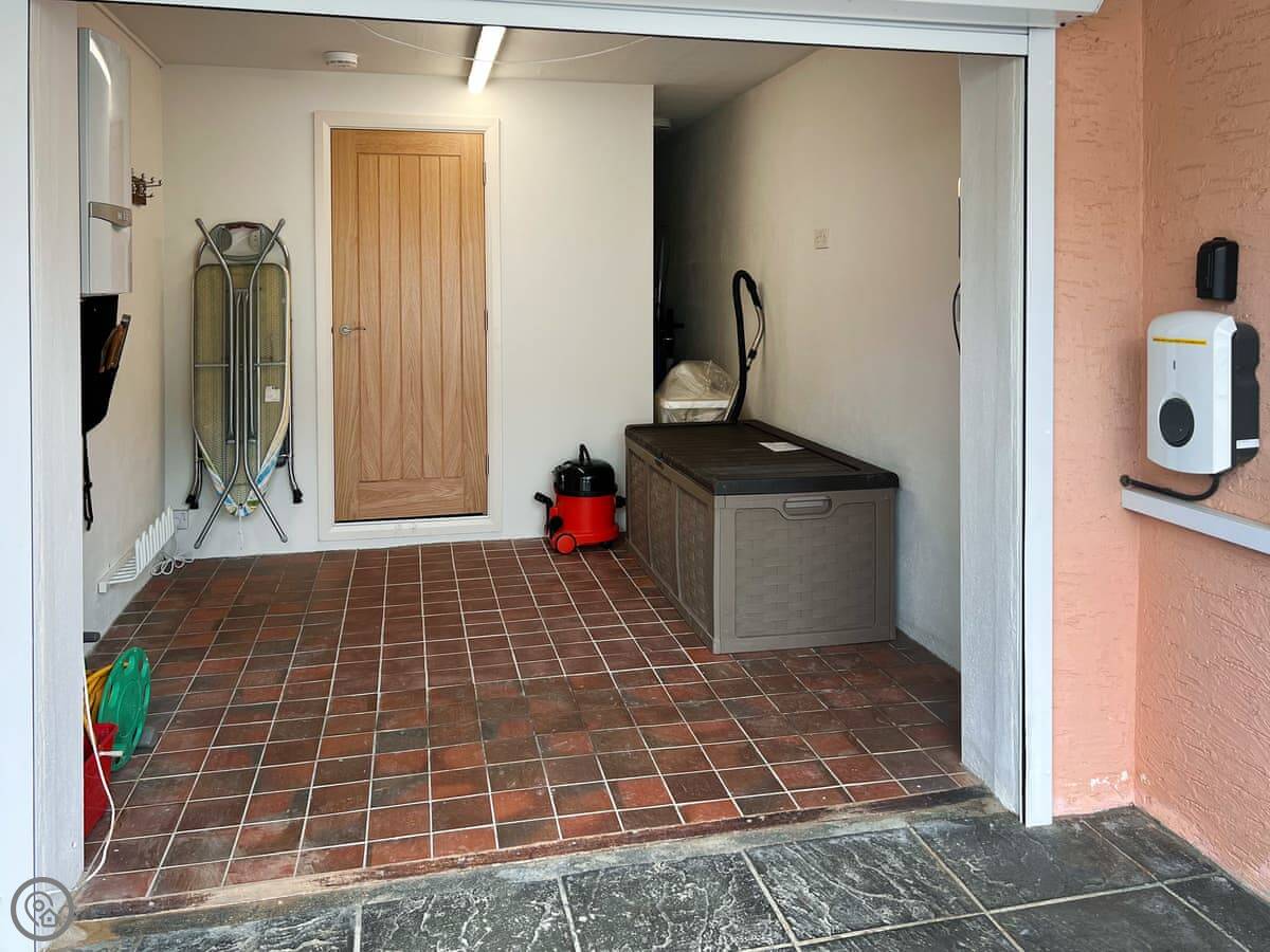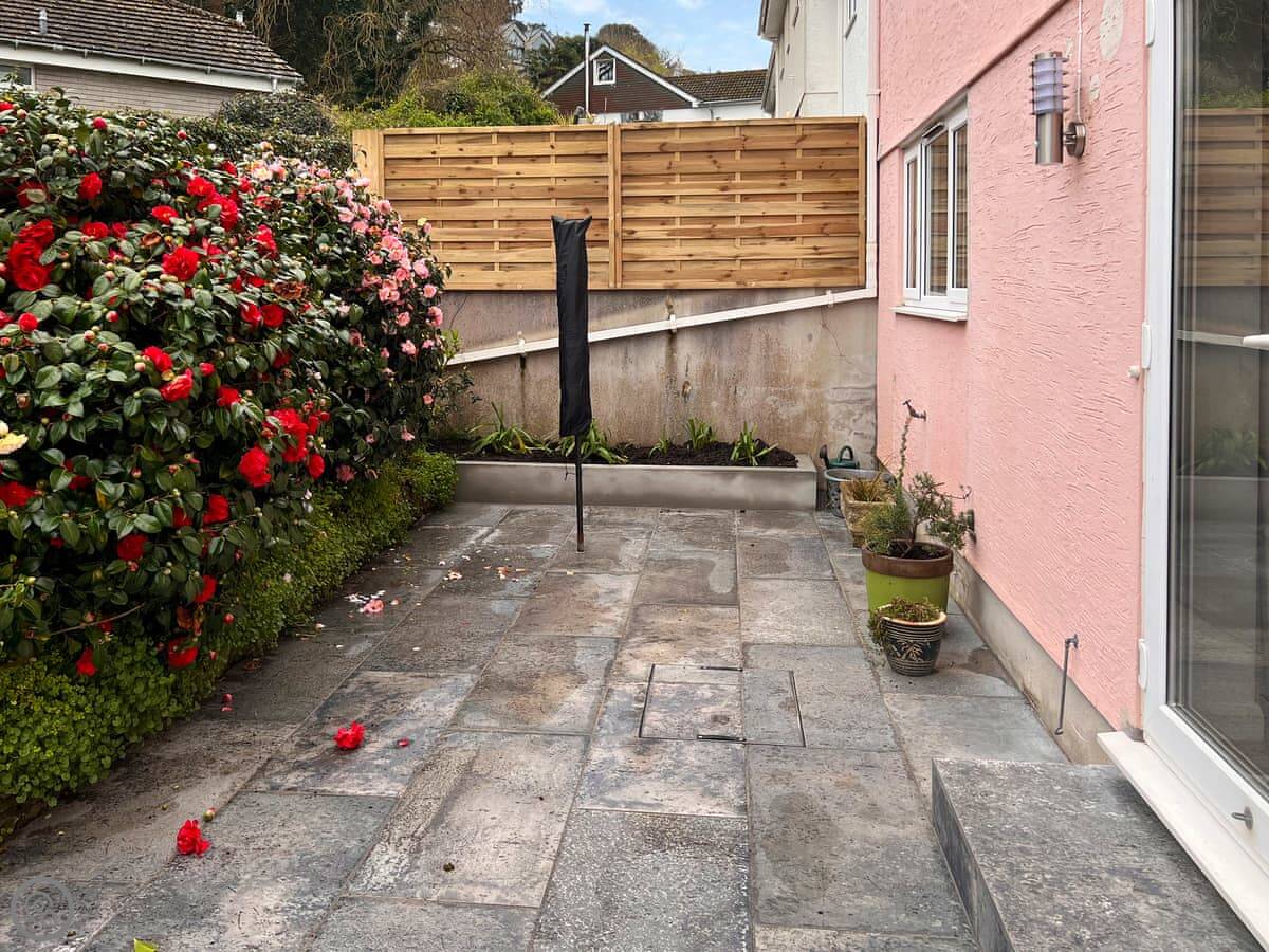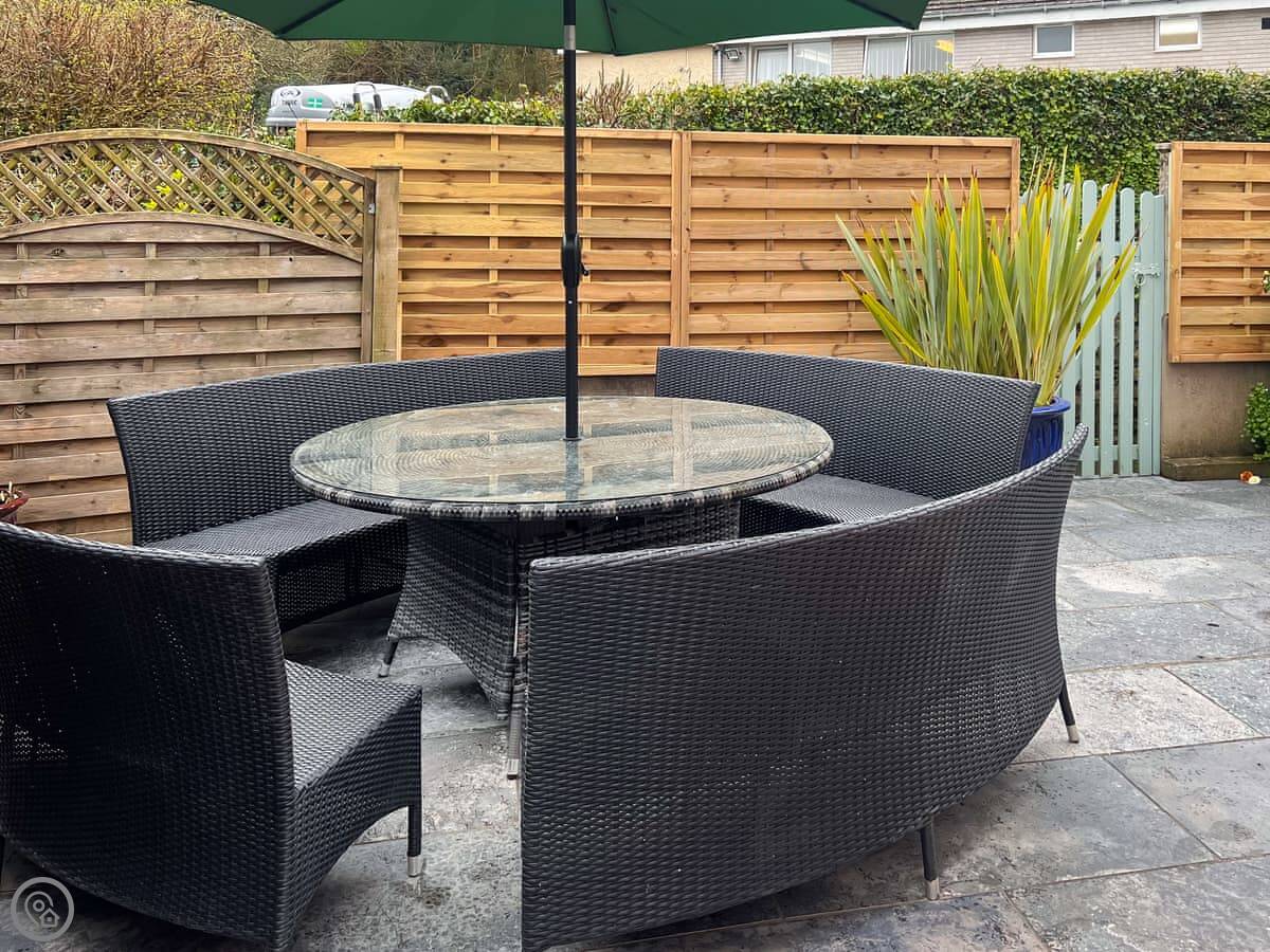 It sleeps eight in four bedrooms. Two bathrooms, one with a walk-in shower. The 4 Star rating means it's well-equipped and comfortable. It's a family house, not a show home. The garden is a flagged patio area, south-facing so you get the sun. There's parking for two cars right there, and an electric vehicle charger.