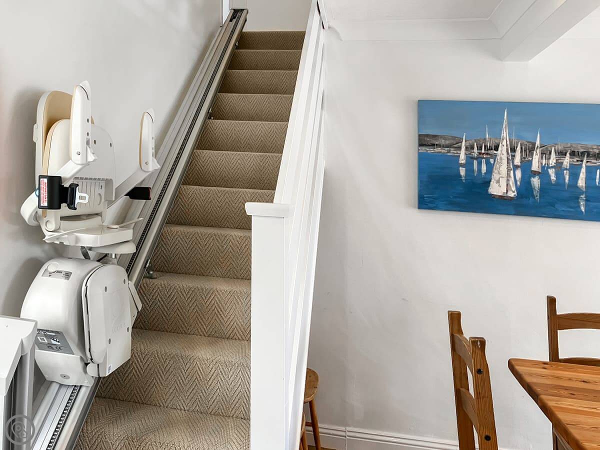 It's accessible for wheelchairs and there's a stairlift for the internal steps if you need it. There's one parking space on site.