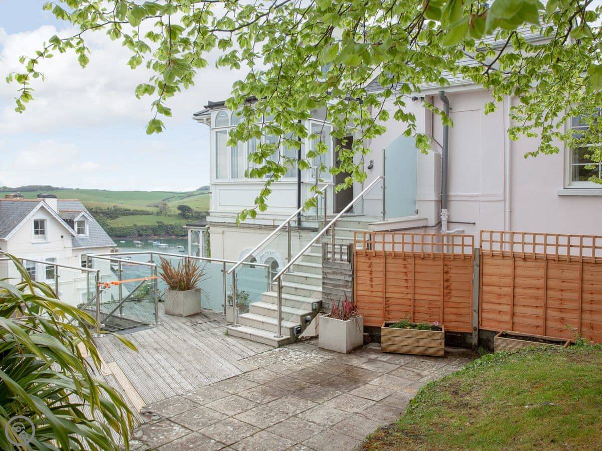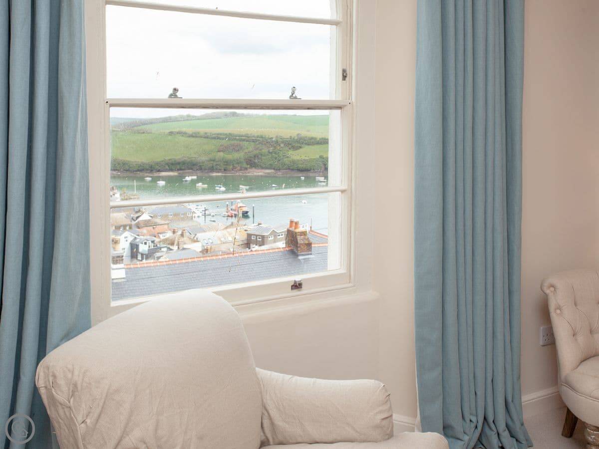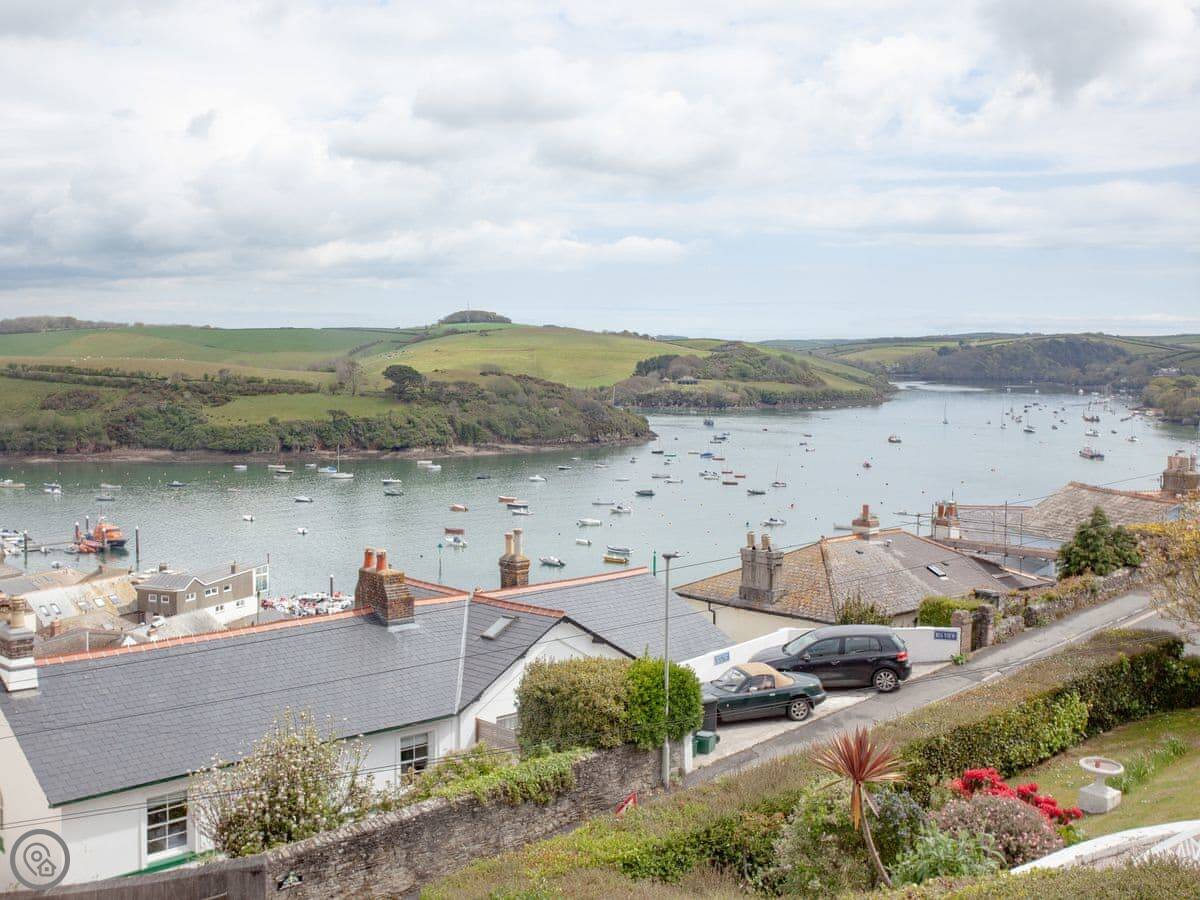 This place is Muffins. It's in Salcombe, on Devon Road. It's the top two floors of a Victorian house, so keep in mind there's someone else in the ground floor flat. The views are the main thing. You look right over the town and the estuary towards Snapes Point.