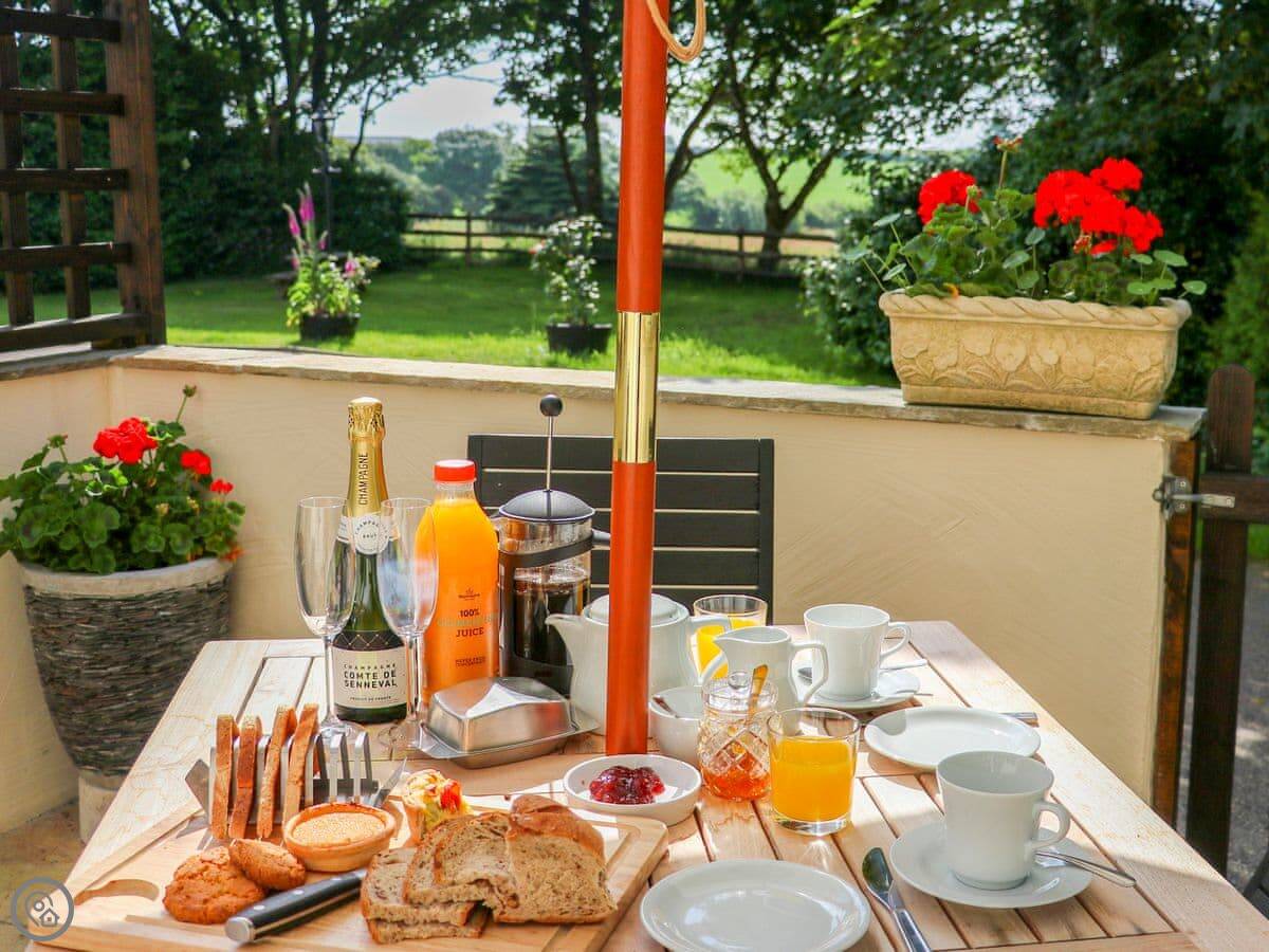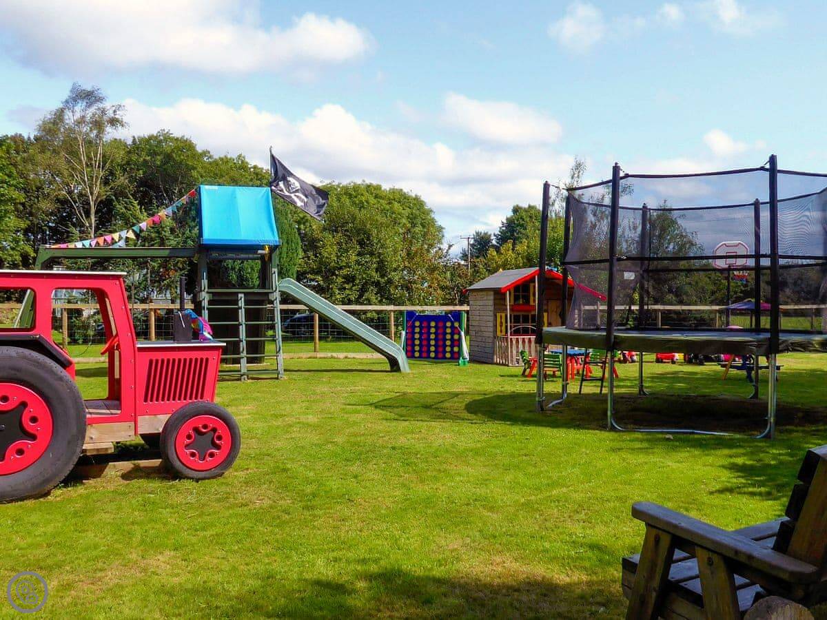 The cottage is part of a group set in a shared field, so there's space for kids to run about. There's a play area and some garden games. Other cottages are nearby, which is good if you're booking with a larger group. You have your own patio and garden area.
