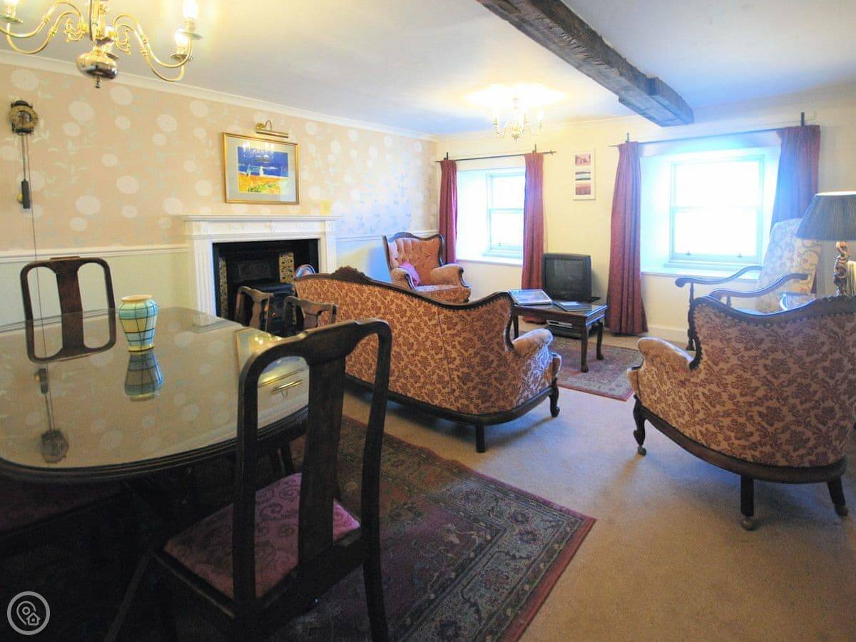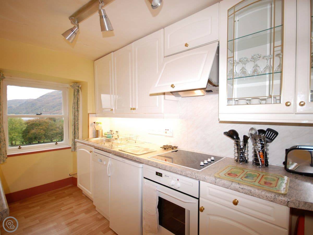 This is Etive View. It's a first-floor apartment in Bonawe House, which is an old house from the 1700s near Taynuilt. The place sleeps six. Three bedrooms, two bathrooms.
