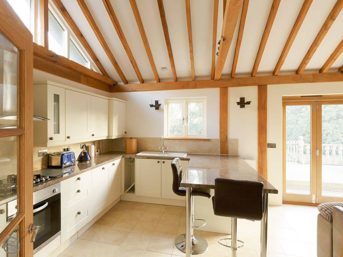 The main room is open plan, with a wood burner. There are exposed beams, which are nice but you might need to watch your head in a couple of spots if you're tall.