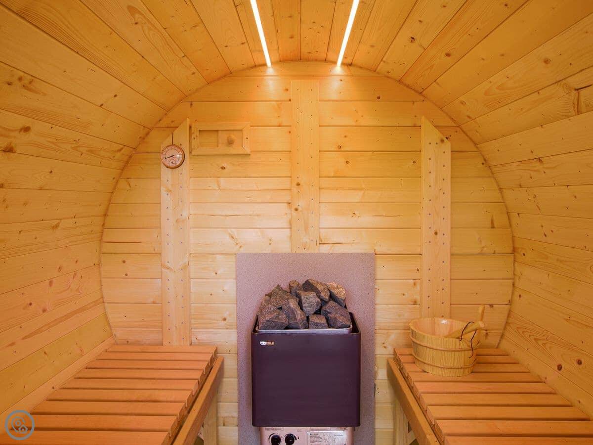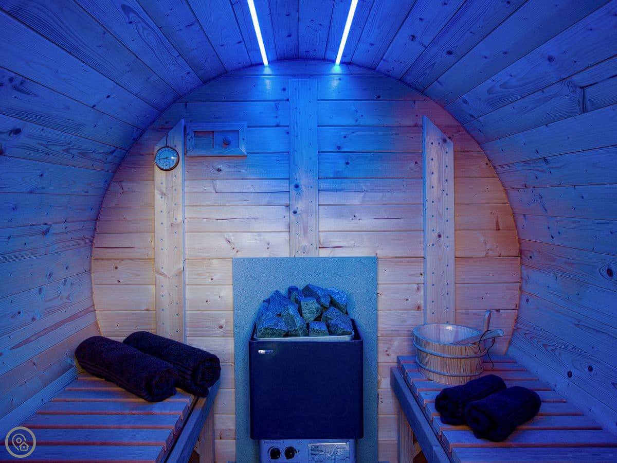 The garden is enclosed, which is good if you've got dogs or kids. There's a patio with a BBQ and an outdoor pizza oven. There's also a covered hot tub and a barrel sauna out there. We get them serviced regularly.