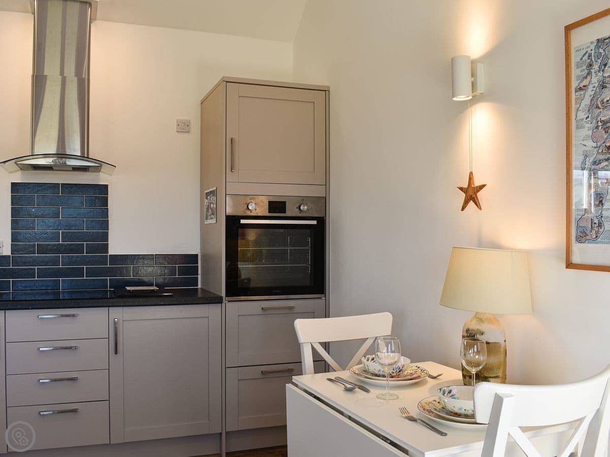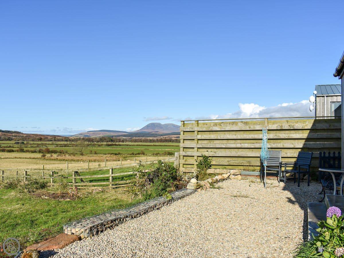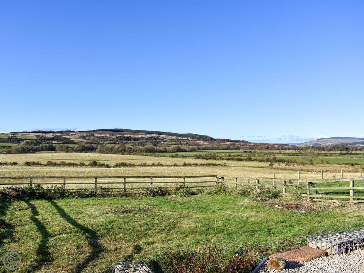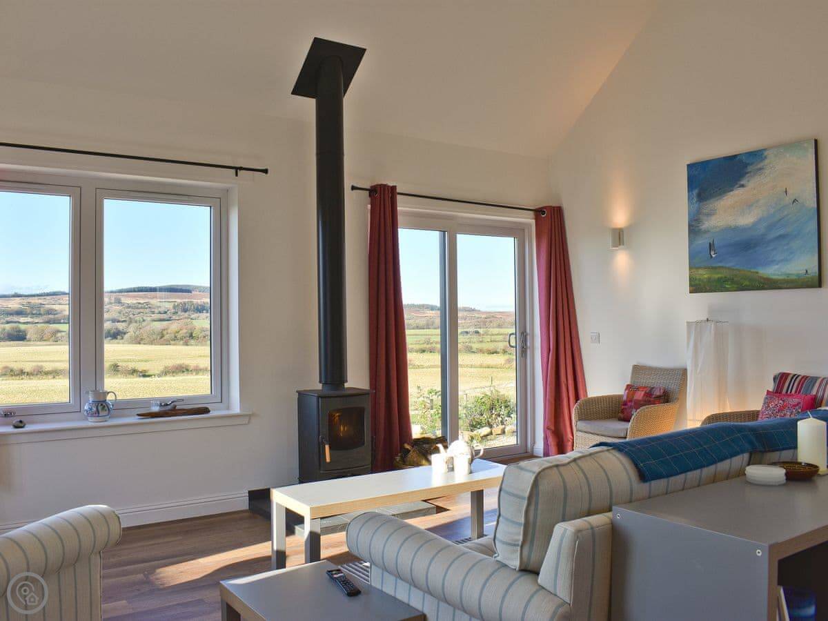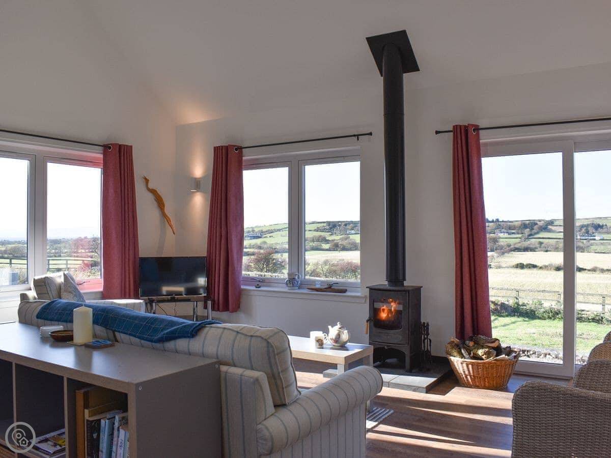 The main room is open plan, kitchen and living area together. The big thing is the view. The windows and French doors look straight out over fields. You can sit outside on the patio. The wood burner works well for cooler evenings.