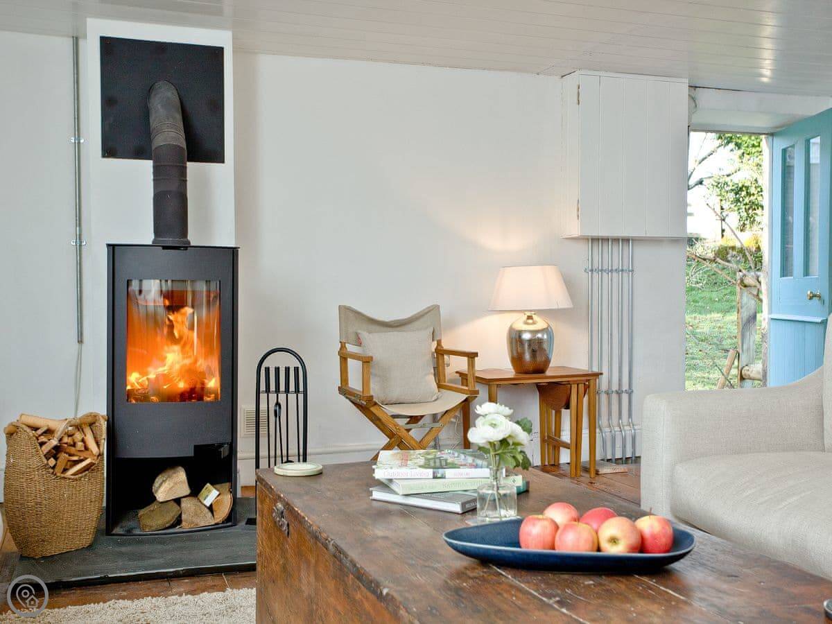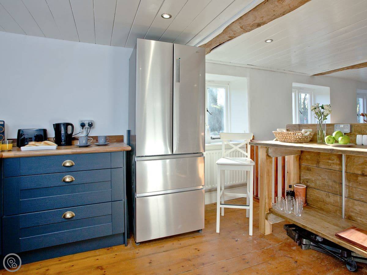 Inside, there are a lot of old beams. You'll need to mind your head in a couple of spots. There's a wood burner in the living room. We leave some wood for you to start with. The kitchen has a dishwasher and a washing machine. The WiFi is full fibre, so it's reliable.
