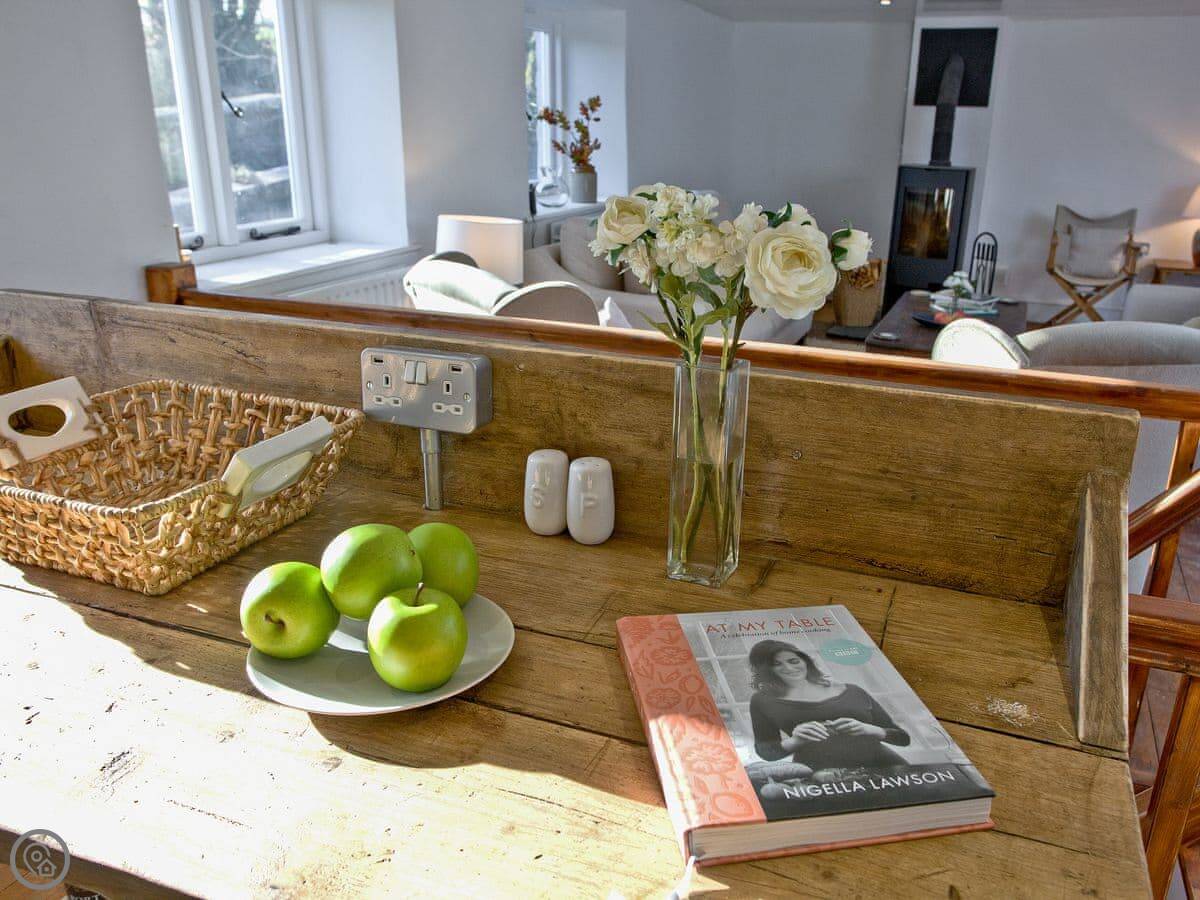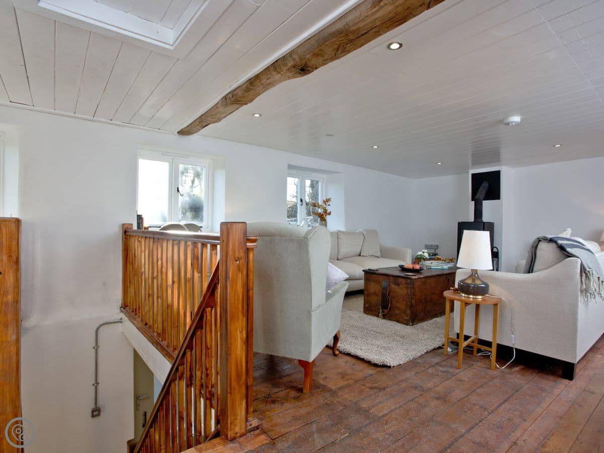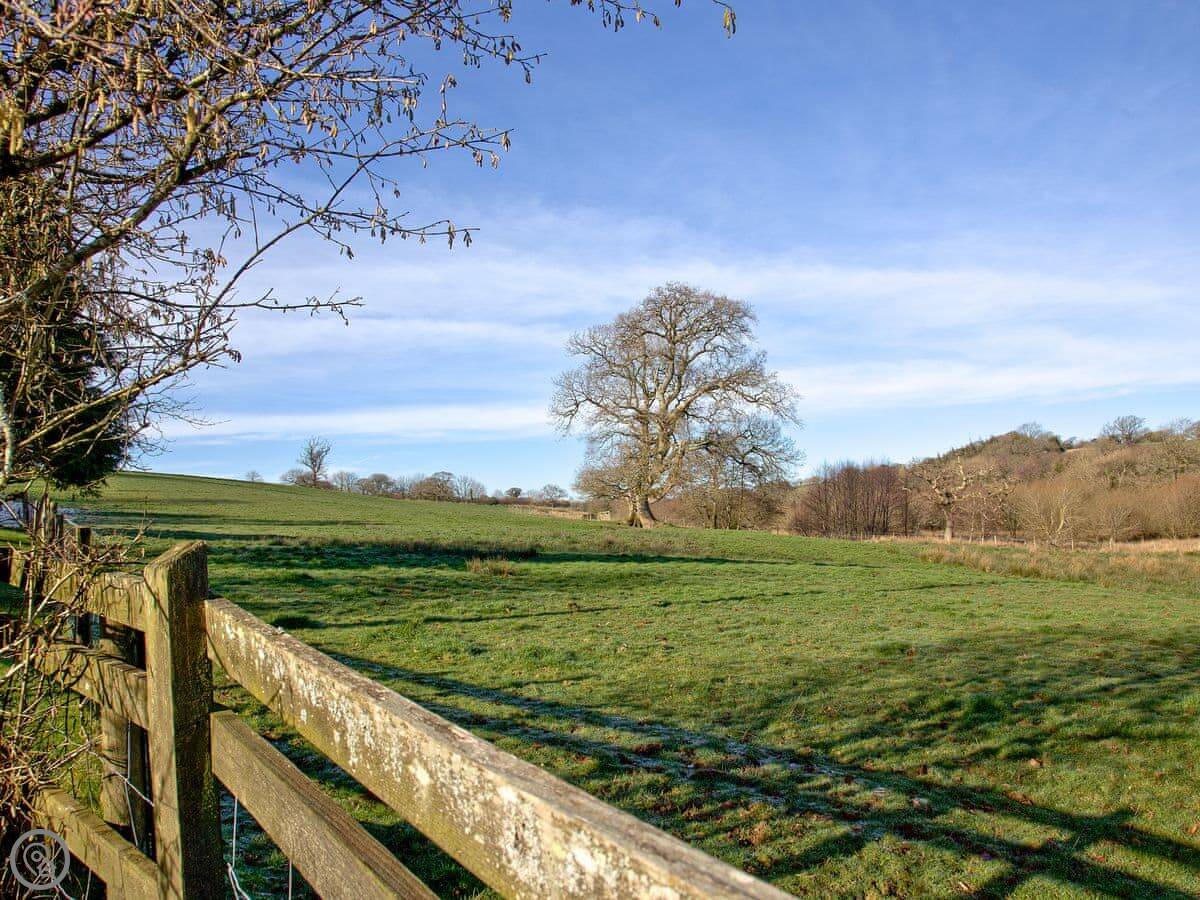 The layout is upside down. You'll find the bedrooms on the ground floor when you arrive, with the living room and kitchen upstairs. We did that because the views are better from up there. You get a clear look over the fields. The garden is enclosed, which is good if you've got dogs or children. You can have up to two well-behaved dogs.