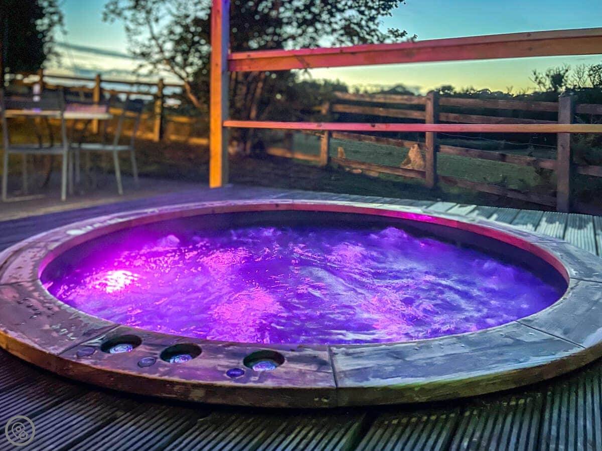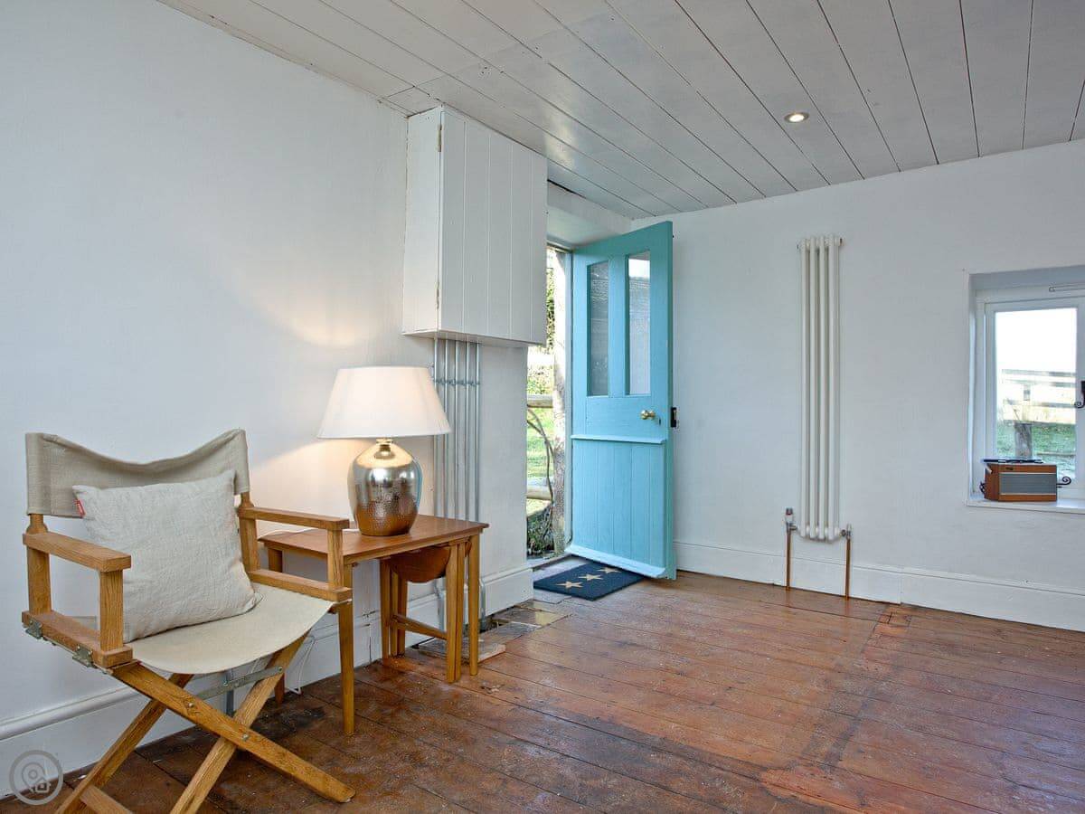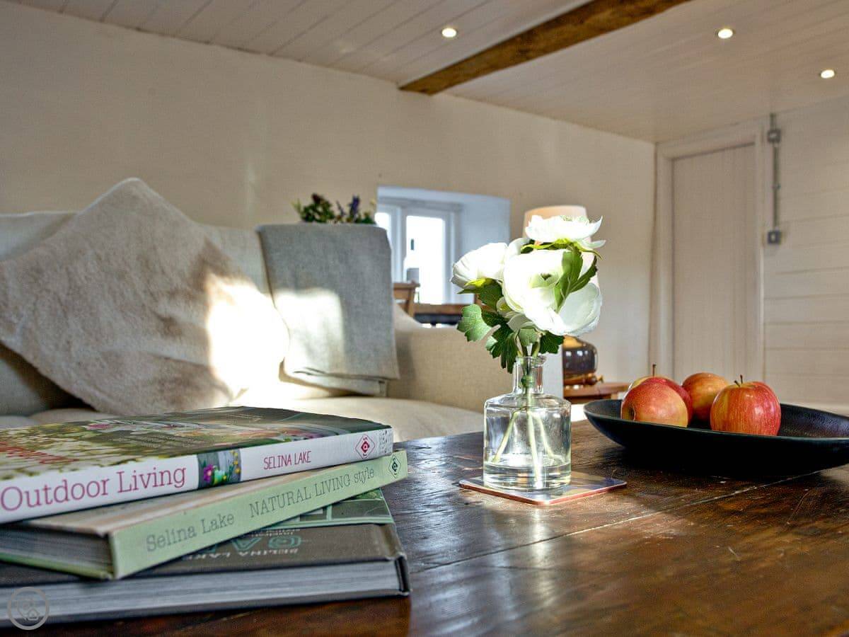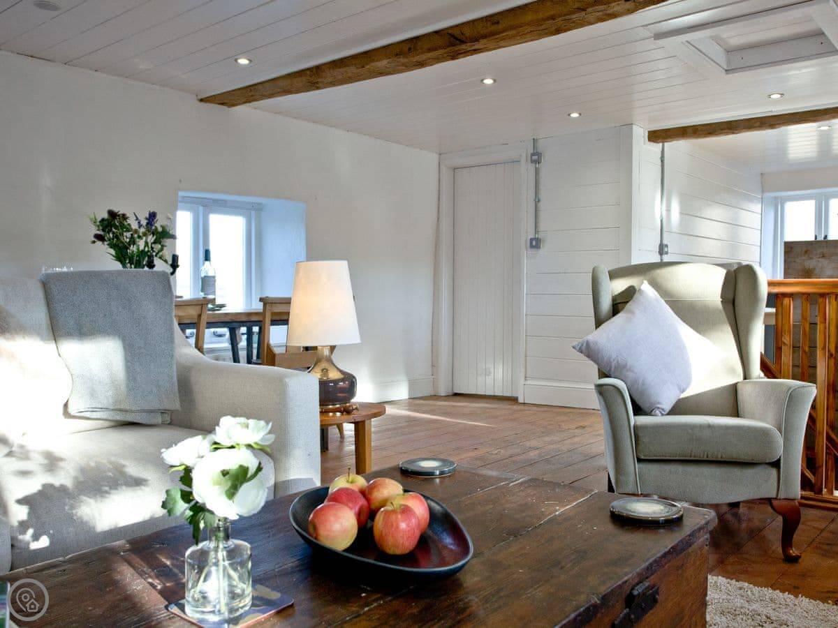 The layout is upside down. You'll find the bedrooms on the ground floor when you arrive, with the living room and kitchen upstairs. We did that because the views are better from up there. You get a clear look over the fields. The garden is enclosed, which is good if you've got dogs or children. You can have up to two well-behaved dogs.