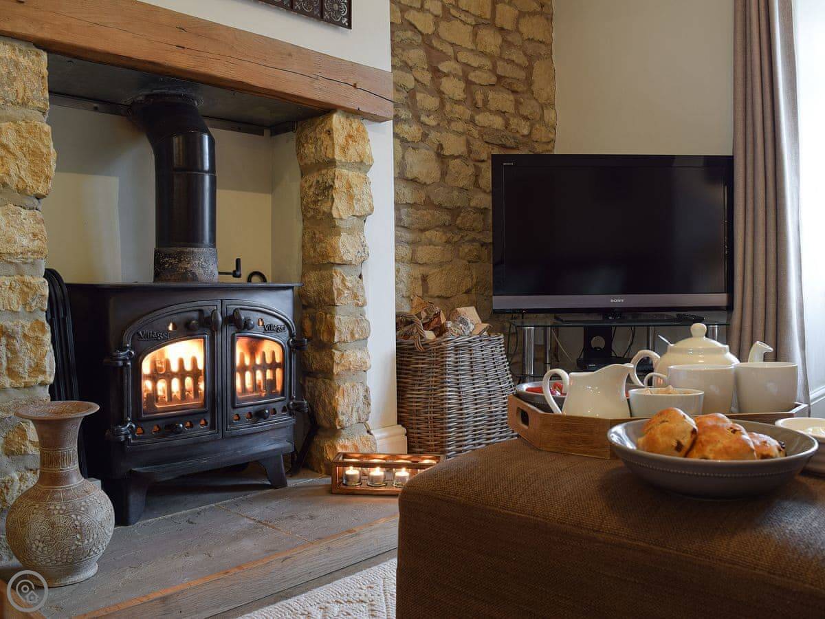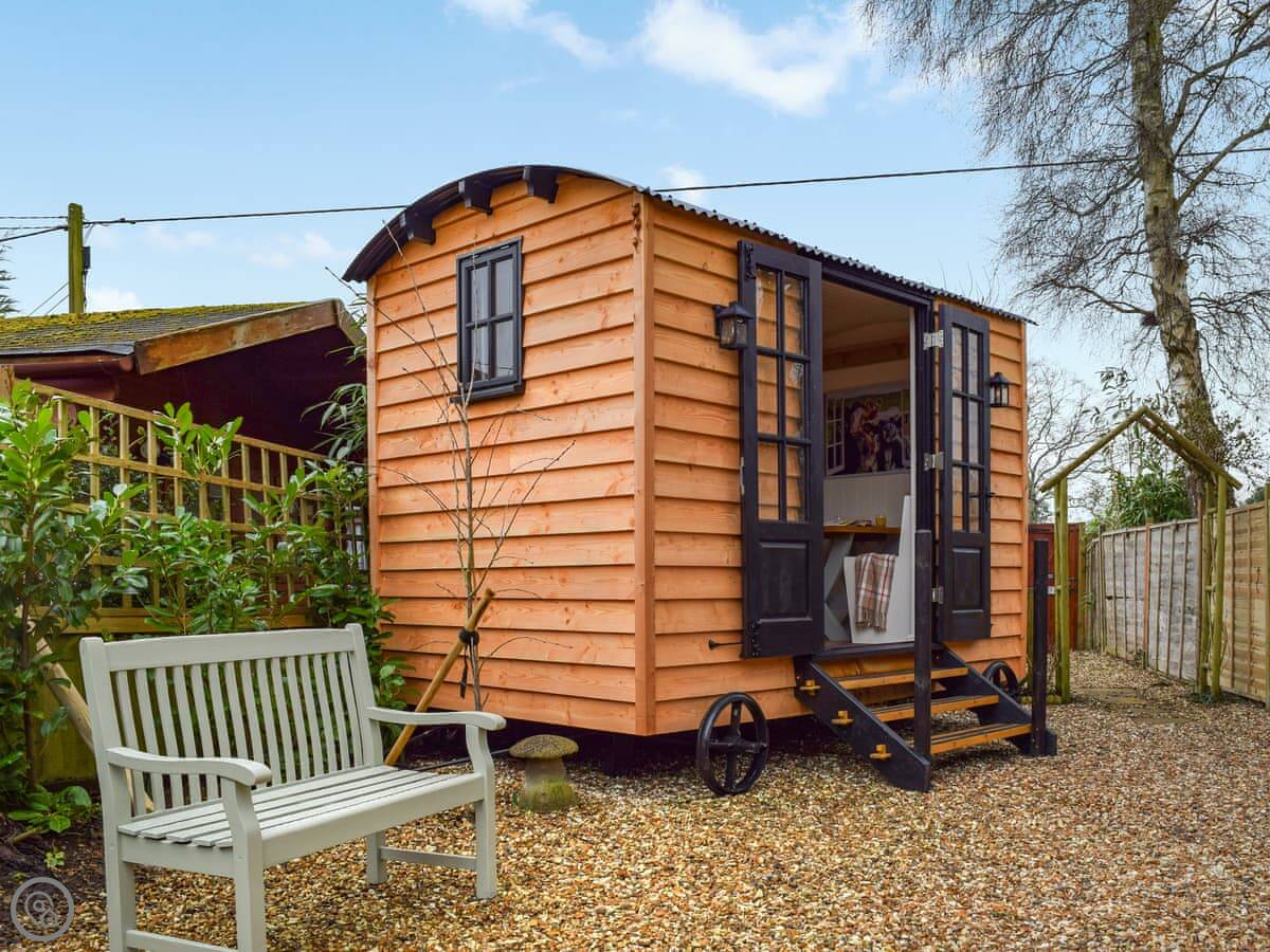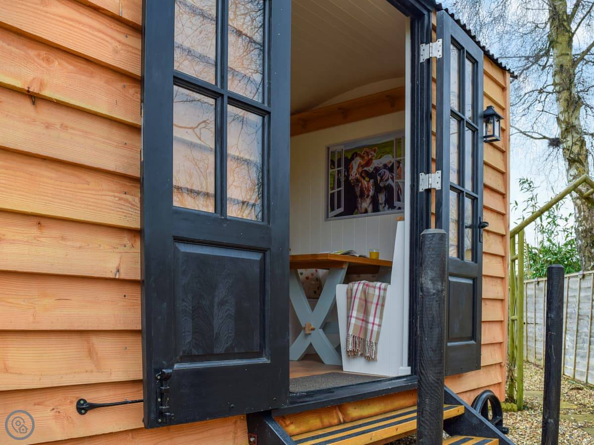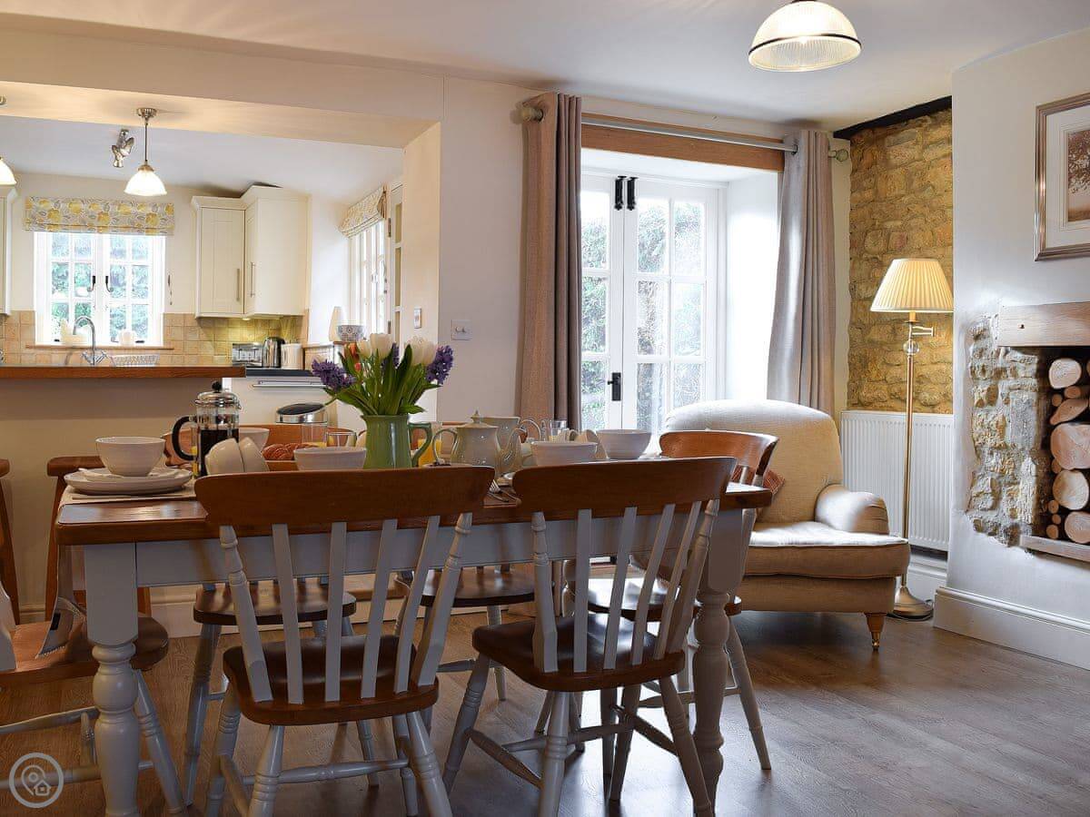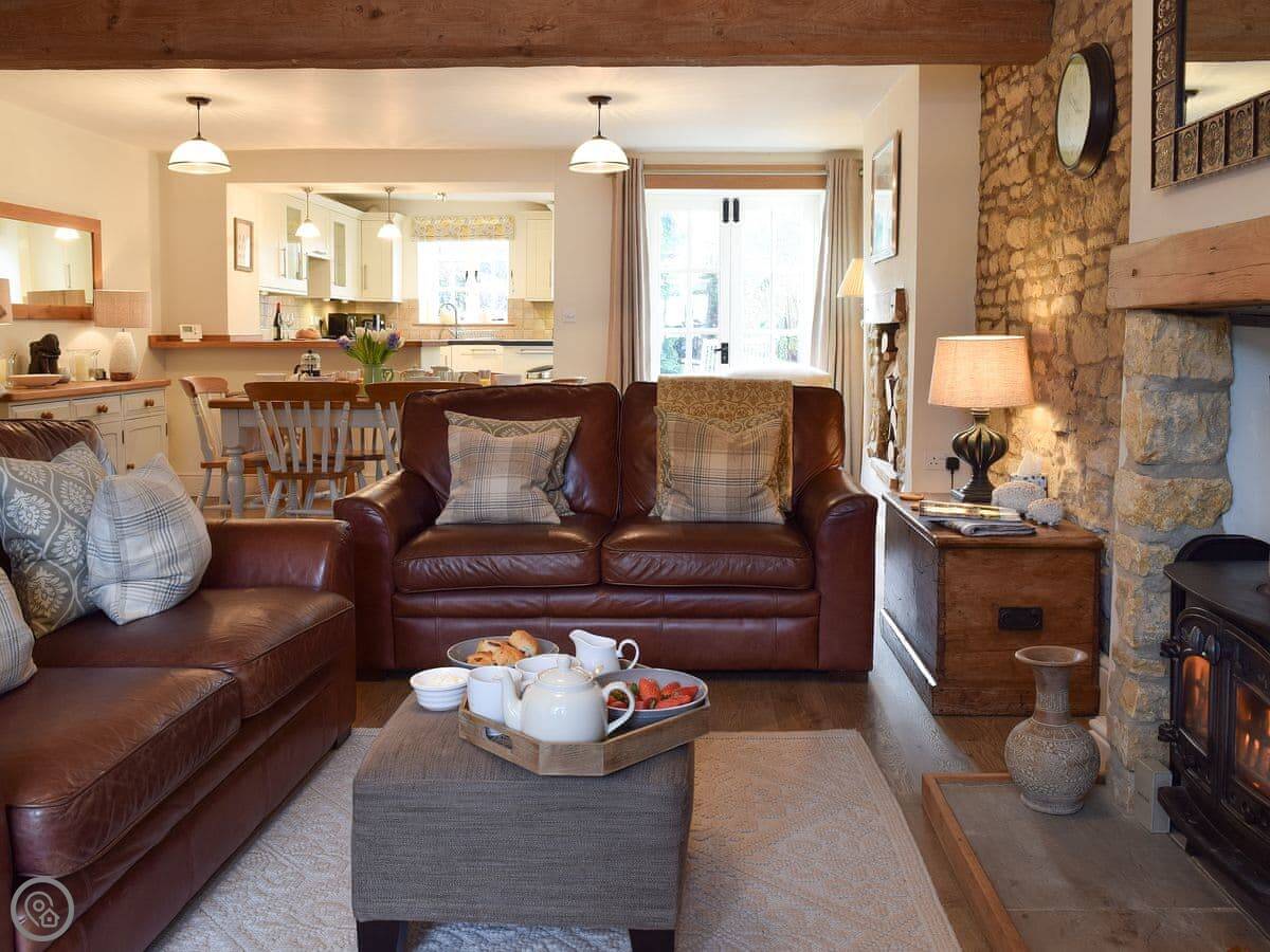 The living area is open plan, with a wood burner. There are beams and stone walls. The kitchen has what you need. Outside, there's an enclosed garden. It gets the sun. There's also a shepherd's hut in the garden. It's a quiet spot to sit. At the back of the garden, there's a gate that goes straight into the children's play park and the playing field.