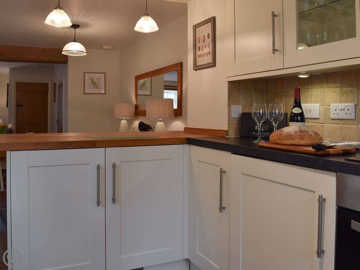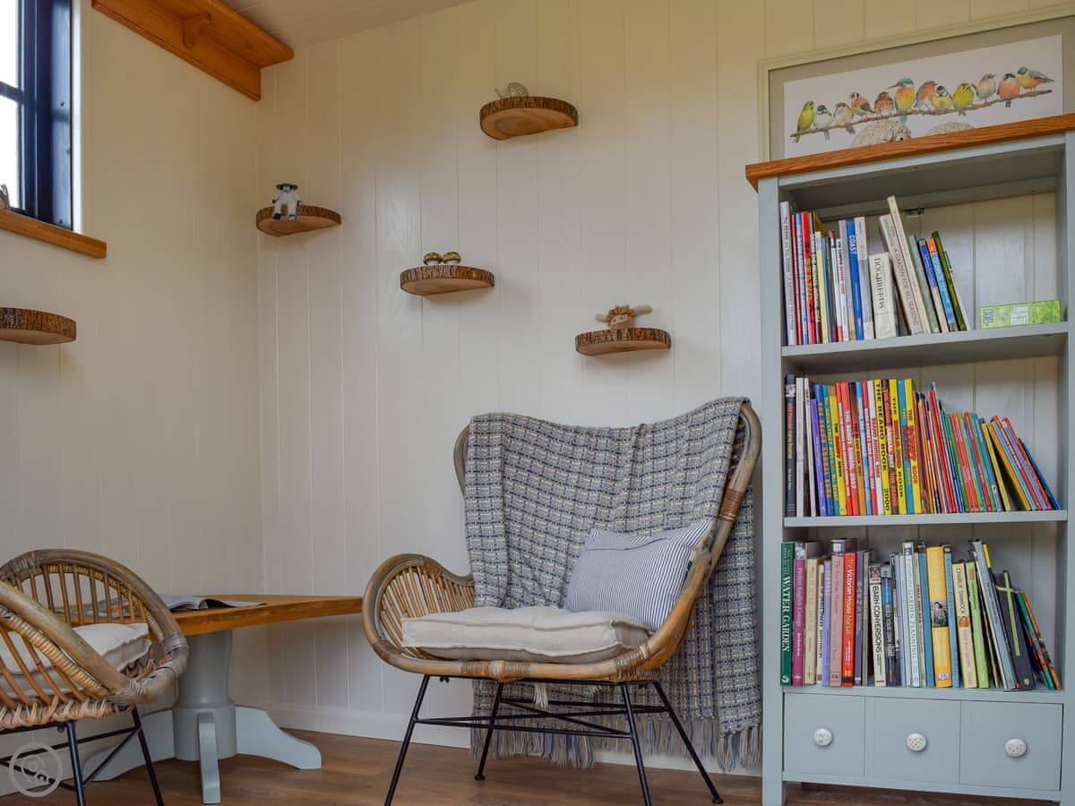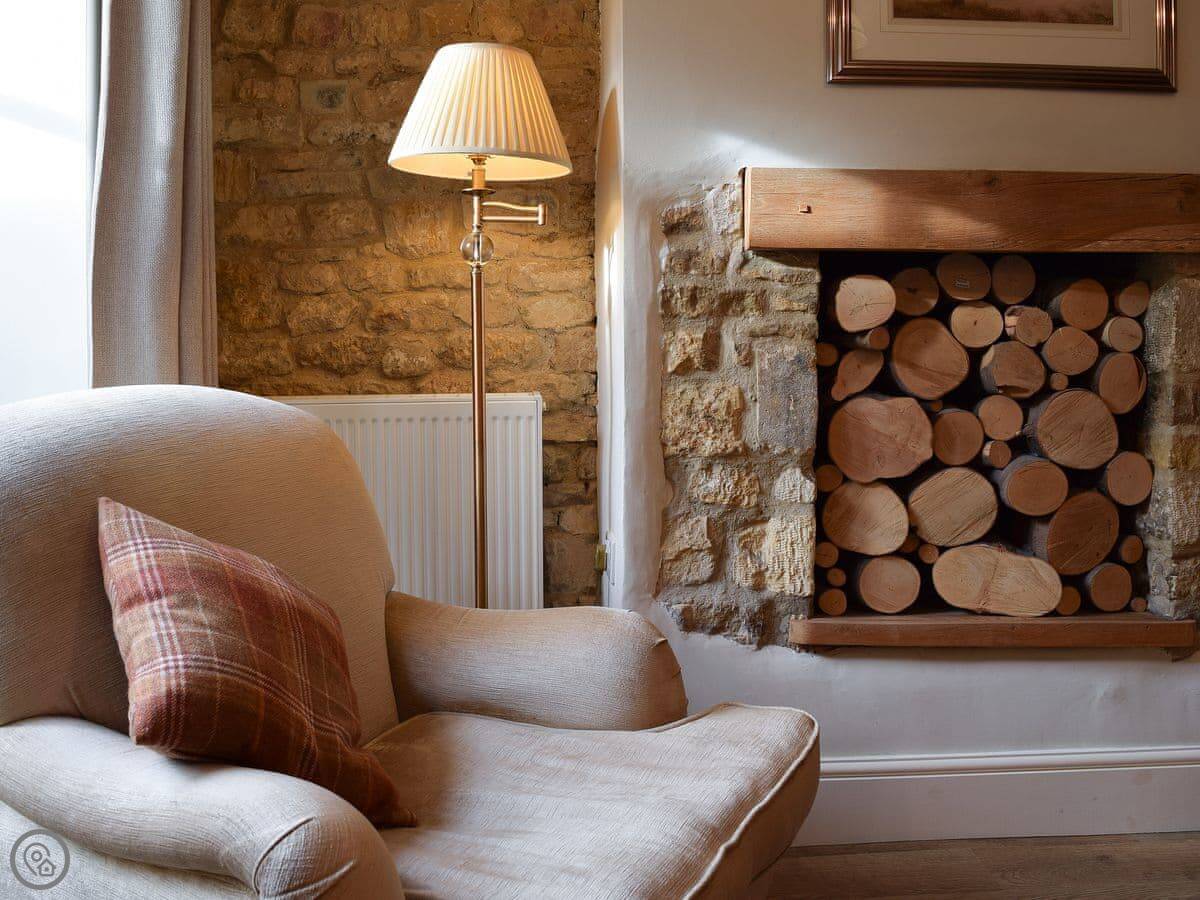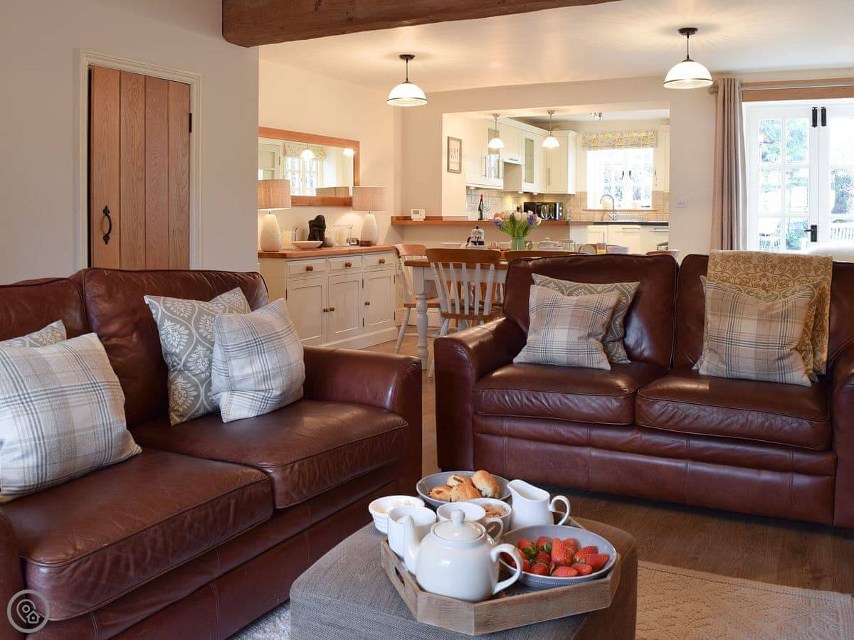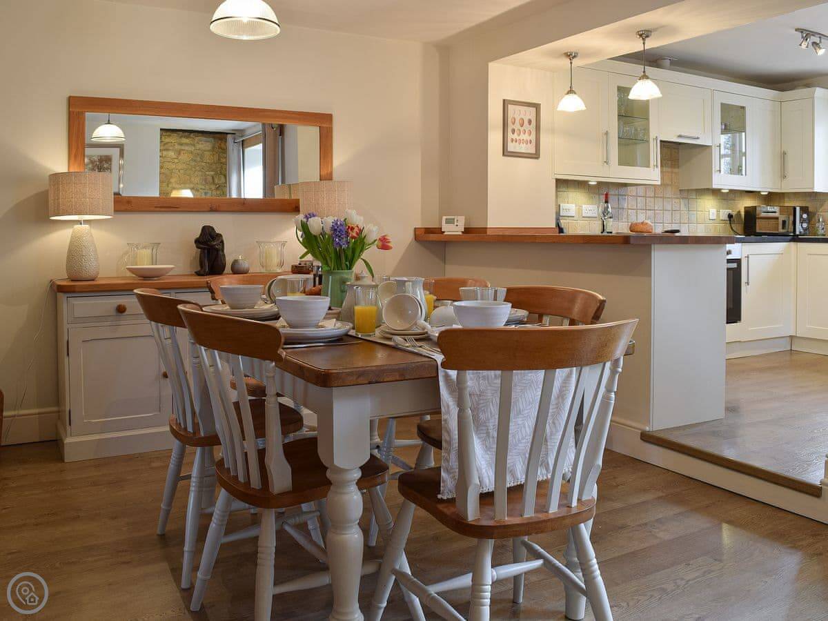 The living area is open plan, with a wood burner. There are beams and stone walls. The kitchen has what you need. Outside, there's an enclosed garden. It gets the sun. There's also a shepherd's hut in the garden. It's a quiet spot to sit. At the back of the garden, there's a gate that goes straight into the children's play park and the playing field.