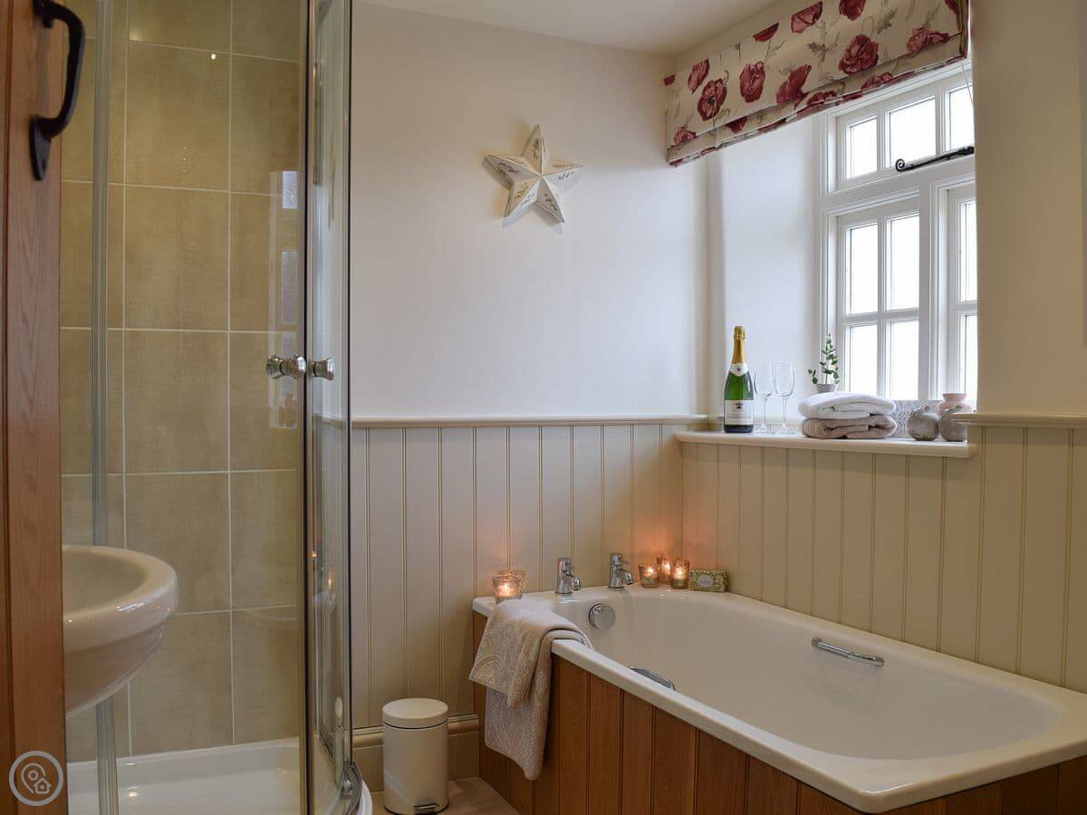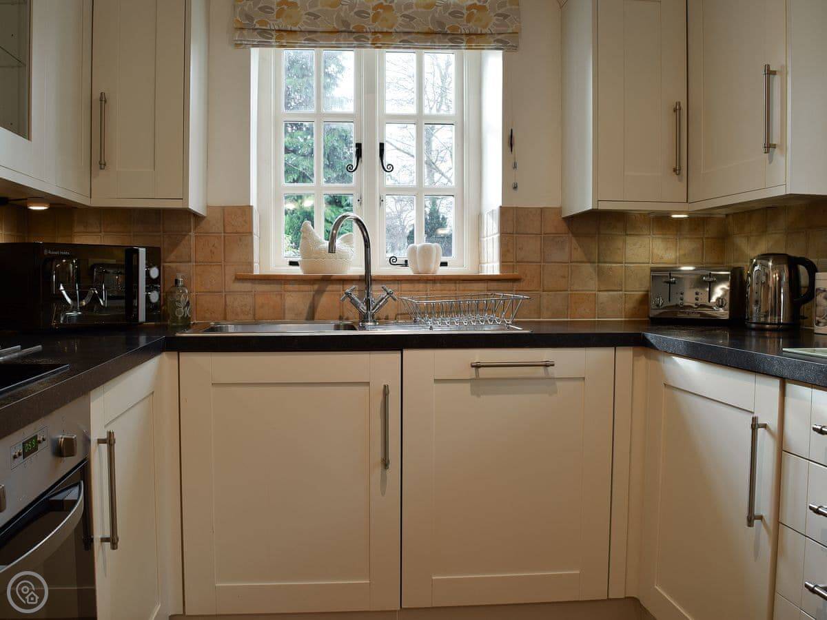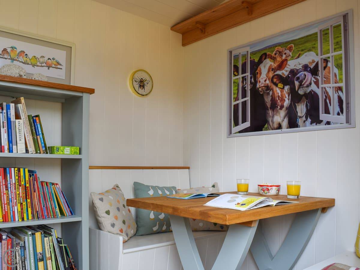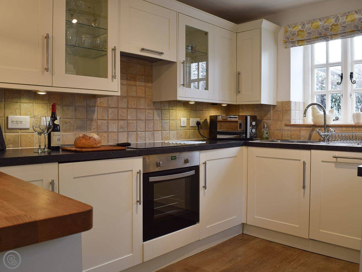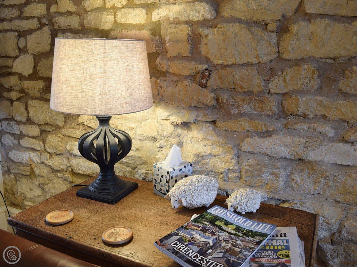 The living area is open plan, with a wood burner. There are beams and stone walls. The kitchen has what you need. Outside, there's an enclosed garden. It gets the sun. There's also a shepherd's hut in the garden. It's a quiet spot to sit. At the back of the garden, there's a gate that goes straight into the children's play park and the playing field.