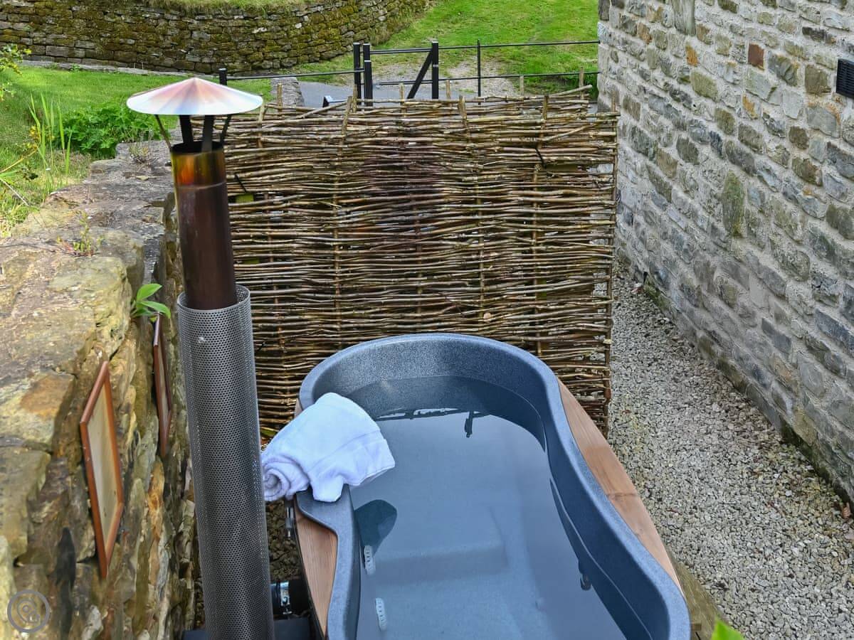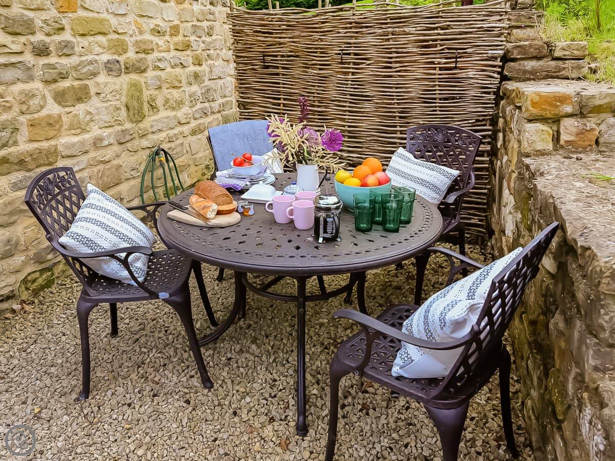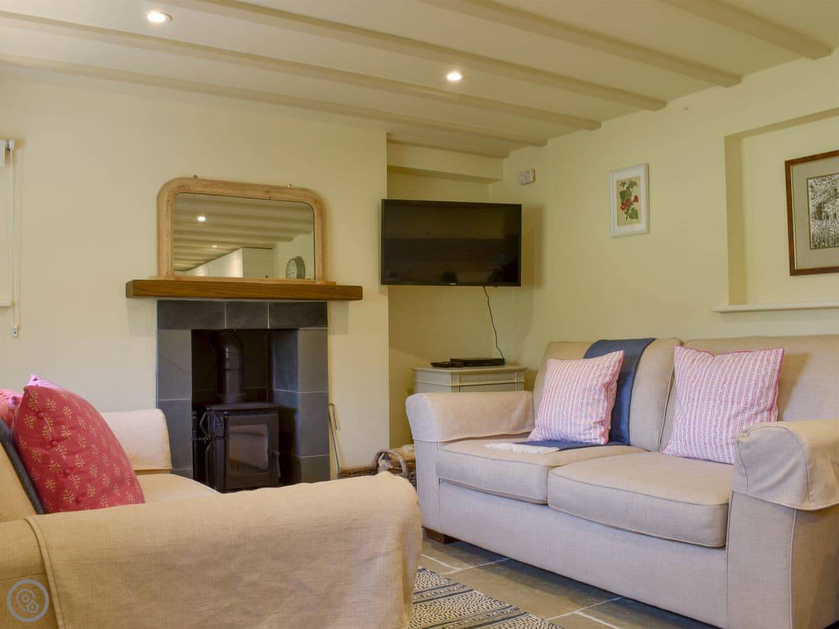 There's an open plan room downstairs with the kitchen, a table, and sofas around the wood burner. Stone floors. You've got a TV, WiFi, dishwasher, washing machine. Outside, there's a patio with seating and a BBQ.