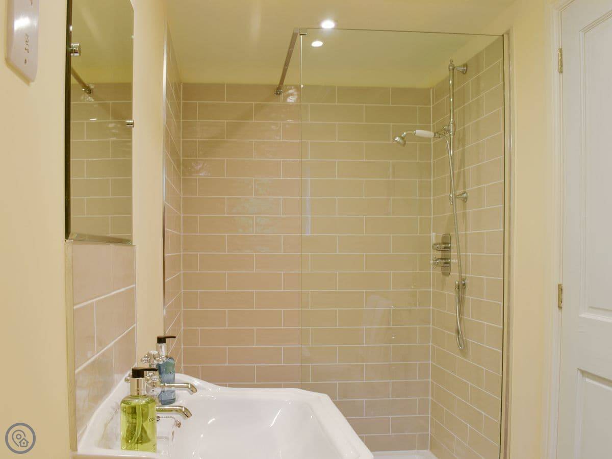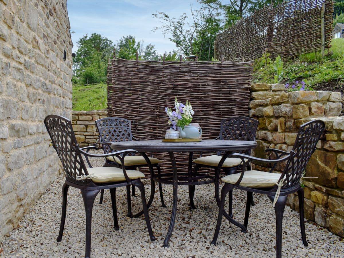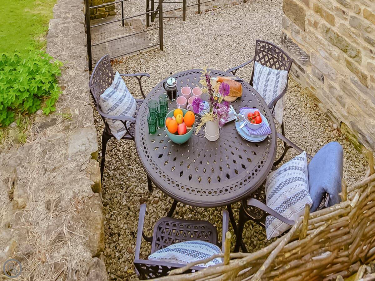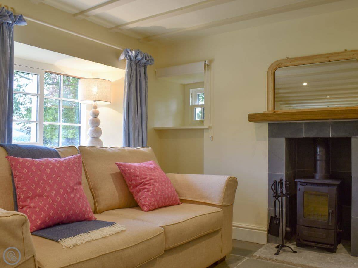 There's an open plan room downstairs with the kitchen, a table, and sofas around the wood burner. Stone floors. You've got a TV, WiFi, dishwasher, washing machine. Outside, there's a patio with seating and a BBQ.