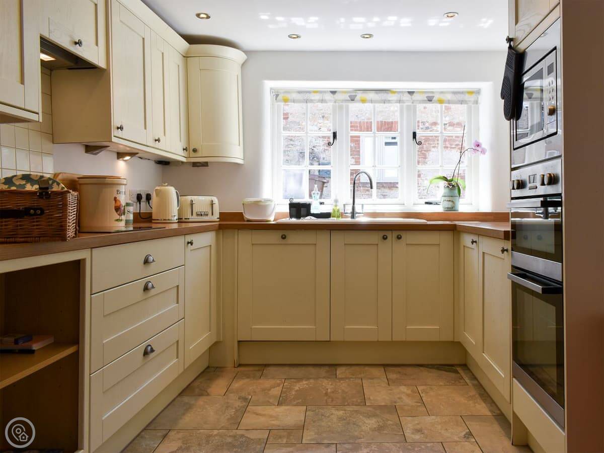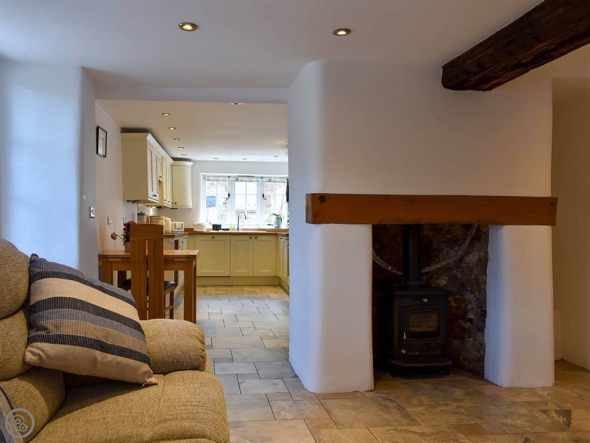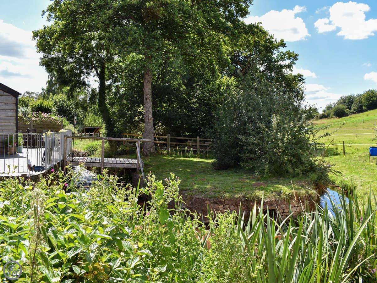 The living room has a wood burner. The kitchen looks out over the grounds. There's an enclosed patio out the back by a stream. You can park on site.