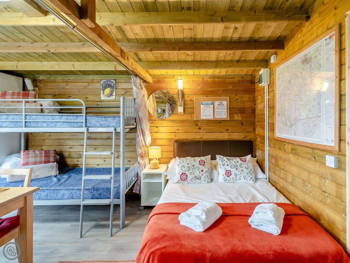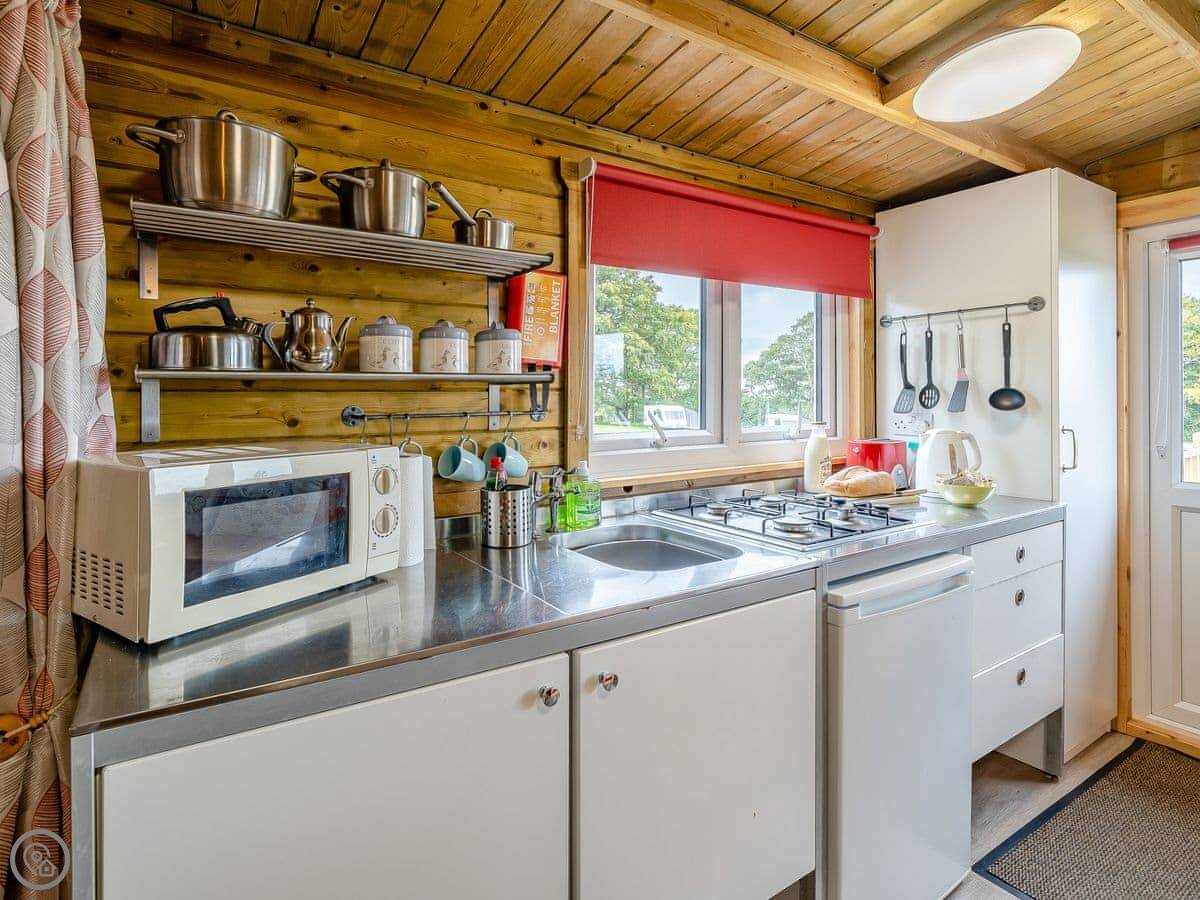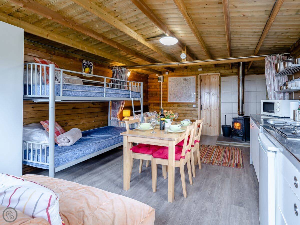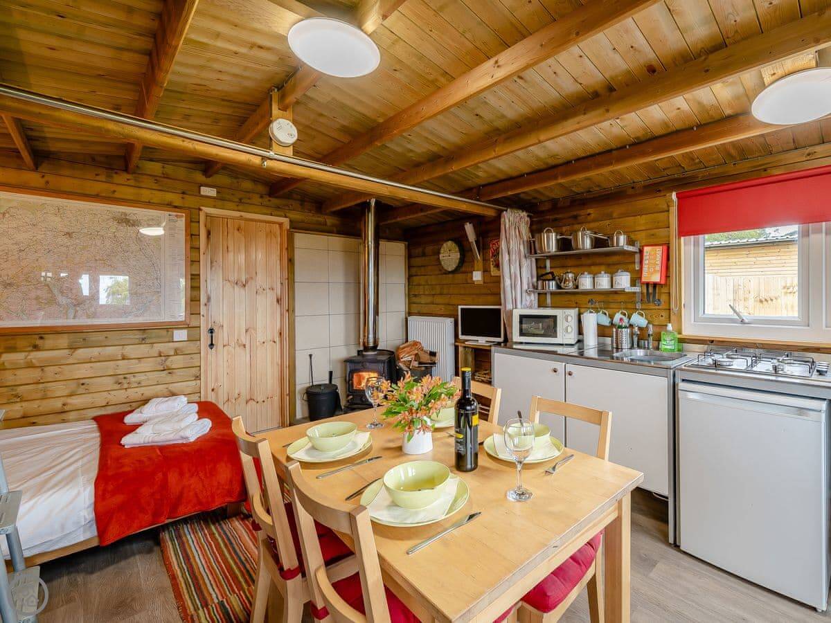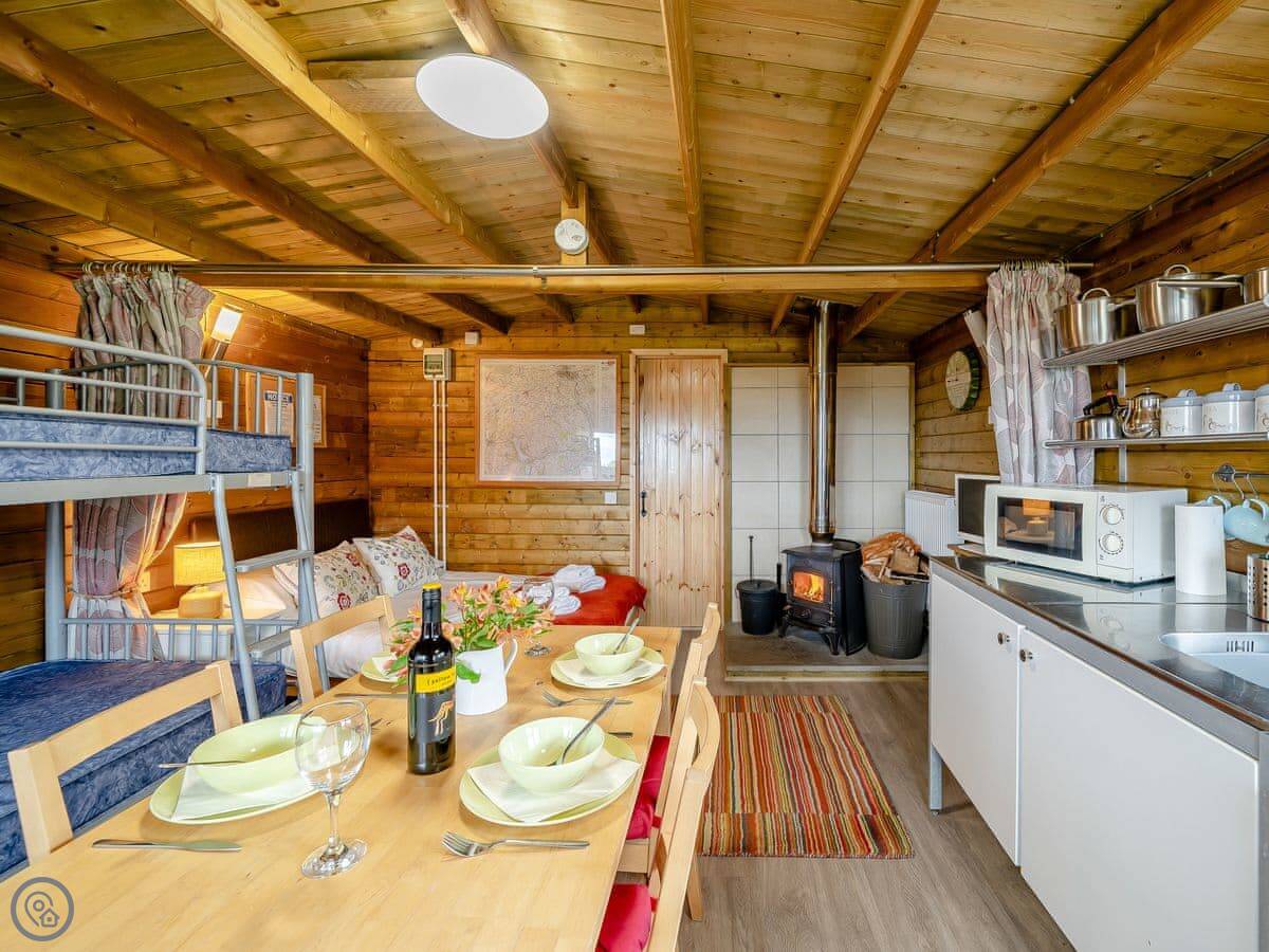 It's open plan inside, sleeps four, with one bedroom and one bathroom. It's got a 3 Star rating. That means it's comfortable and clean. The main feature is the wood burner, which is nice to have on in the evenings.