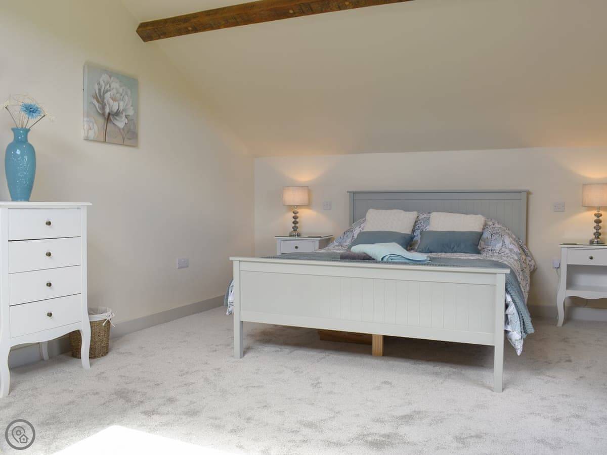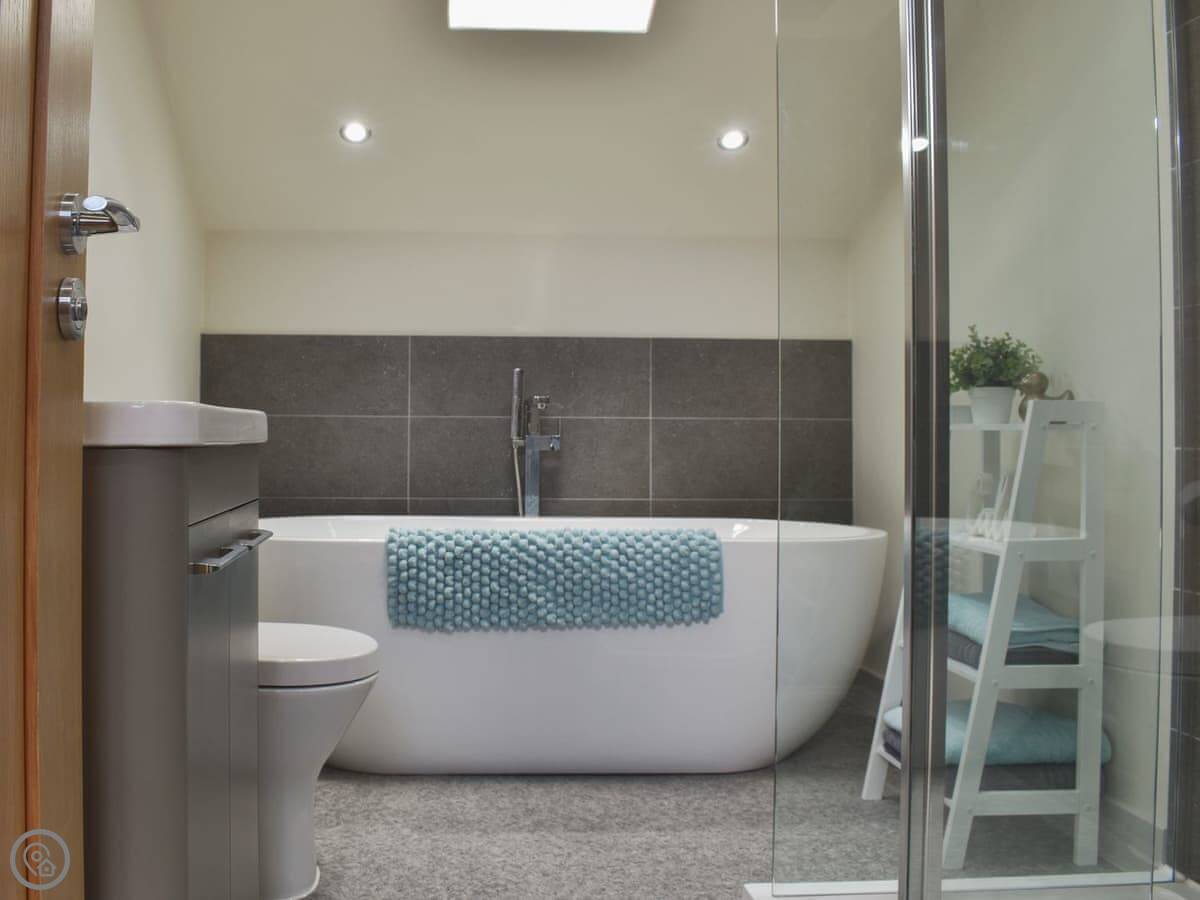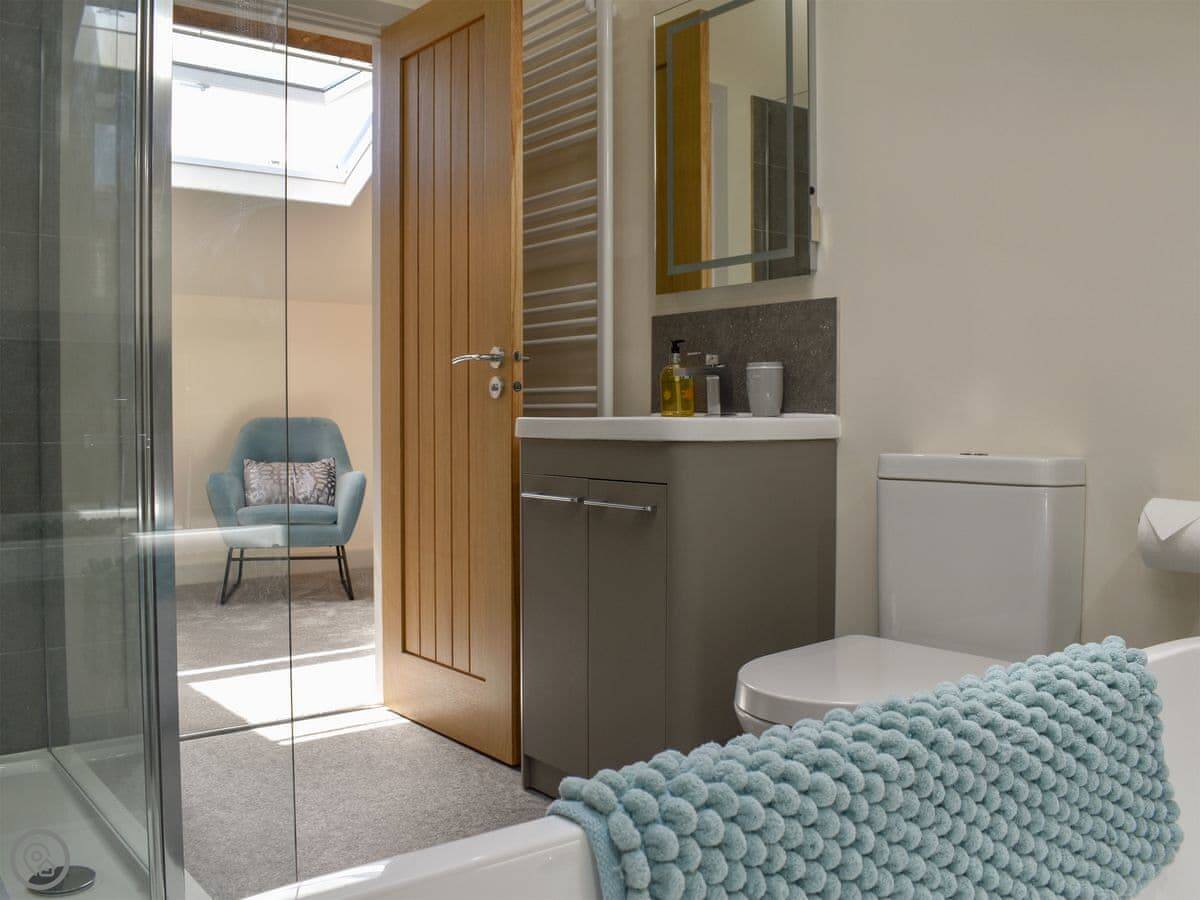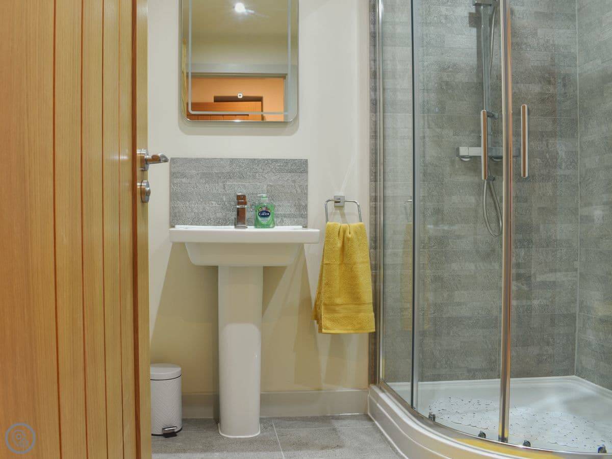 It sleeps four. Two bedrooms, both doubles, and two bathrooms. One bedroom and a shower room are downstairs, the other bedroom with its en-suite is upstairs. It's got a 5 Star rating, which means it's well finished. Everything's new and works properly. It's also wheelchair accessible at the entrance and on the ground floor, but check with us about specific needs.