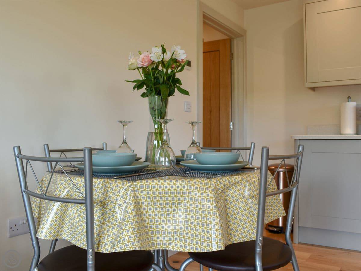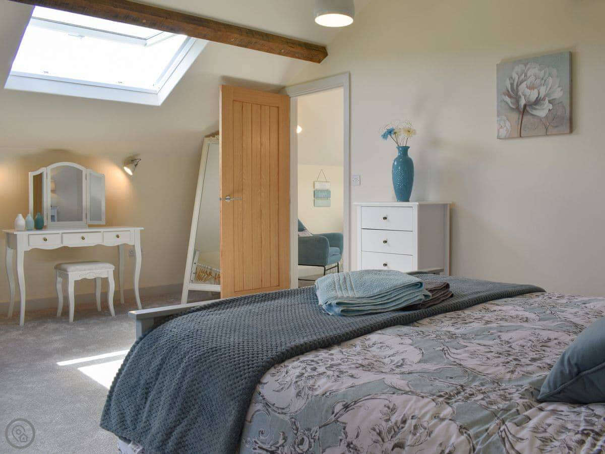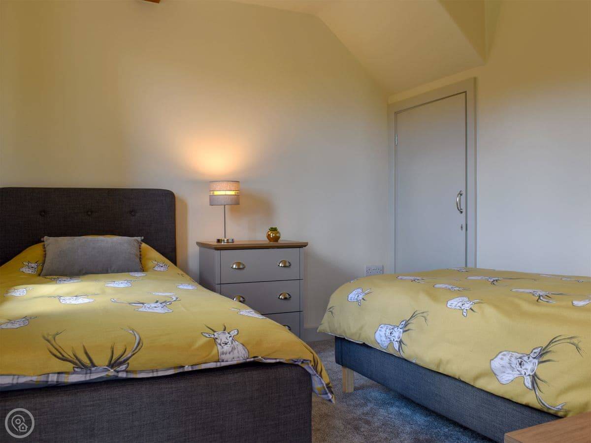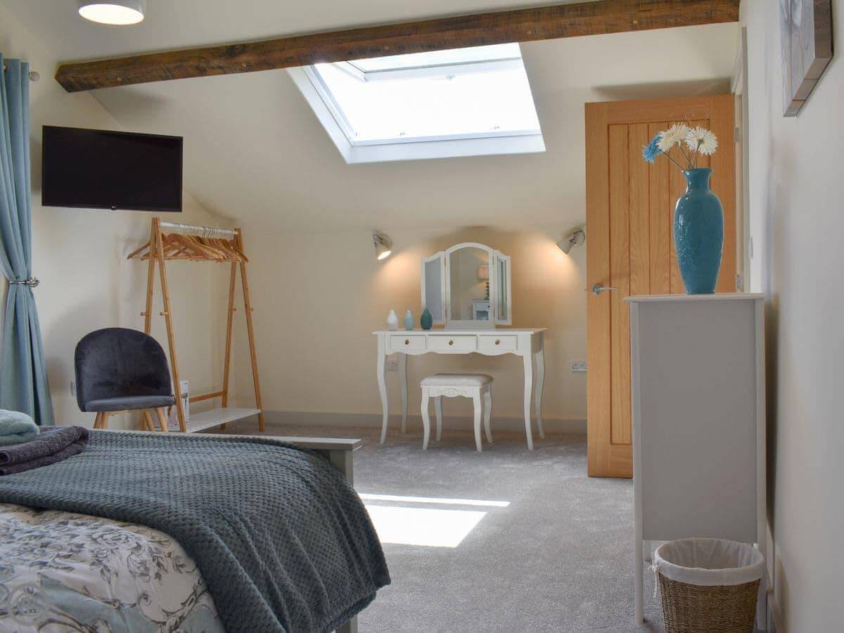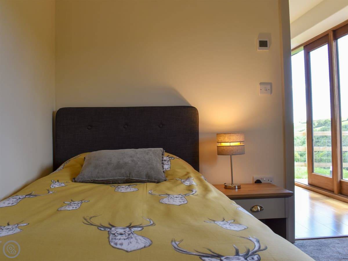 It sleeps four. Two bedrooms, both doubles, and two bathrooms. One bedroom and a shower room are downstairs, the other bedroom with its en-suite is upstairs. It's got a 5 Star rating, which means it's well finished. Everything's new and works properly. It's also wheelchair accessible at the entrance and on the ground floor, but check with us about specific needs.