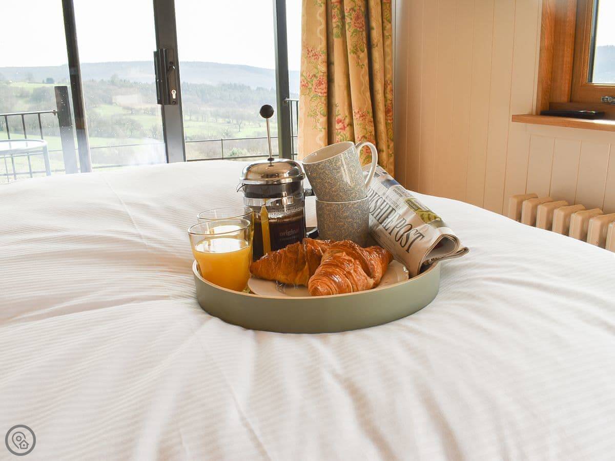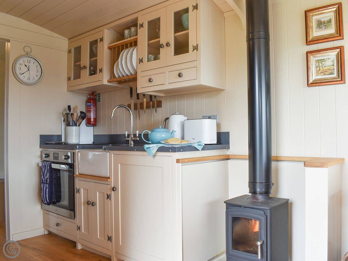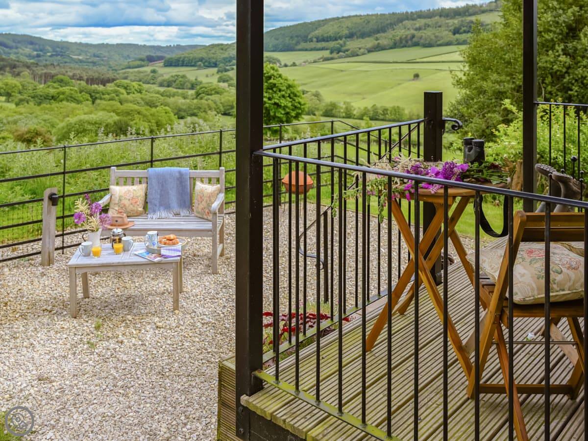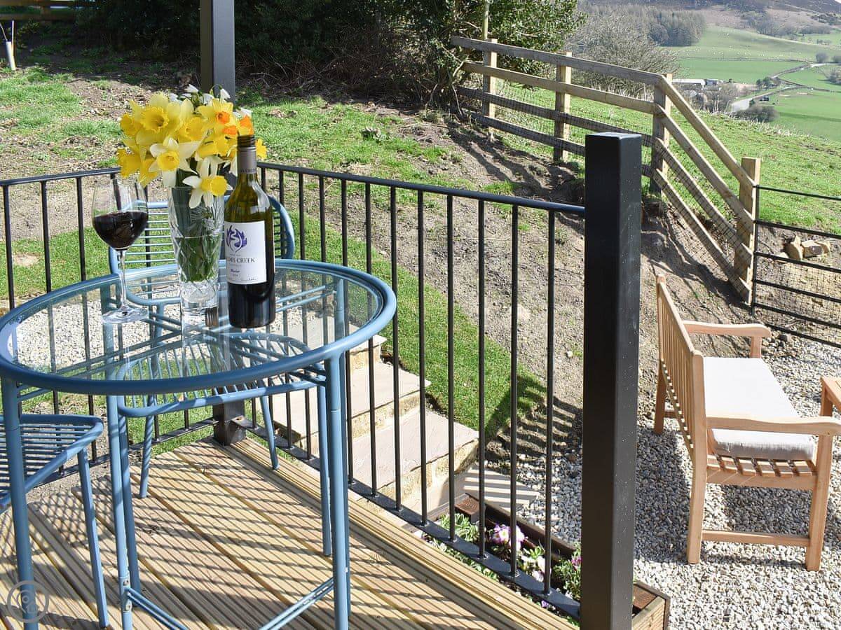 Inside, there's a wood burner for heat. We leave you some local bits to eat when you arrive. Outside, it's in the old orchard. There's a deck with chairs that looks out over the valley.
