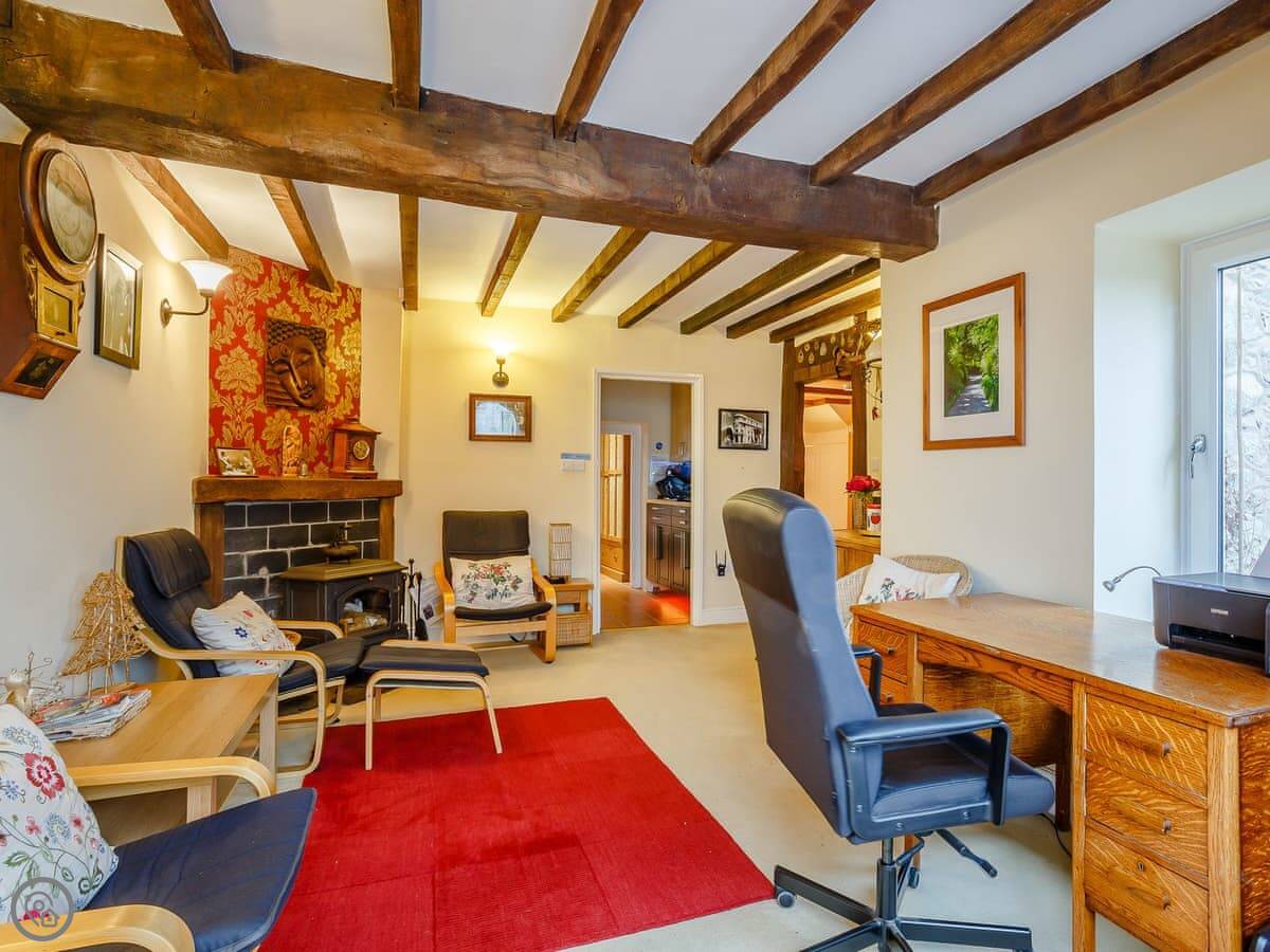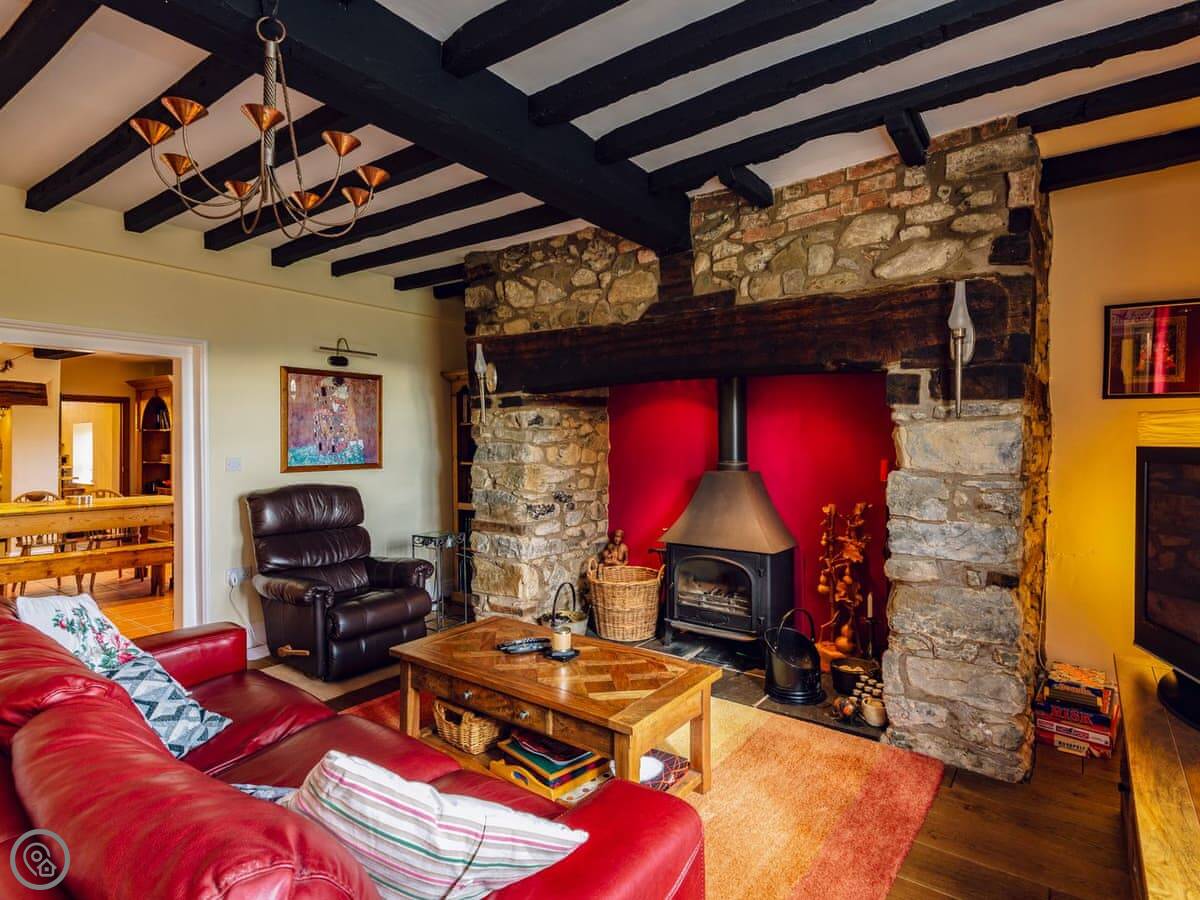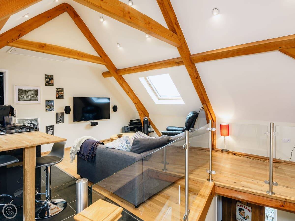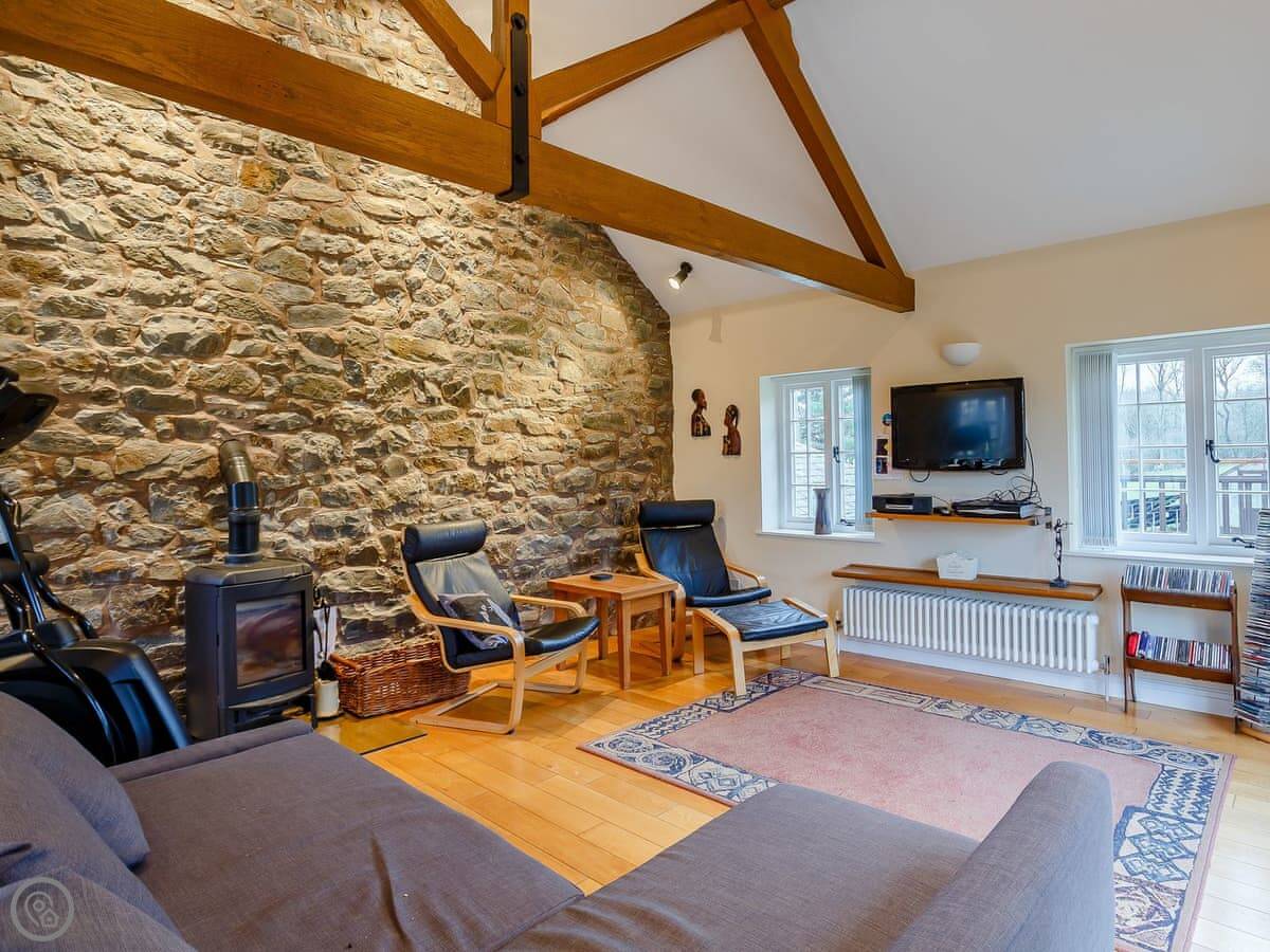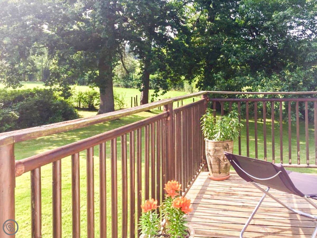 There is a spacious traditional farmhouse kitchen with large pine table and Aga. Through the old pantry doorway is a kitchen with full gas range and electric oven. The living room has a cosy wood burner and exposed beams and there’s a conservatory with seating for six people and a second living room has exposed beams and a stone and oak inglenook fireplace with large wood burner. The downstairs bedroom has a wood burner, solid wood floor and exposed beams. There is a modern, open-tread staircase from the hall which leads up to a very large attractive living room with a sofa bed. This large room has an exposed stone wall, oak floors, modern wood burner and four way folding patio doors leading onto an extensive wrap around wooden balcony overlooking the garden and mature trees. On the balcony are double swing seats and a fire basket.
