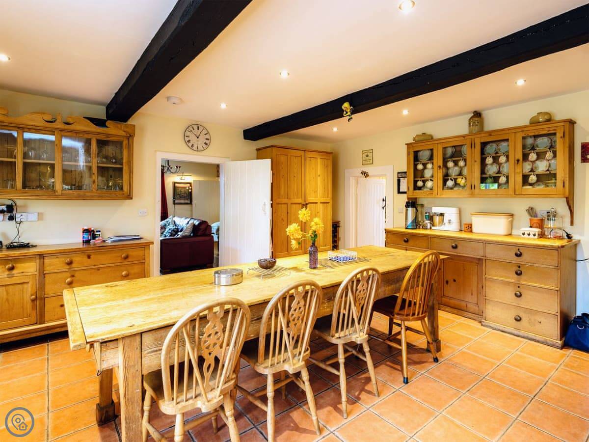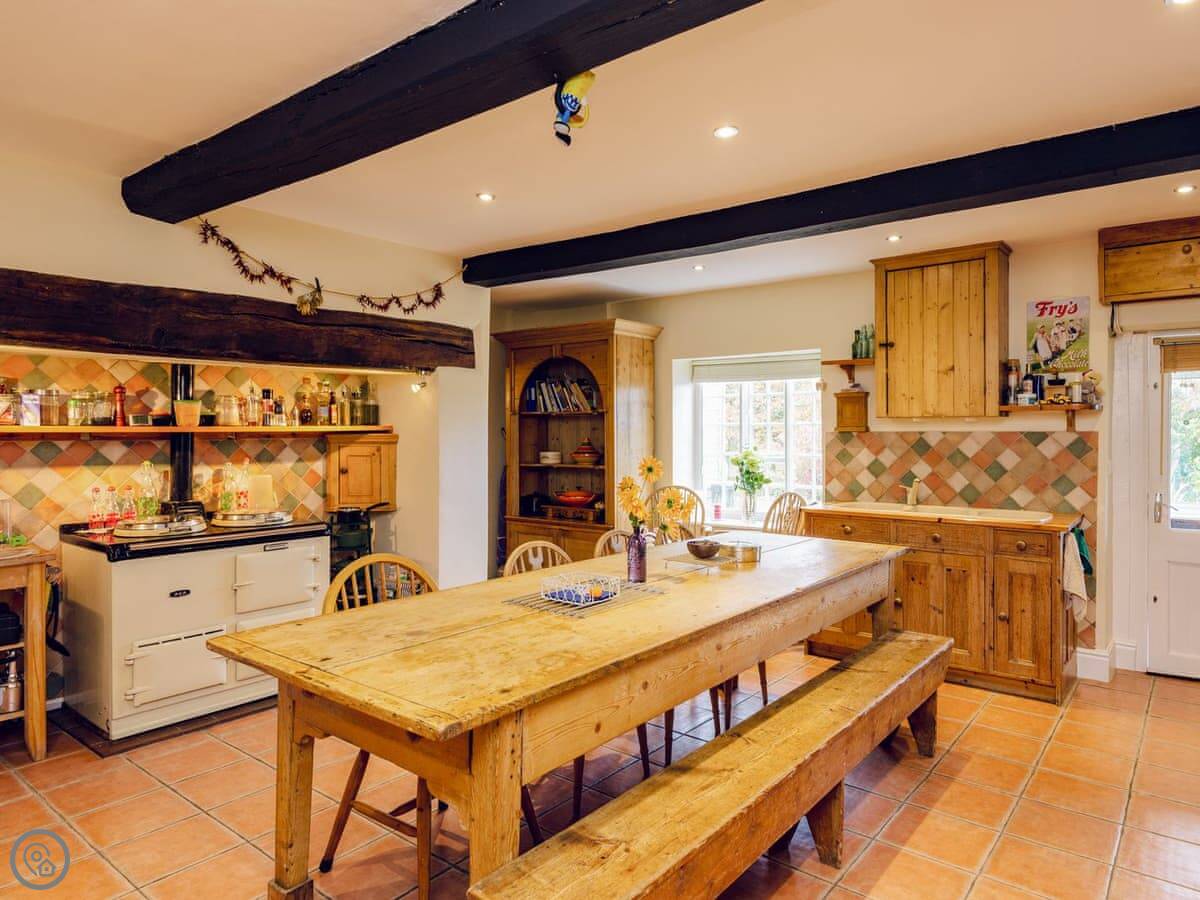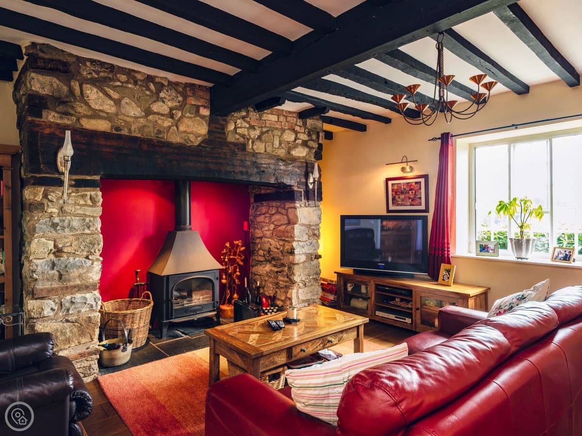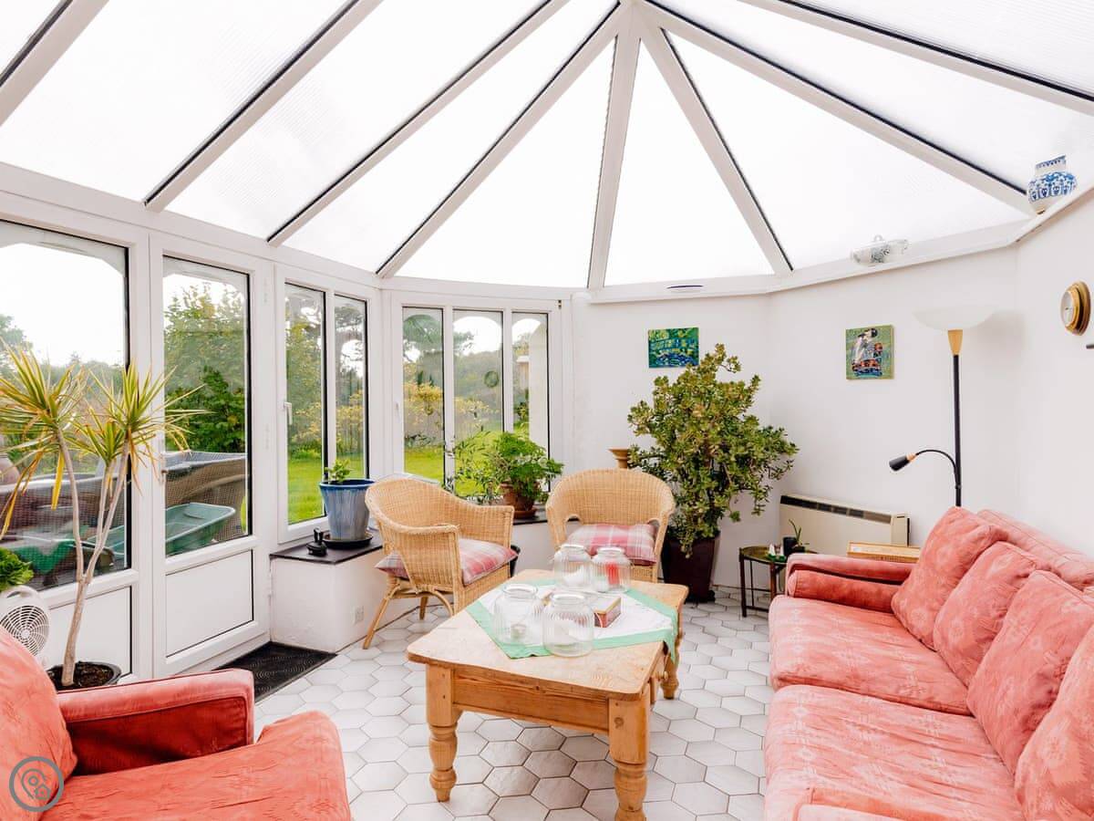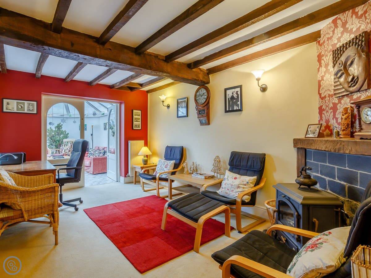 There is a spacious traditional farmhouse kitchen with large pine table and Aga. Through the old pantry doorway is a kitchen with full gas range and electric oven. The living room has a cosy wood burner and exposed beams and there’s a conservatory with seating for six people and a second living room has exposed beams and a stone and oak inglenook fireplace with large wood burner. The downstairs bedroom has a wood burner, solid wood floor and exposed beams. There is a modern, open-tread staircase from the hall which leads up to a very large attractive living room with a sofa bed. This large room has an exposed stone wall, oak floors, modern wood burner and four way folding patio doors leading onto an extensive wrap around wooden balcony overlooking the garden and mature trees. On the balcony are double swing seats and a fire basket.