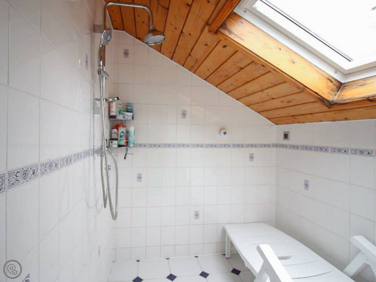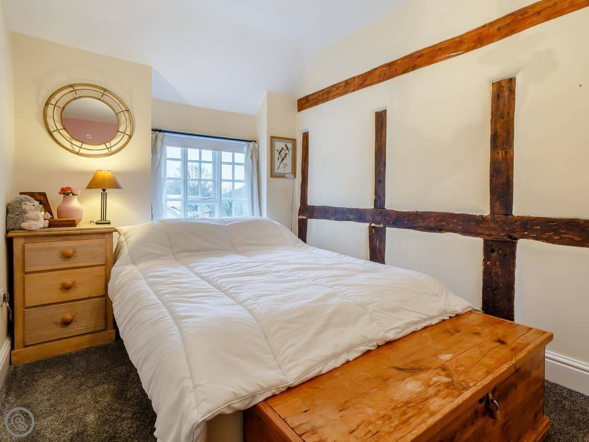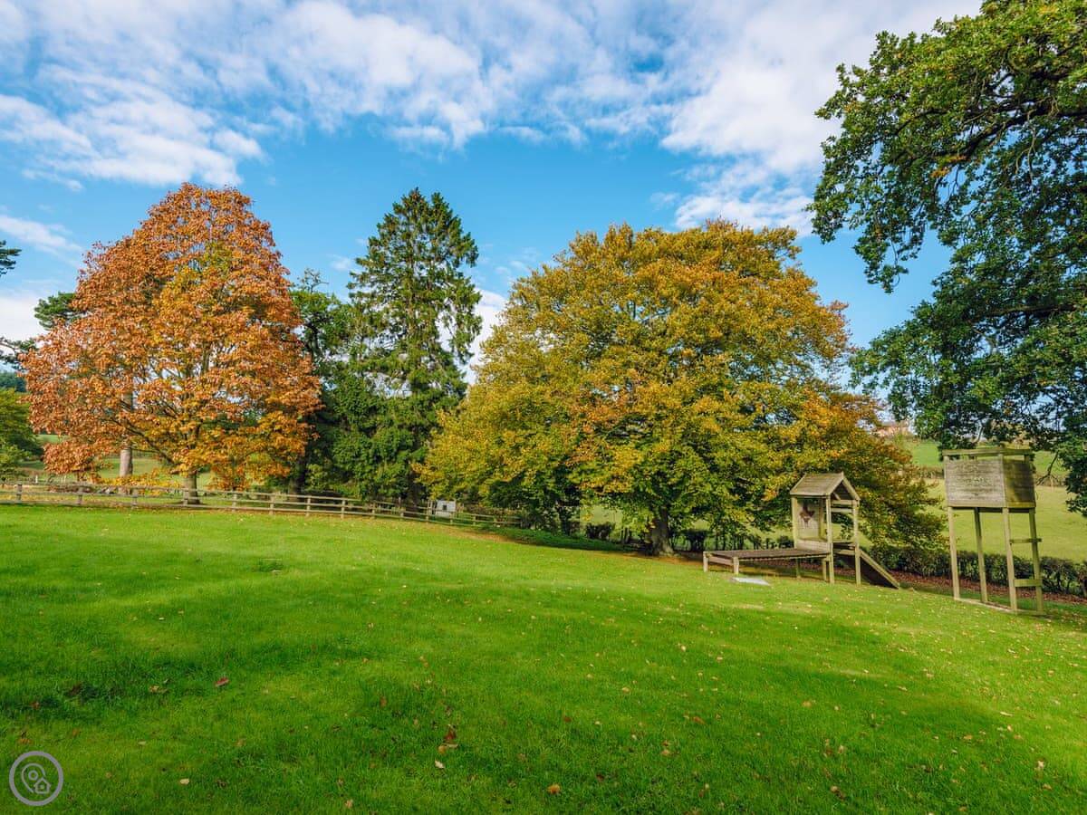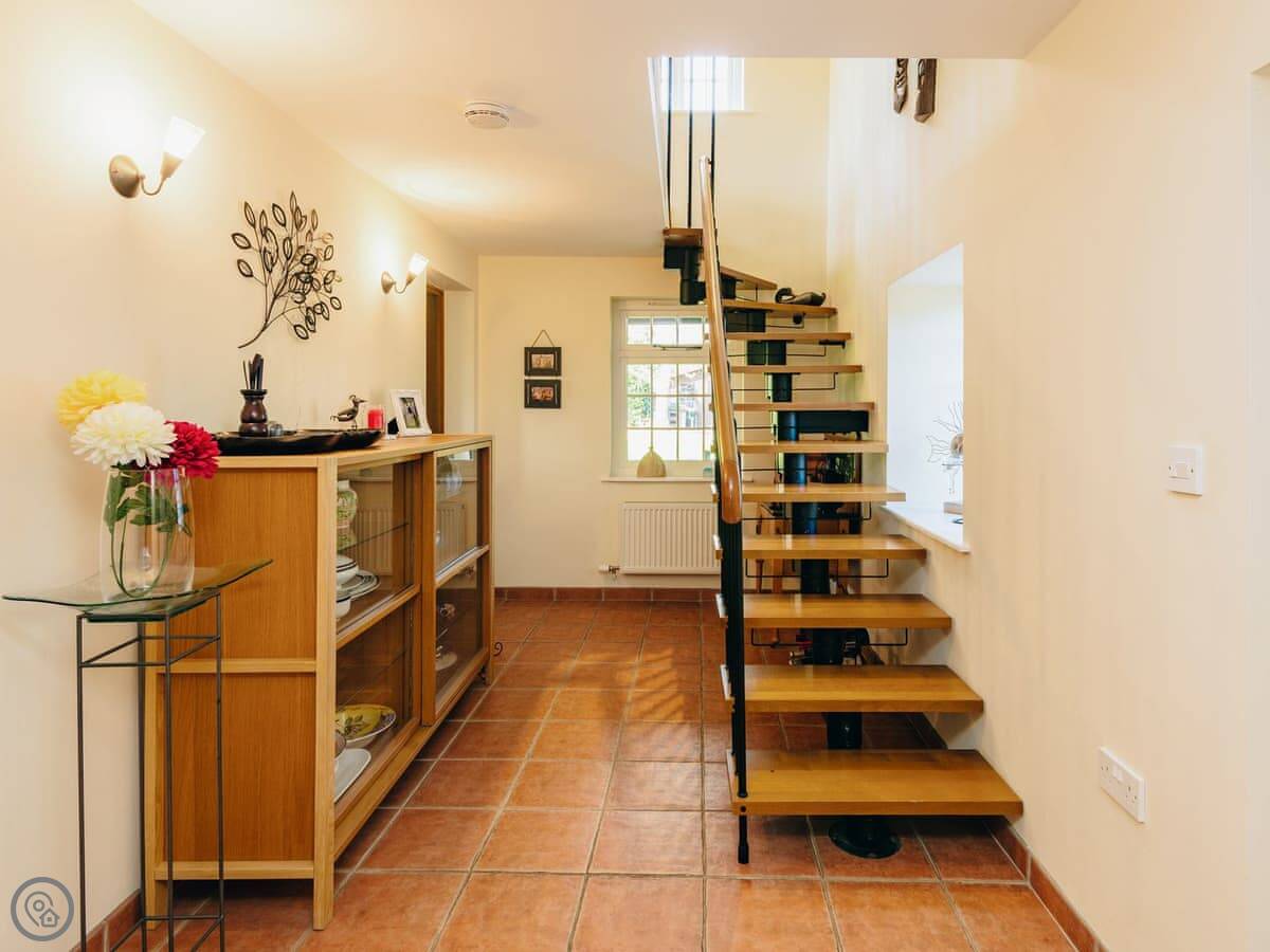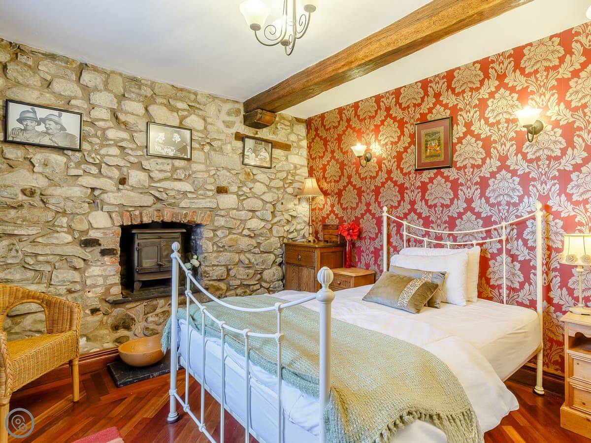 There is a spacious traditional farmhouse kitchen with large pine table and Aga. Through the old pantry doorway is a kitchen with full gas range and electric oven. The living room has a cosy wood burner and exposed beams and there’s a conservatory with seating for six people and a second living room has exposed beams and a stone and oak inglenook fireplace with large wood burner. The downstairs bedroom has a wood burner, solid wood floor and exposed beams. There is a modern, open-tread staircase from the hall which leads up to a very large attractive living room with a sofa bed. This large room has an exposed stone wall, oak floors, modern wood burner and four way folding patio doors leading onto an extensive wrap around wooden balcony overlooking the garden and mature trees. On the balcony are double swing seats and a fire basket.