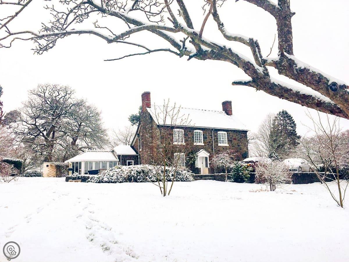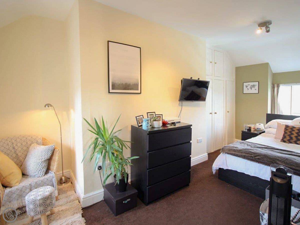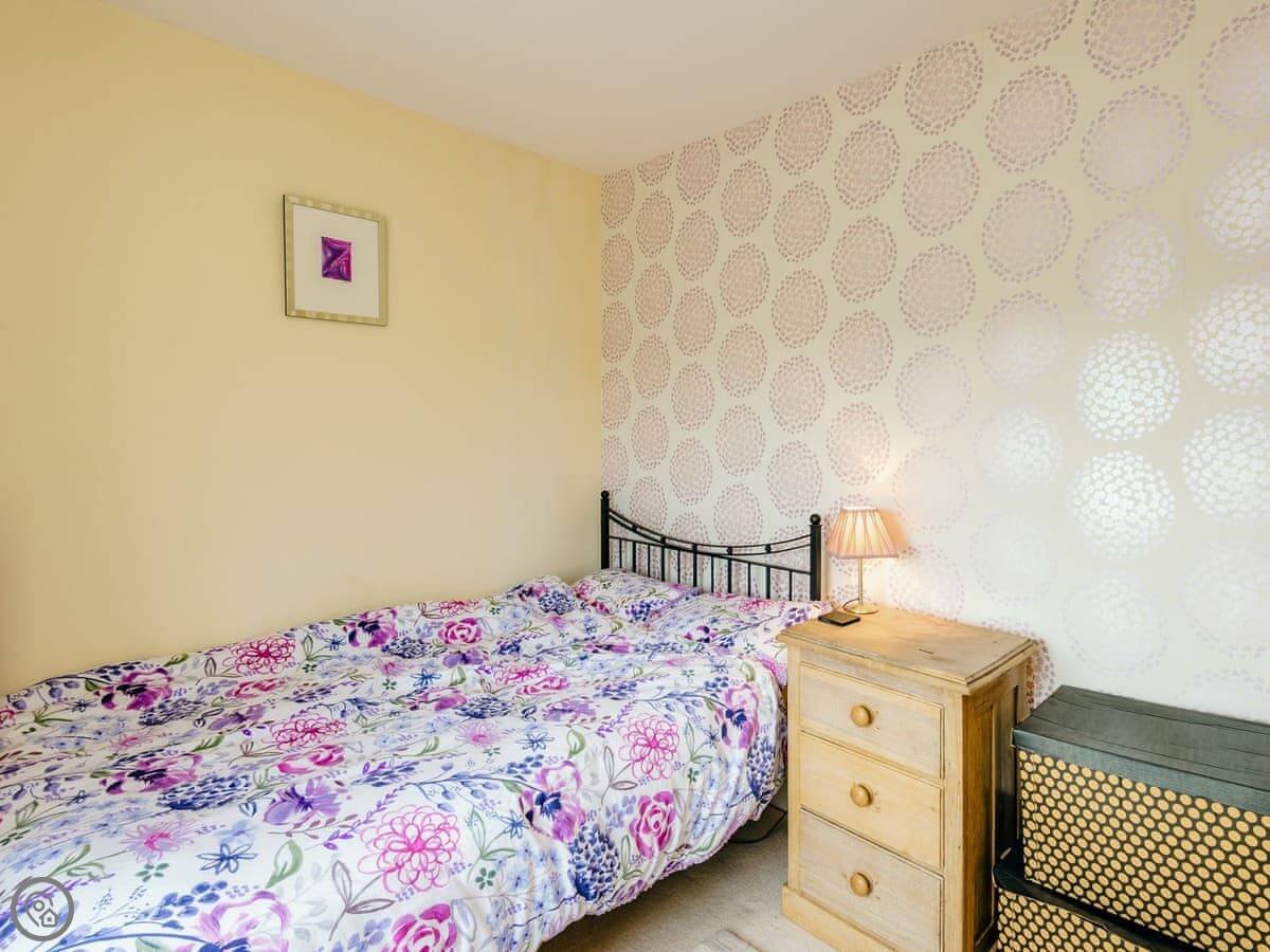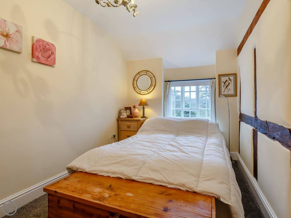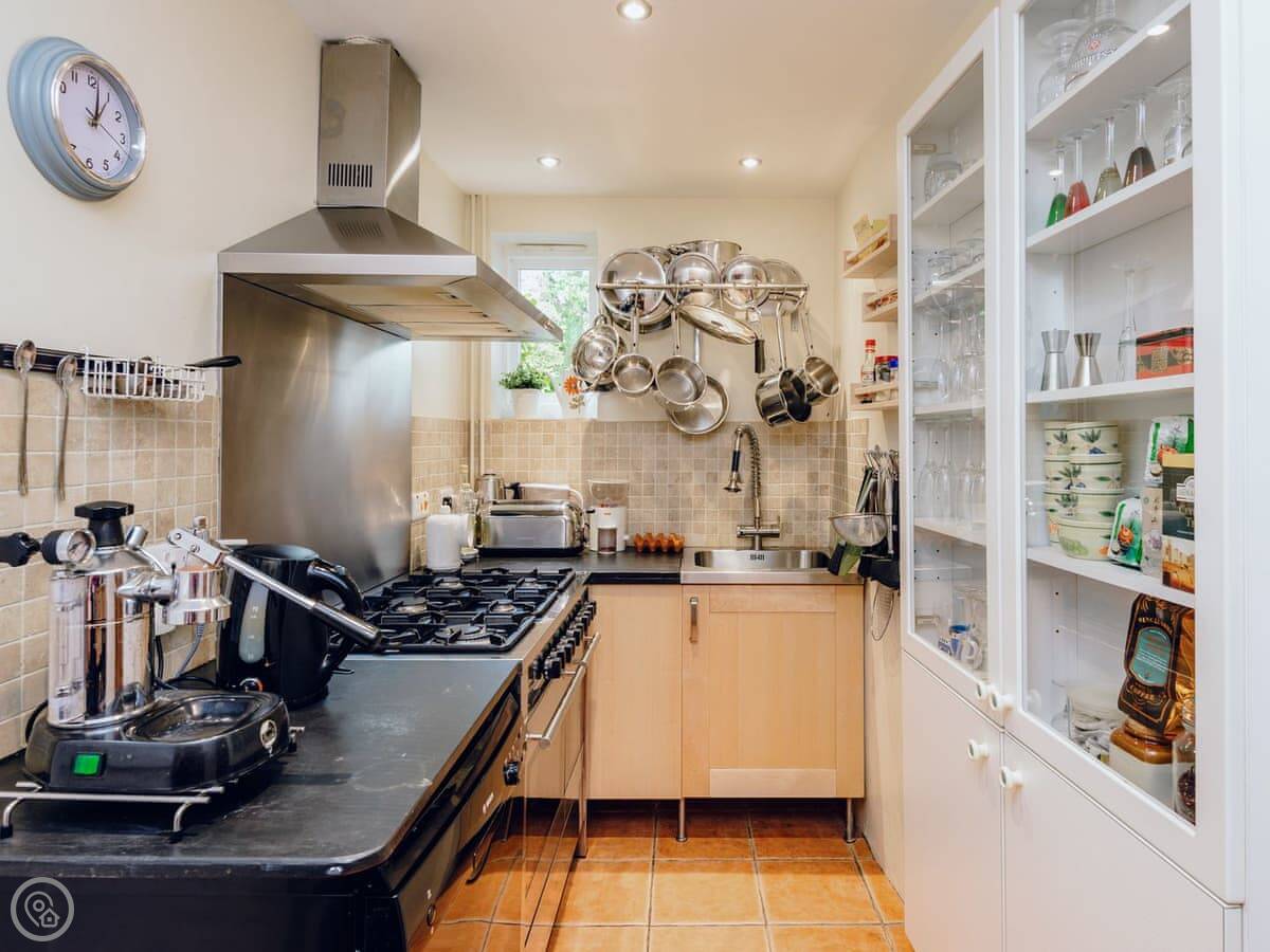 There is a spacious traditional farmhouse kitchen with large pine table and Aga. Through the old pantry doorway is a kitchen with full gas range and electric oven. The living room has a cosy wood burner and exposed beams and there’s a conservatory with seating for six people and a second living room has exposed beams and a stone and oak inglenook fireplace with large wood burner. The downstairs bedroom has a wood burner, solid wood floor and exposed beams. There is a modern, open-tread staircase from the hall which leads up to a very large attractive living room with a sofa bed. This large room has an exposed stone wall, oak floors, modern wood burner and four way folding patio doors leading onto an extensive wrap around wooden balcony overlooking the garden and mature trees. On the balcony are double swing seats and a fire basket.