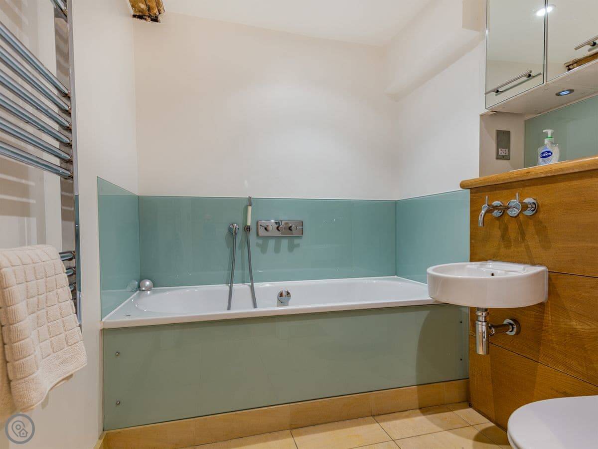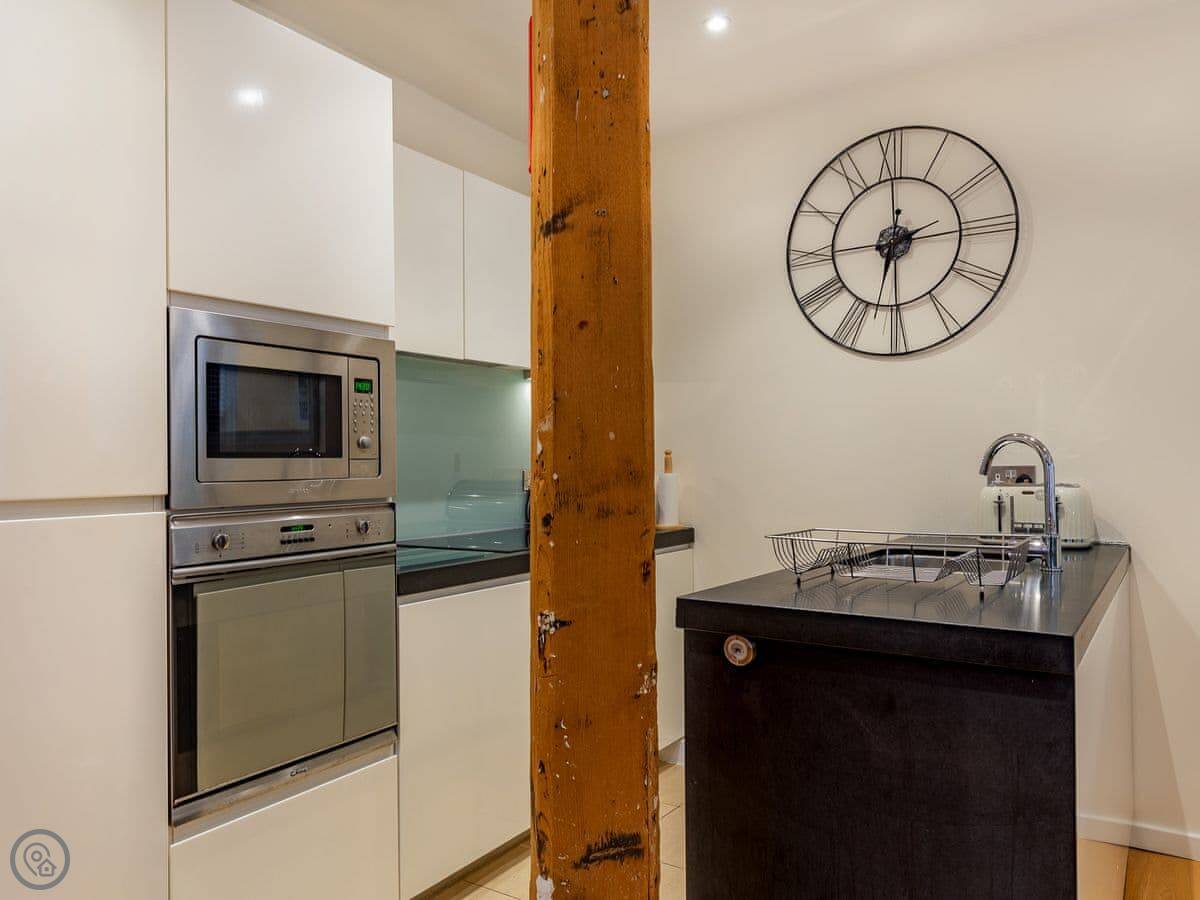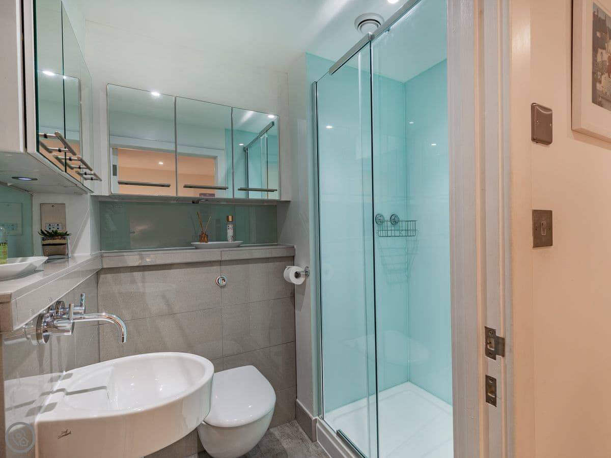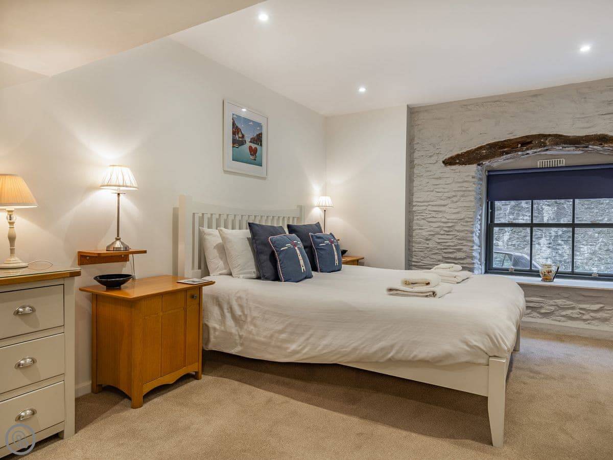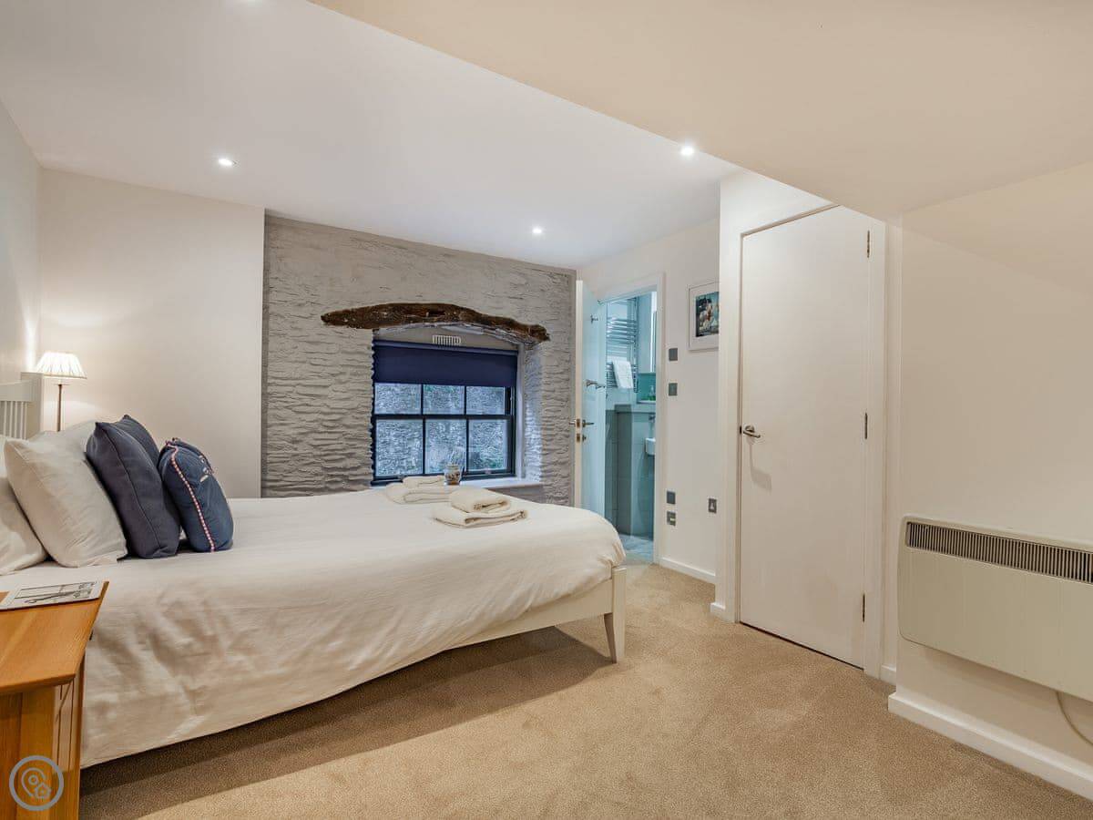It sleeps two, one bedroom with a kingsize bed. There are two bathrooms, one is an en-suite shower room downstairs with the bedroom, and there's another bathroom with a bath upstairs. The stairs inside the apartment go down to the bedroom, they're fine but typical for an old building.