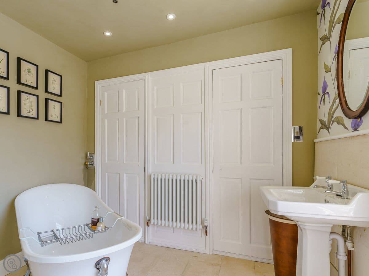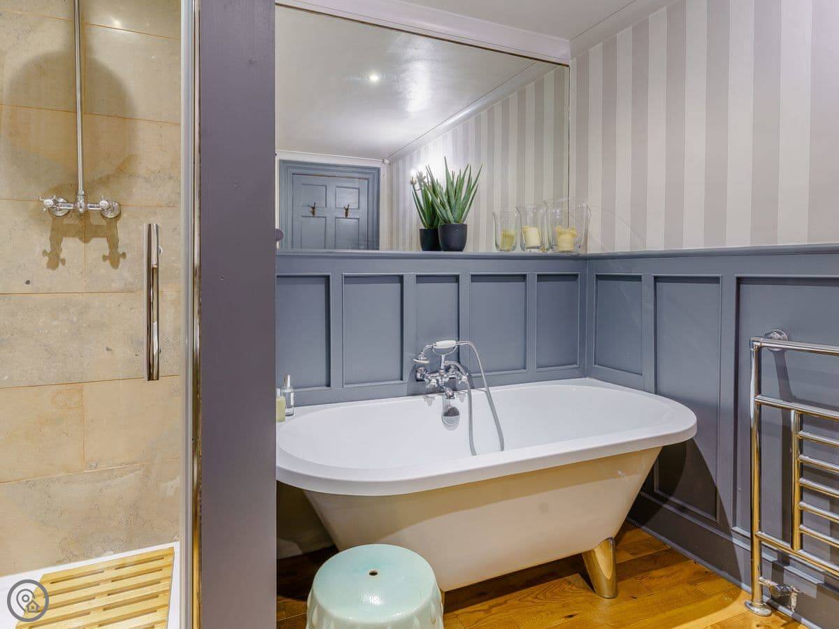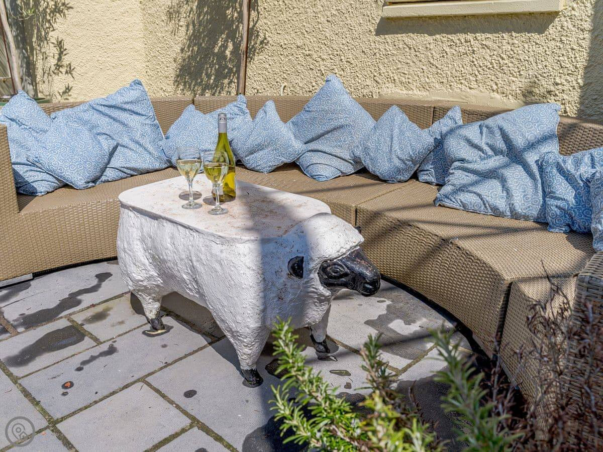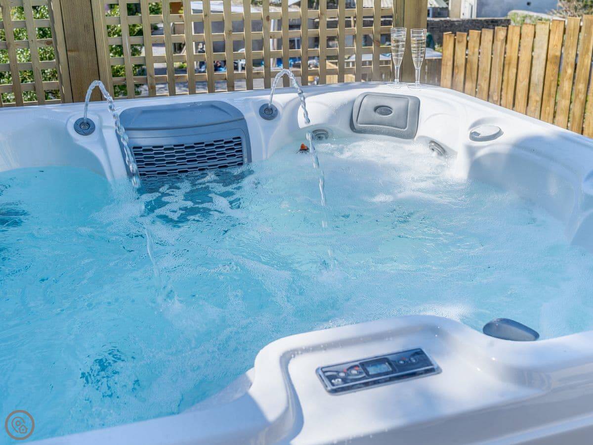 Outside, there's an enclosed garden and a patio with a hot tub. It gets the sun in the afternoon. You can eat out there if the weather's good.