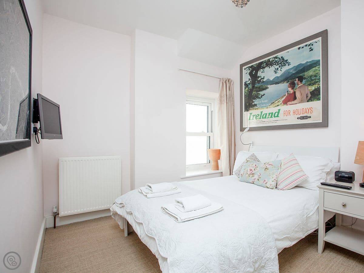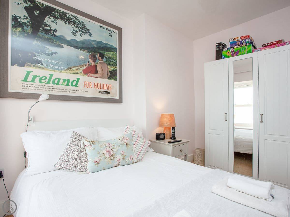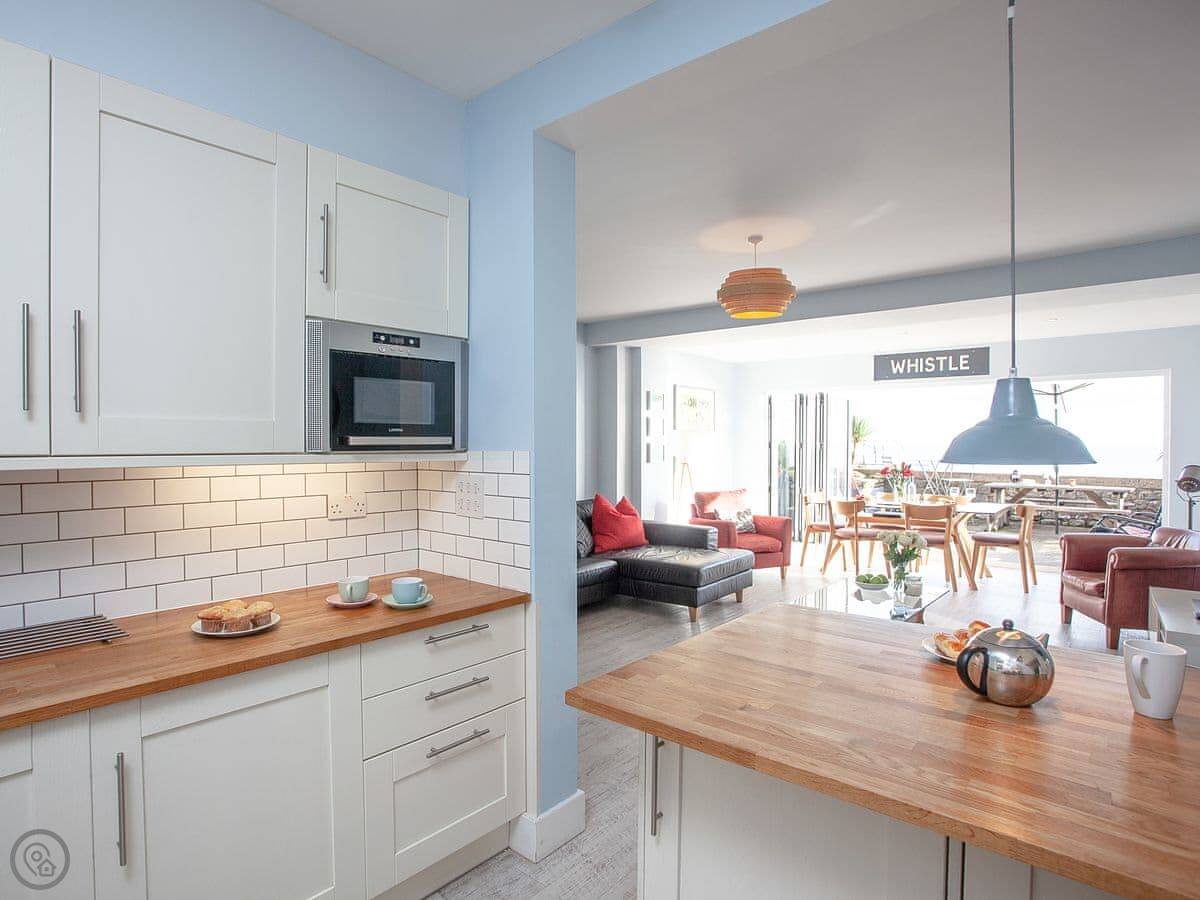 It sleeps six in three bedrooms. One bathroom. It's a 4 Star place, so it's well looked after and comfortable. The living area is open plan with a wood burner. Big bi-fold doors open onto the terrace so you can sit outside with that view.