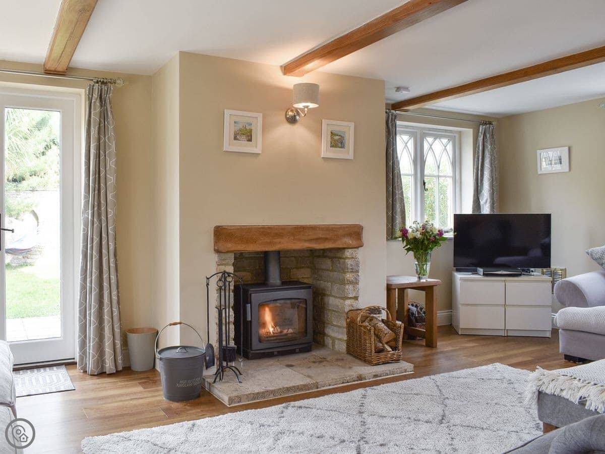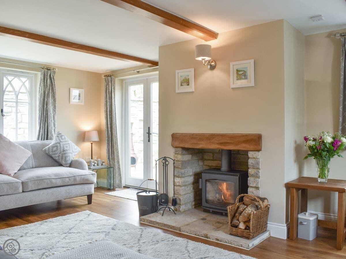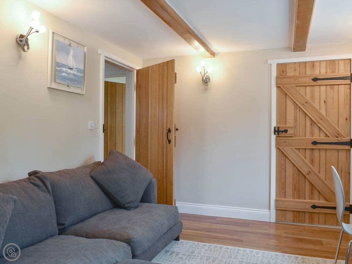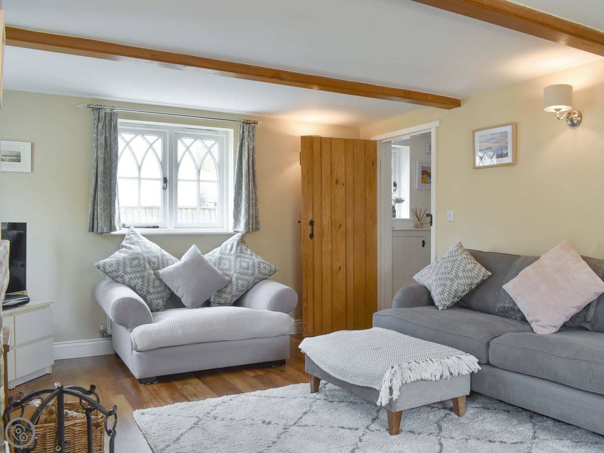The lounge has a wood burner. There's a separate second living area, which could be for kids or if you need to work. The kitchen is modern and big, with an island. The beams are exposed downstairs. The garden wraps around the cottage, it's enclosed and there's a patio.