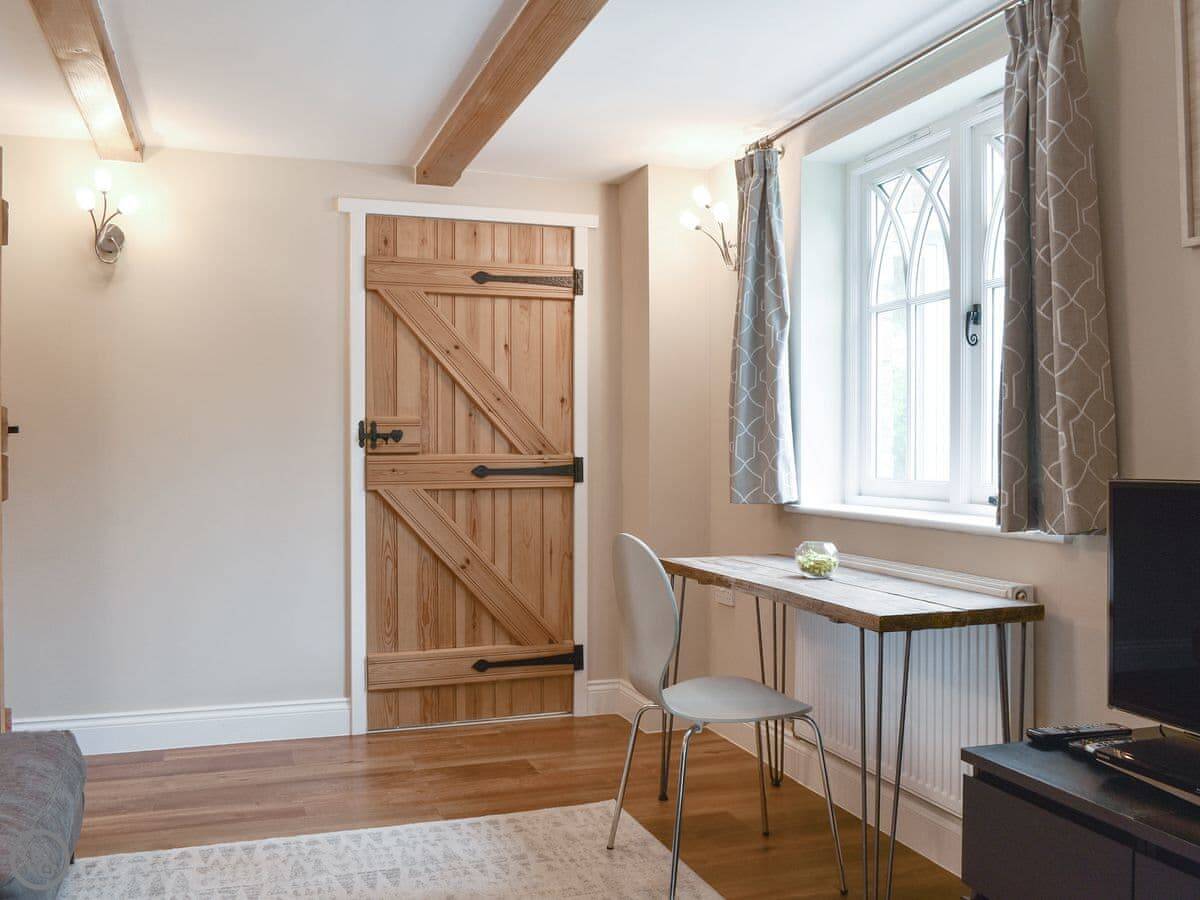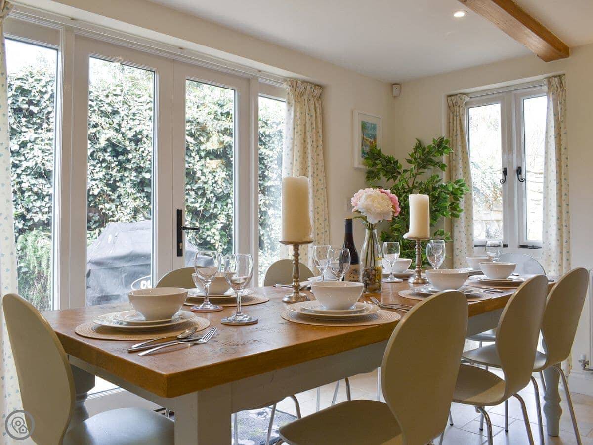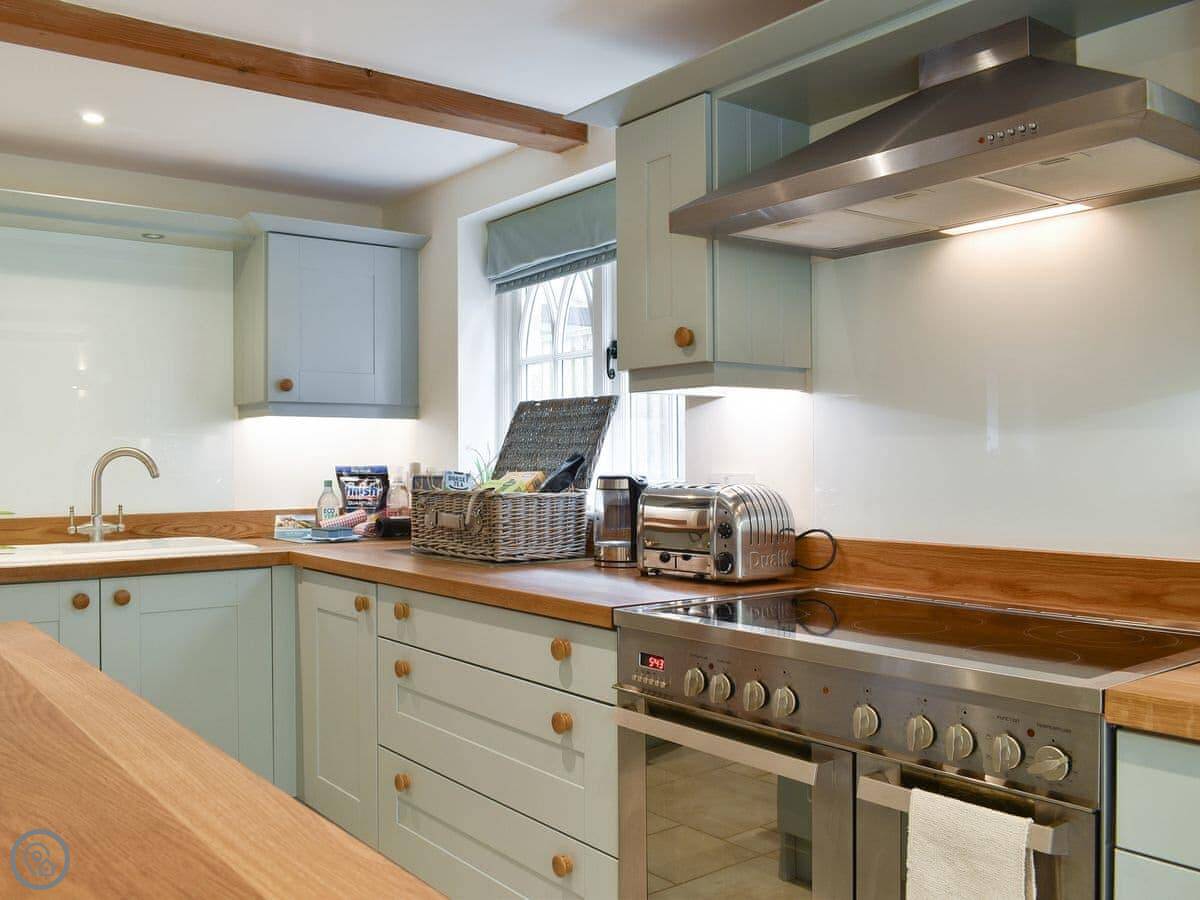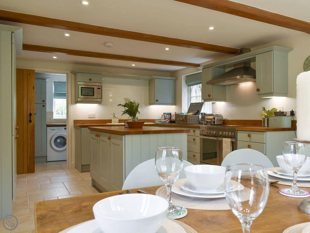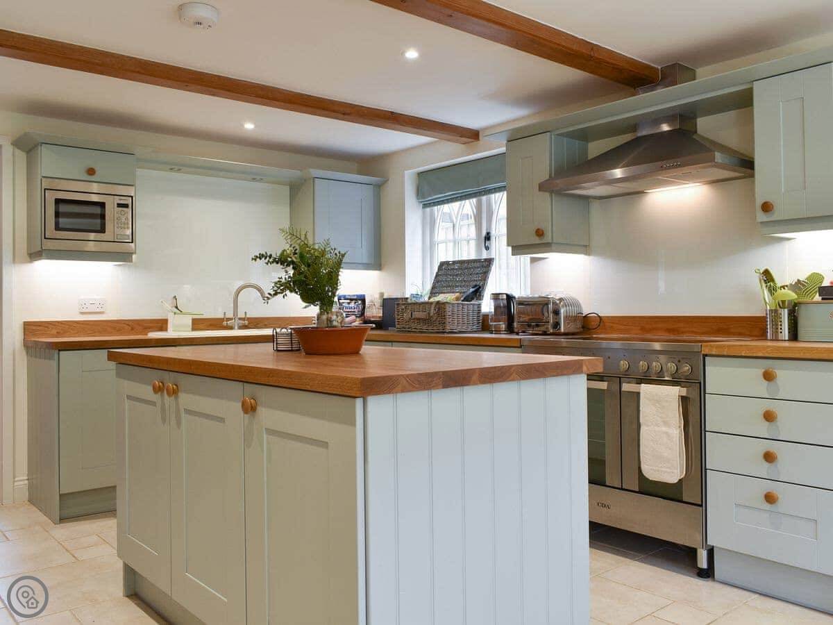The lounge has a wood burner. There's a separate second living area, which could be for kids or if you need to work. The kitchen is modern and big, with an island. The beams are exposed downstairs. The garden wraps around the cottage, it's enclosed and there's a patio.