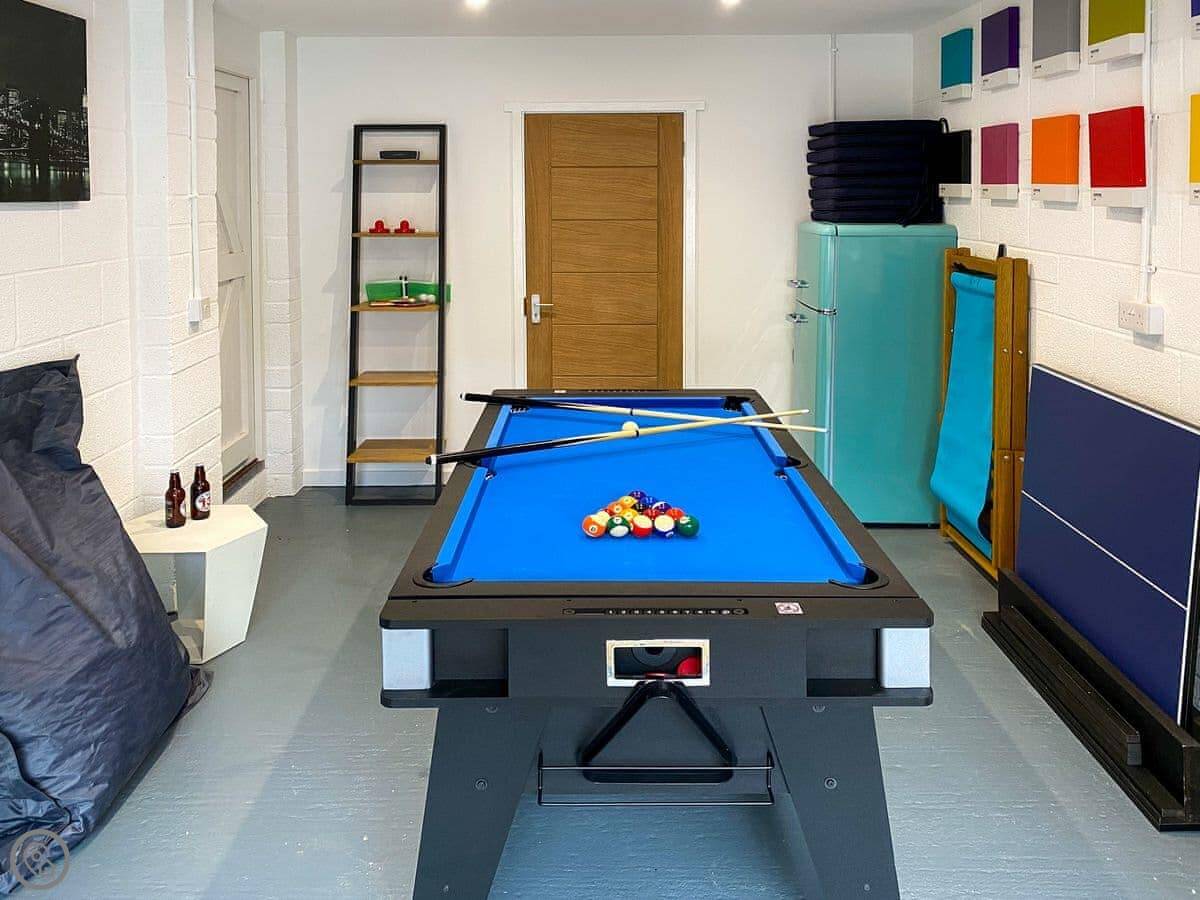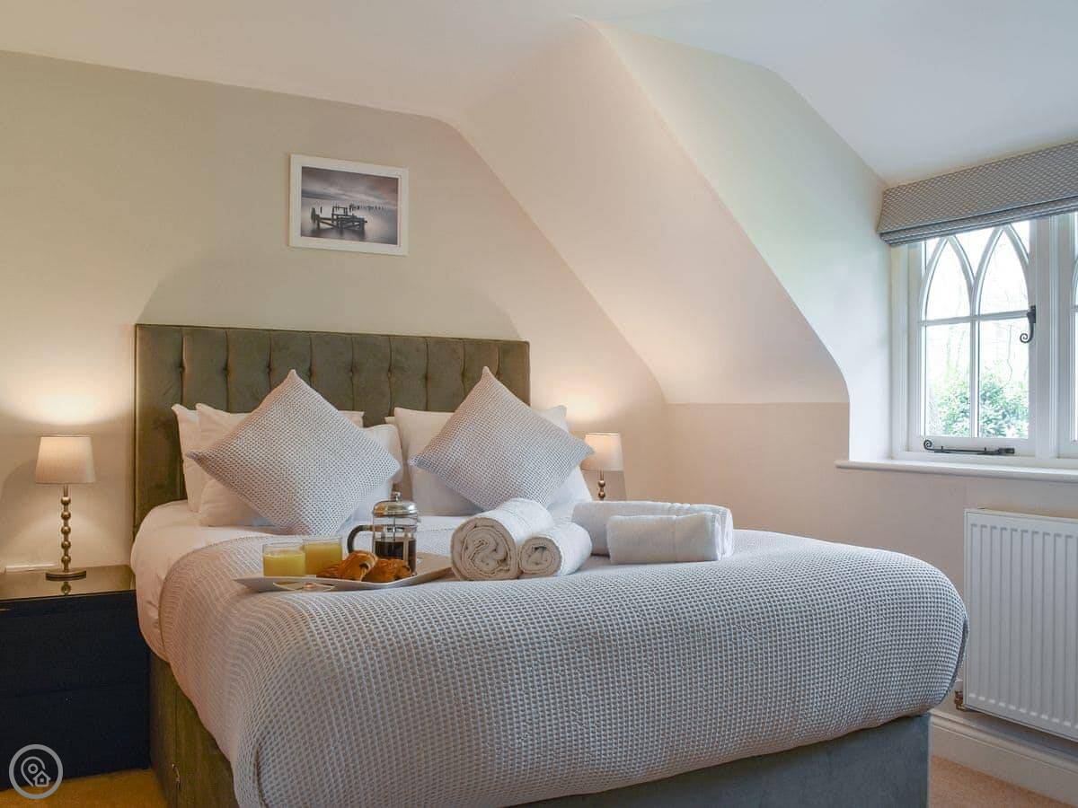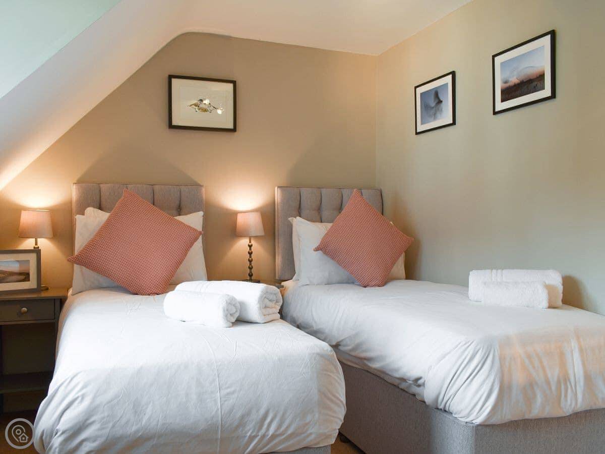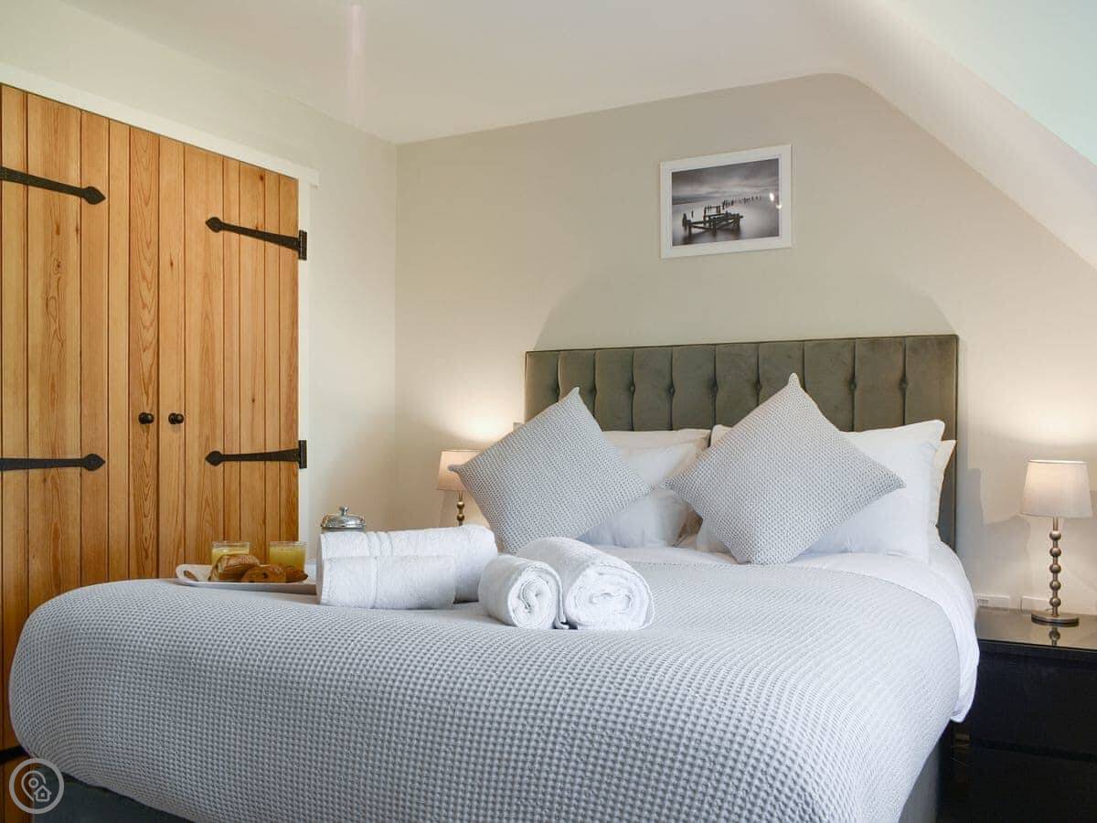 The lounge has a wood burner. There's a separate second living area, which could be for kids or if you need to work. The kitchen is modern and big, with an island. The beams are exposed downstairs. The garden wraps around the cottage, it's enclosed and there's a patio.